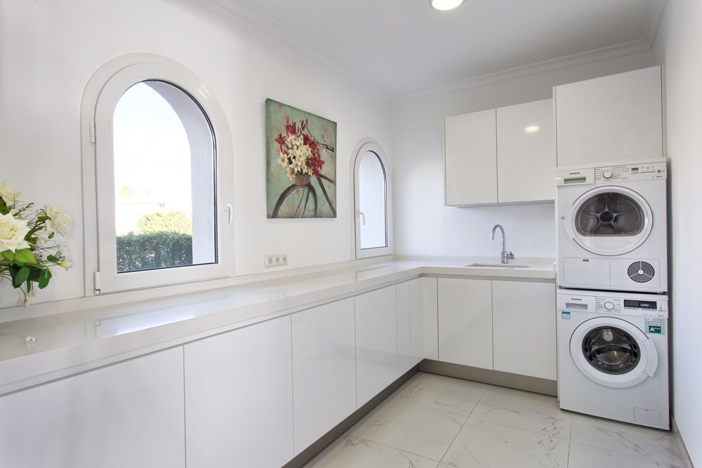 Entré, entre, stor stue med direkte adgang til overdækkede og åbne terrasser, separat spiseplads, åbent plan i moderne stil køkken (Santos) med morgenmadshjørne, vaske- / vaskerum (Siemens og AEG apparater), soveværelse med eget badeværelse .