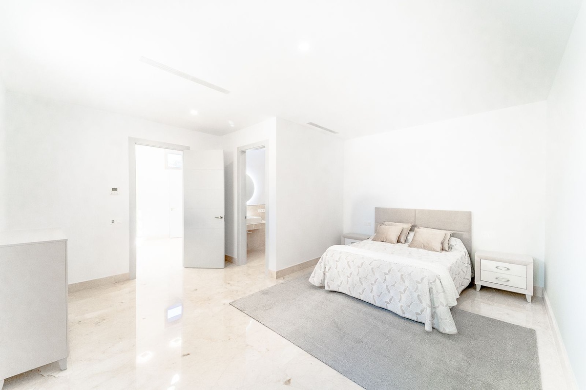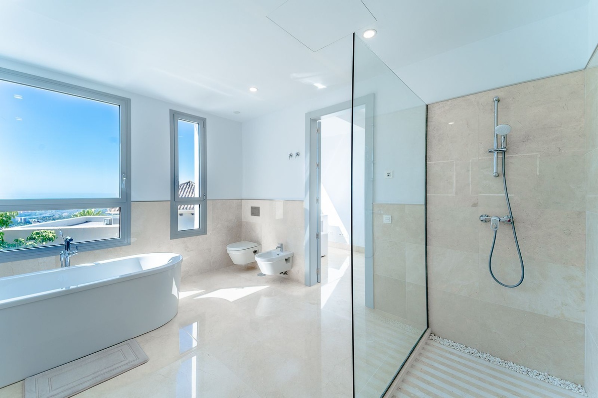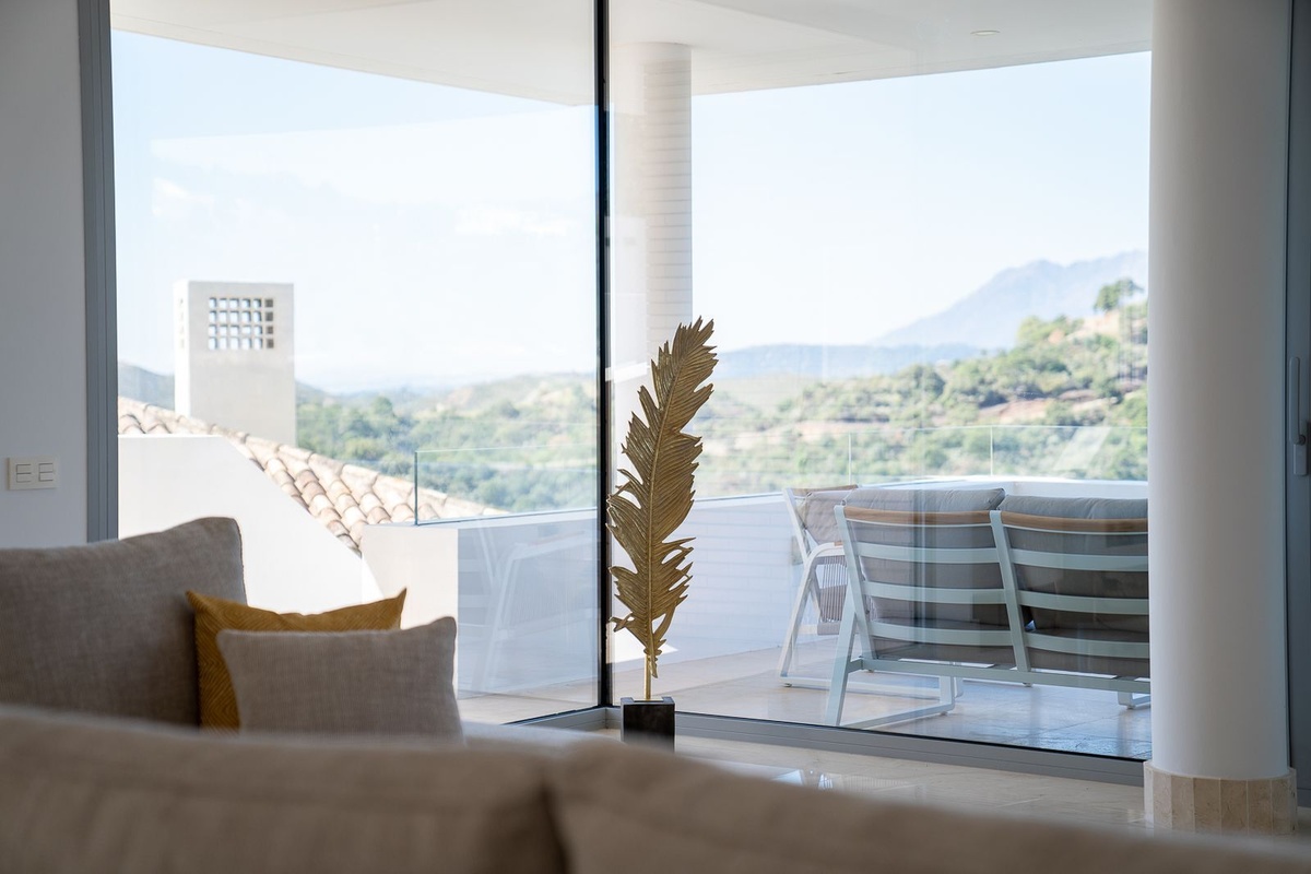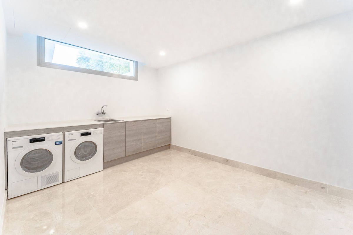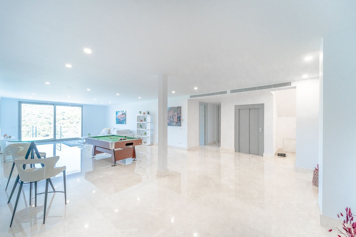 Newly built contemporary villa, finished on two floors plus basement, plus roof top, accessible by stairs and elevator. It is located in a natural environment, surrounded by golf and mountain, providing nice open views to those, panoramic sea view from the solarium and good sea view from some areas of the house. It is prepared to install amenities such as gym, spa area, cinema room and a wine room. It is a very spacious property, built with top quality materials, such as natural stone and Travertino marble floors. A very nice area with 24h security and a club house that offers an 18 holes golf course designed by Severiano Ballesteros, a tennis club, a bowling alley, restaurants, shops and a gym.