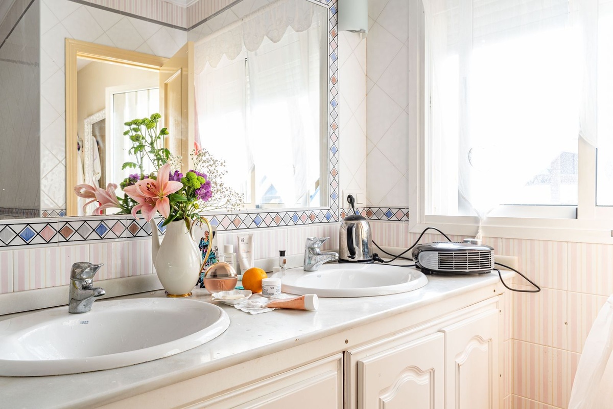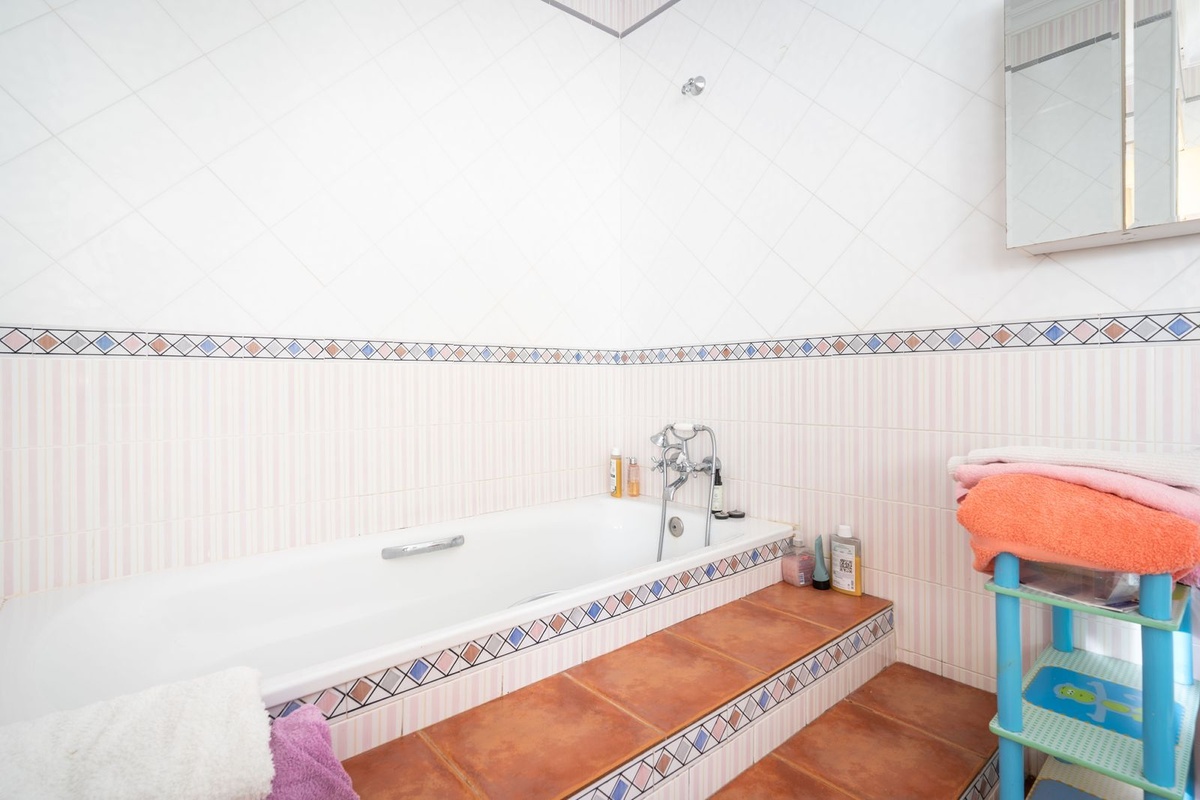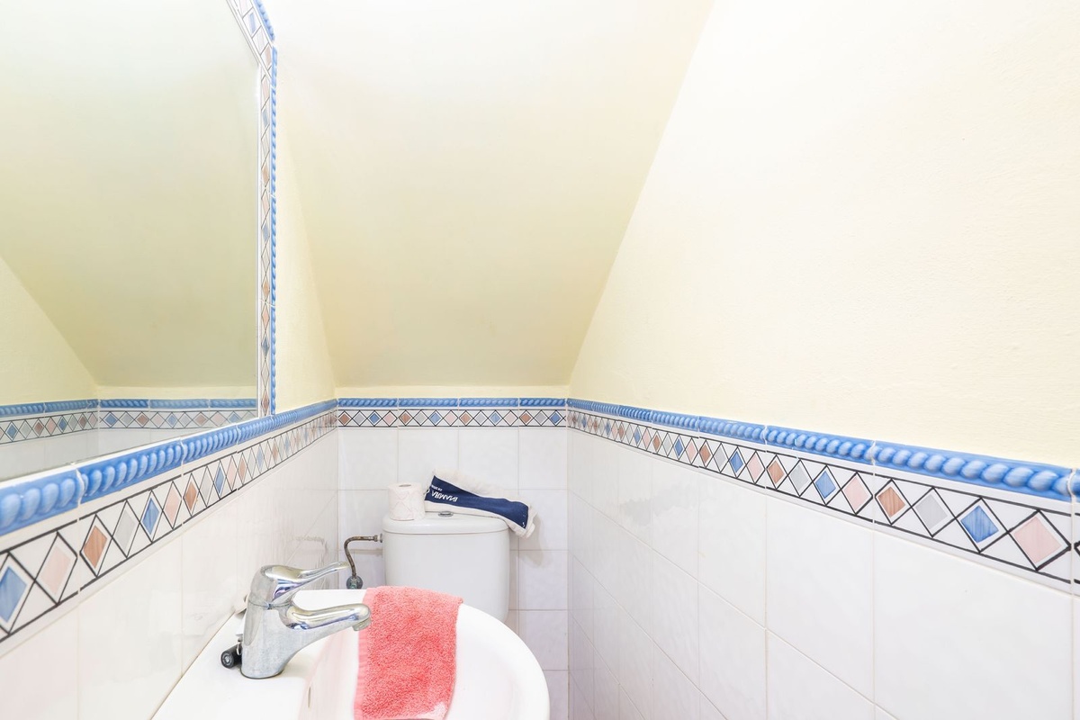 Huset har 3-værelses og 1 komplet familiebadeværelse med badekar og toilet. Et af værelserne har udgang til en terrasse med bjerge og byudsigt.