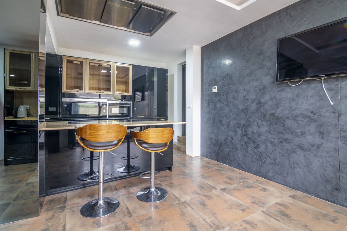 The kitchen is separate and equipped with all the necessary amenities. It also offers direct access to the garage, which has space for two cars, providing convenient and secure access.