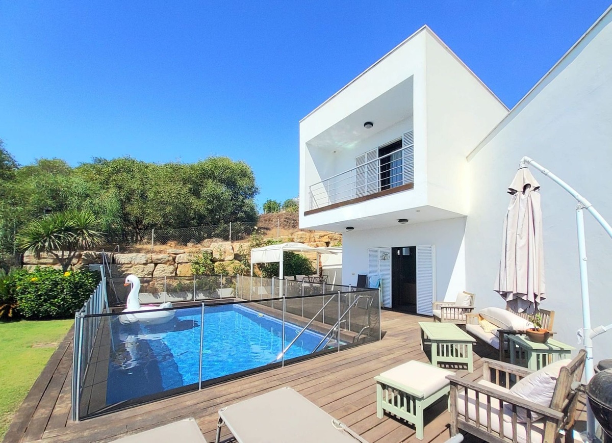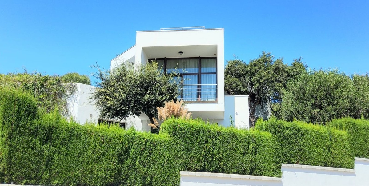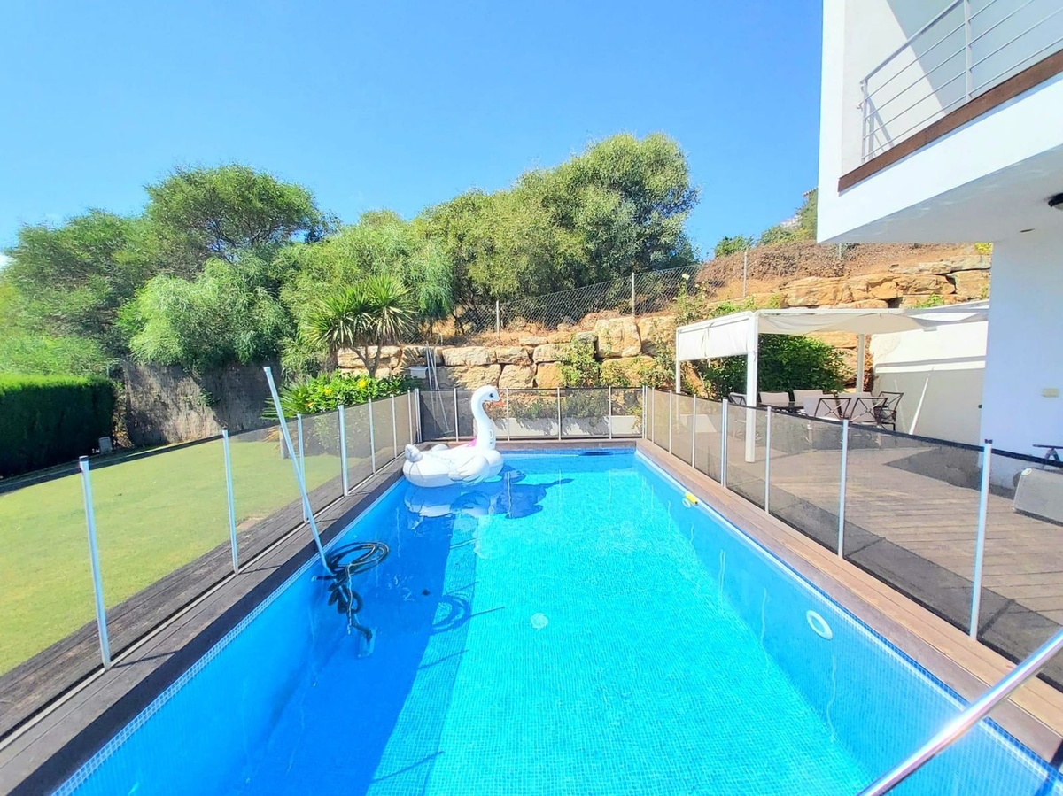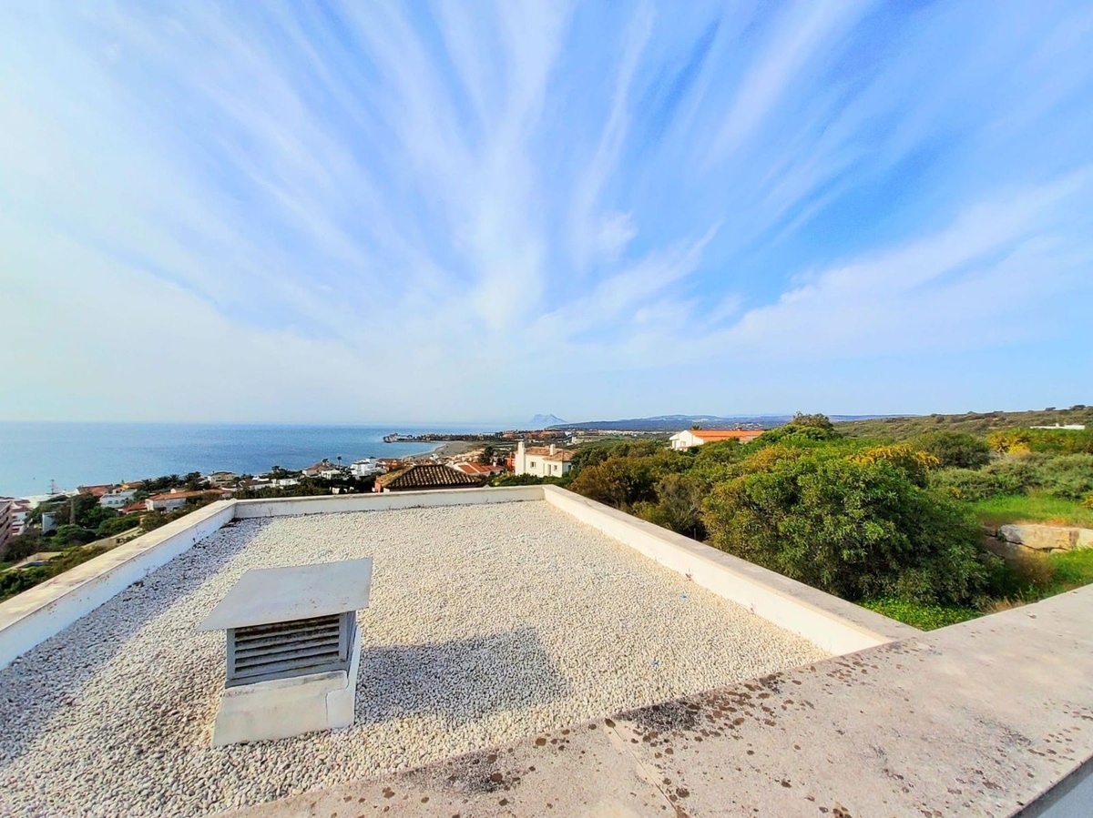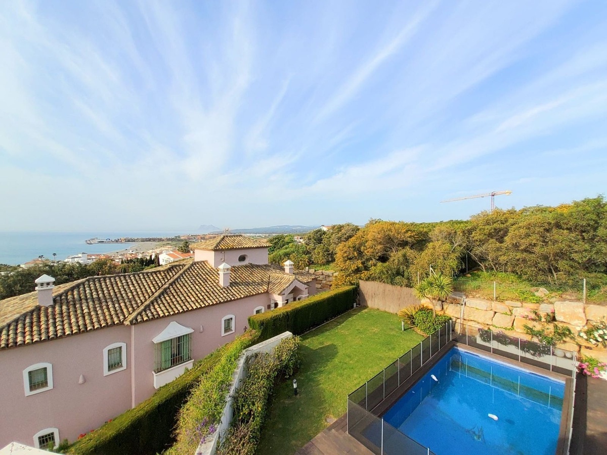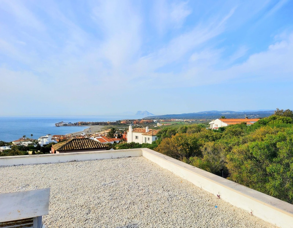 VIDUNDERLIG VILLA I MODERNE STIL MED HAVE, PRIVAT POOL OG SMUK UDSIGT OVER HAVET, GIBRALTAR OG AFRIKA. Med en privilegeret beliggenhed i et luksuriøst boligområde i Torreguadiaro, KUN 5 MIN GANG FRA STRANDEN og promenaden, som fører dig til den berømte havn i Sotogrande, hvor du finder et stort udvalg af barer, restauranter og fritidsområder. Prestigefyldte polobaner som Ayala eller golfbaner som Valderrama ligger 4 km væk, Gibraltar lufthavn ligger 10 km væk, og Marbella ligger 30 km væk. Denne smukke ejendom er fordelt på tre etager, bygget med materialer af højeste kvalitet og fremragende finish. Nyd godt lys takket være de store vinduer i hele huset og dets SYDLIGE ORIENTERING. På første sal finder vi den rummelige stue-spisestue med et integreret køkken, alt sammen i en åben planløsning, meget behagelig og ryddelig. På øverste etage ligger værelserne, hvoraf det storslåede soveværelse har et elfenbensfarvet marmorbadeværelse med jacuzzi. Alle værelser er udstyret med specialfremstillede skabe i hvidlakeret træ, en minimalistisk og velordnet følelse, som går igen i hele villaens design.
