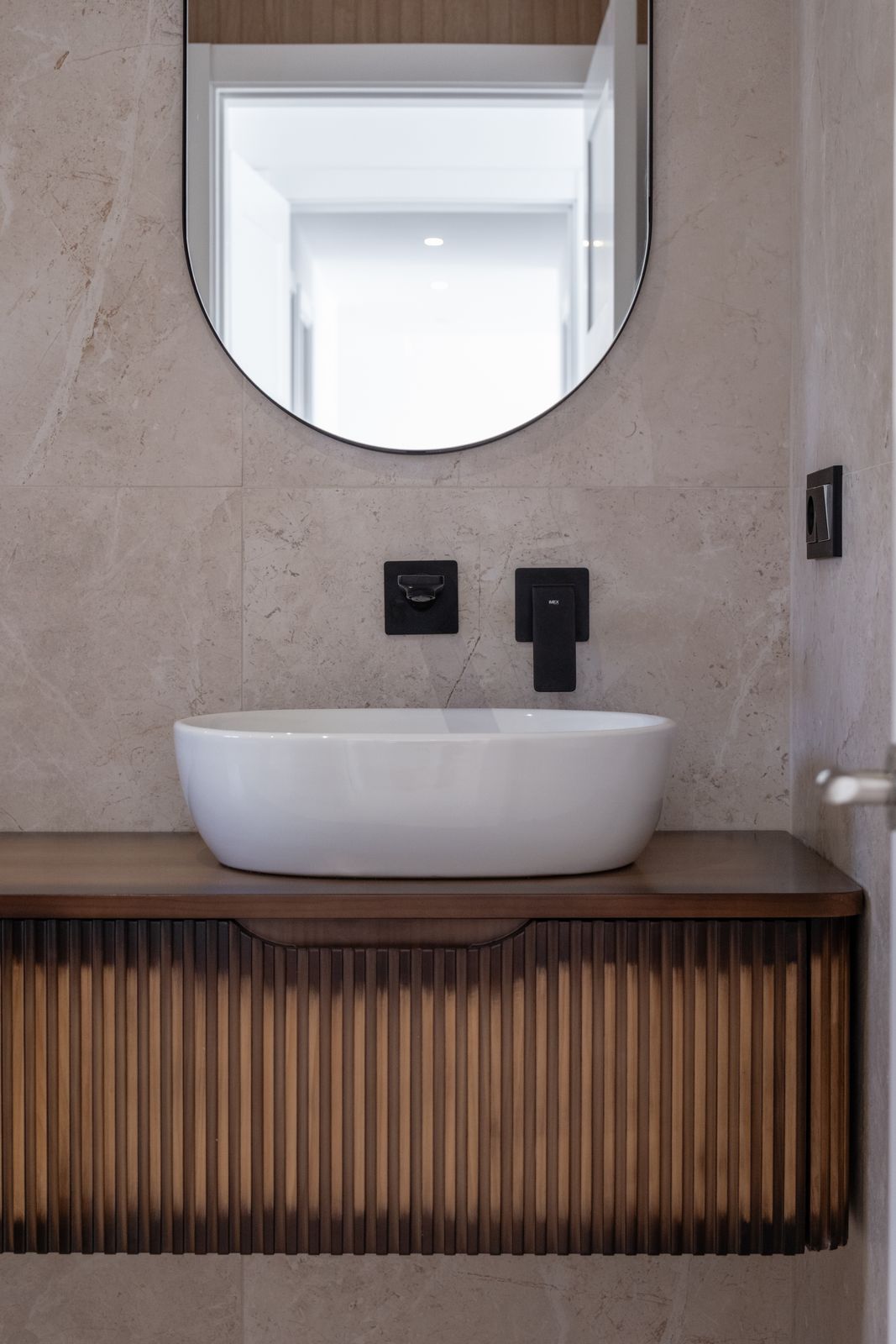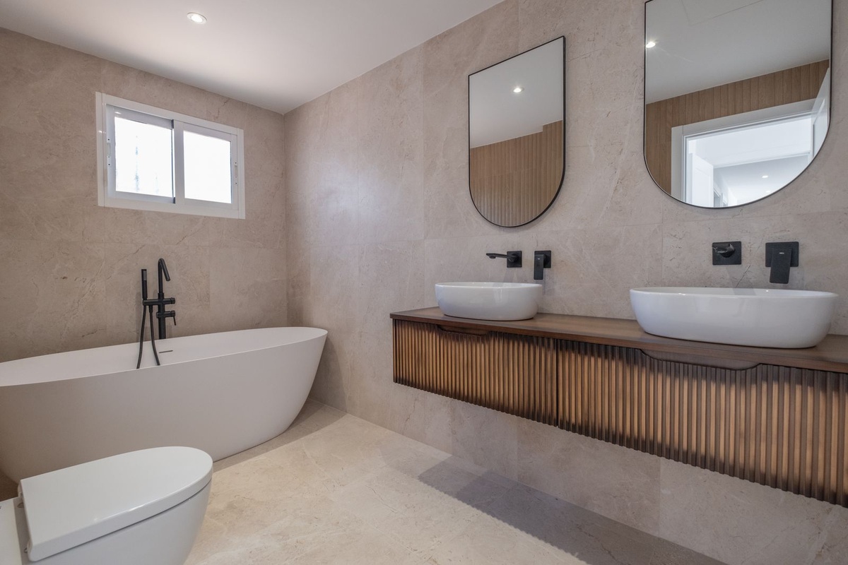 Lejligheden har tre rummelige soveværelser-to med direkte terrasseadgang og en tredjedel på den modsatte side for ekstra privatliv-sammen med to elegante badeværelser, det ene med et afslappende badekar og det andet med et moderne walk-in-brusebad.