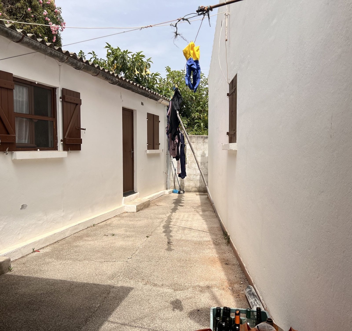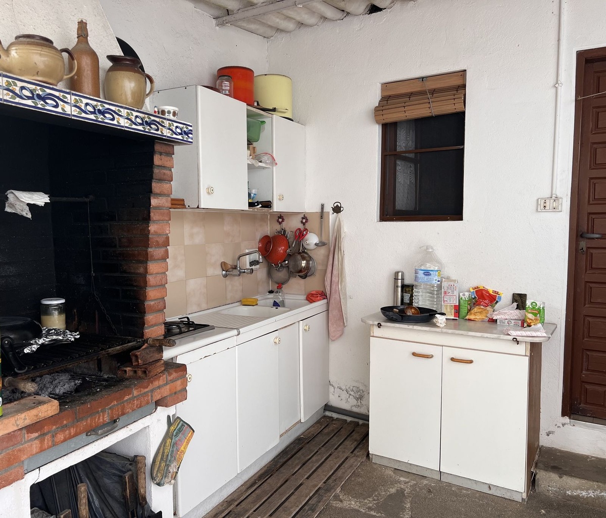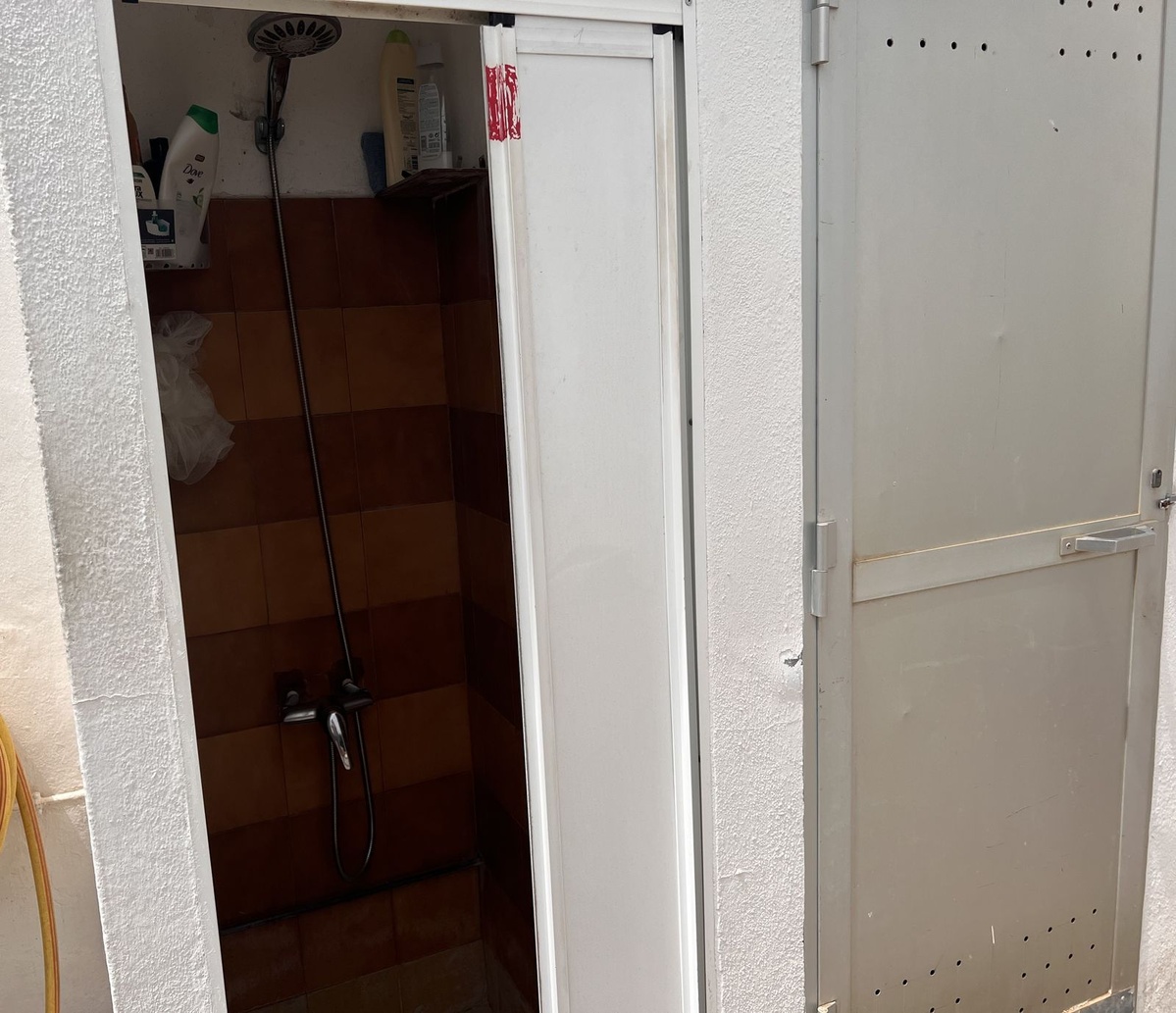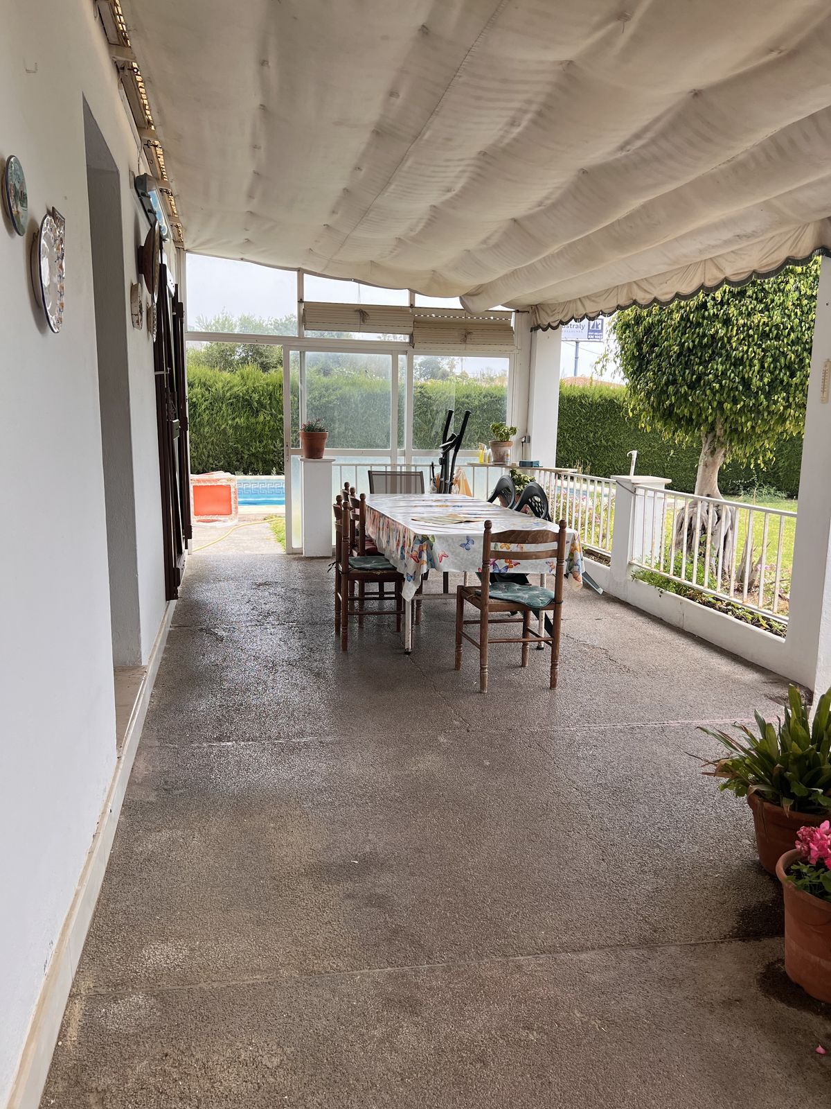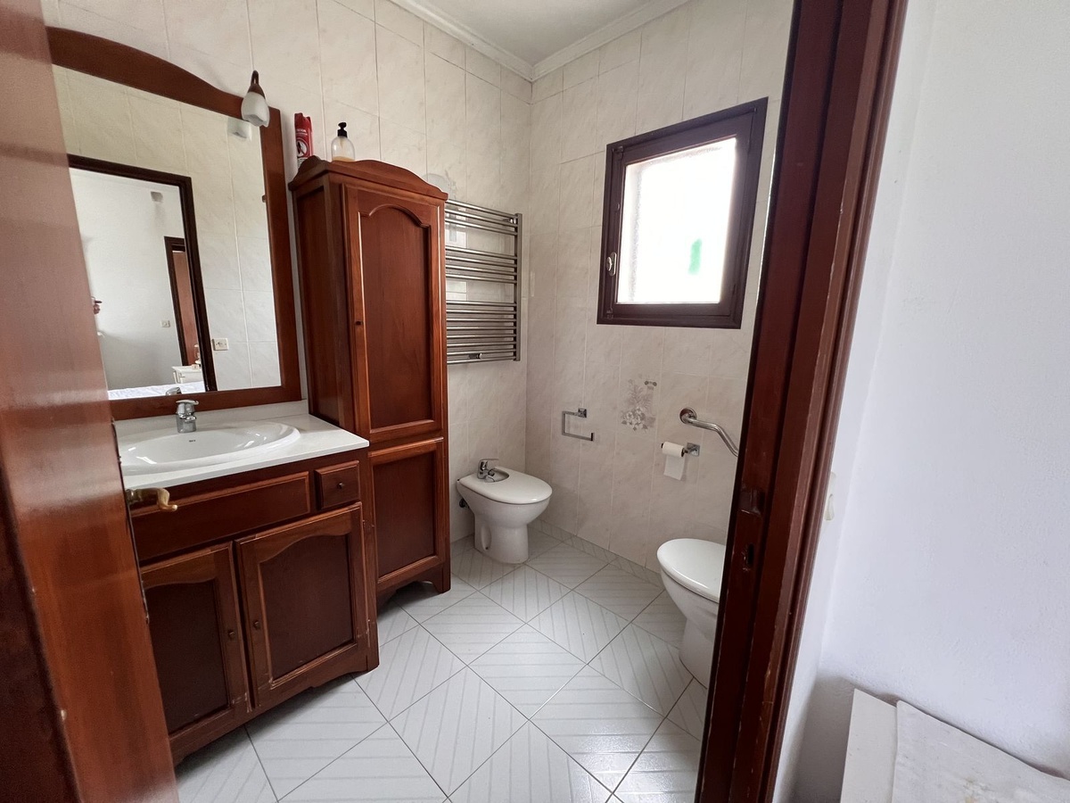 Grunden er flad, og når vi kommer ind, finder vi garagen, og når vi følger vejen, kommer vi til hovedhusets veranda, grillplads og yderligere tre værelser, der i øjeblikket bruges som soveværelser med et badeværelse. Verandaen er overdækket og giver adgang til indgangen til huset. Hovedhuset er fordelt på en stue-spisestue ved siden af køkkenet med tre store soveværelser og to badeværelser, hvoraf det ene har eget bad. Ved siden af verandaen finder vi grillområdet, der fører til det område, hvor de tre soveværelser med badeværelse ligger. På højre side af hovedhuset ligger swimmingpoolen med brusebad og toilet. Der er også et stort opbevaringsrum i dette område.
