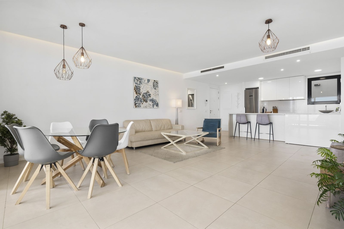 Forestil dig at eje en fantastisk, fuldt møbleret 3-værelses lejlighed kun 500 meter fra stranden i det eksklusive Reserva del Higueron-samfund. Denne ejendom tilbyder ikke bare et hjem, men også en luksuriøs livsstil med panoramaudsigt over havet og nem adgang til strandbarer, restauranter og butikker—alt sammen inden for gåafstand.