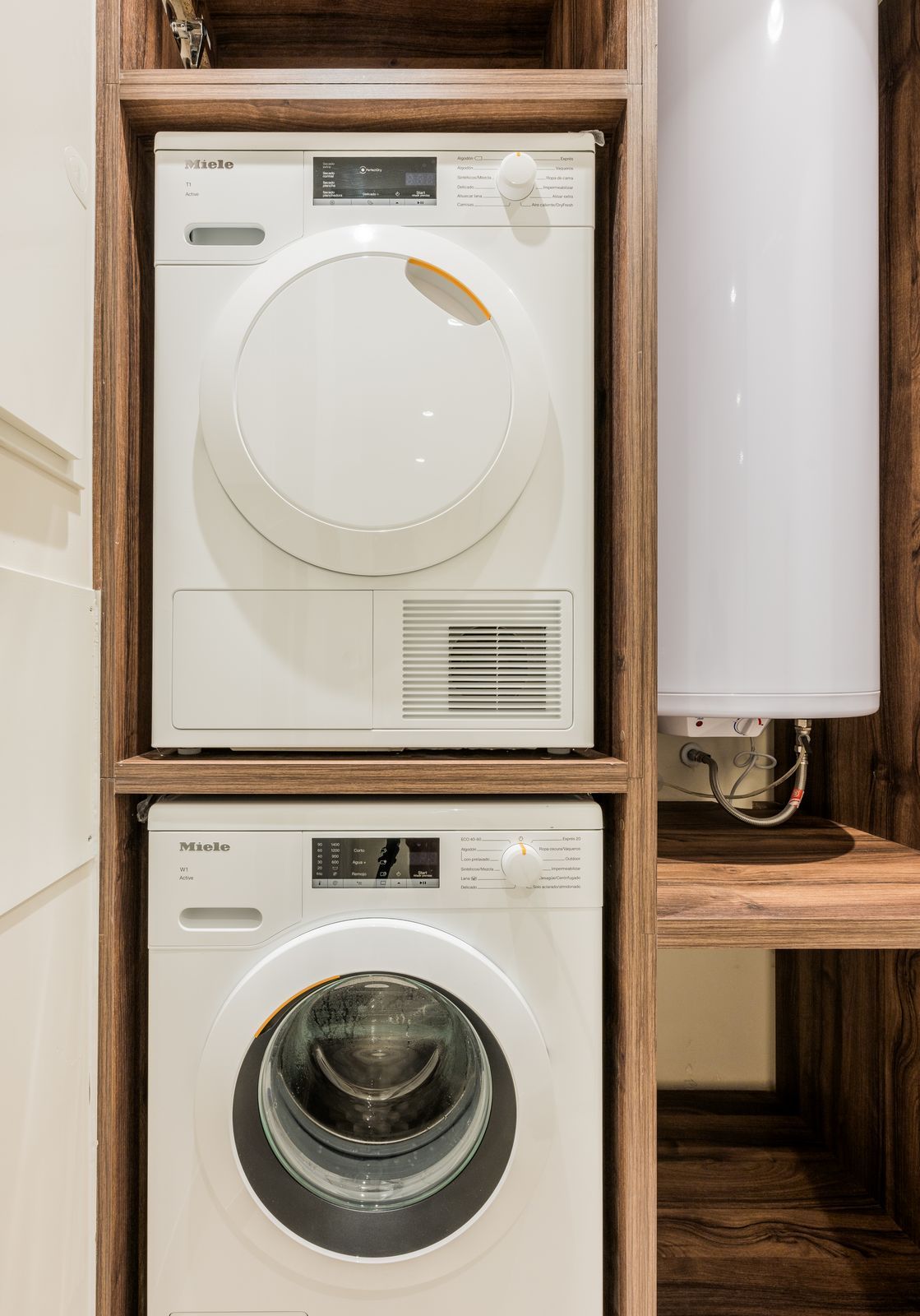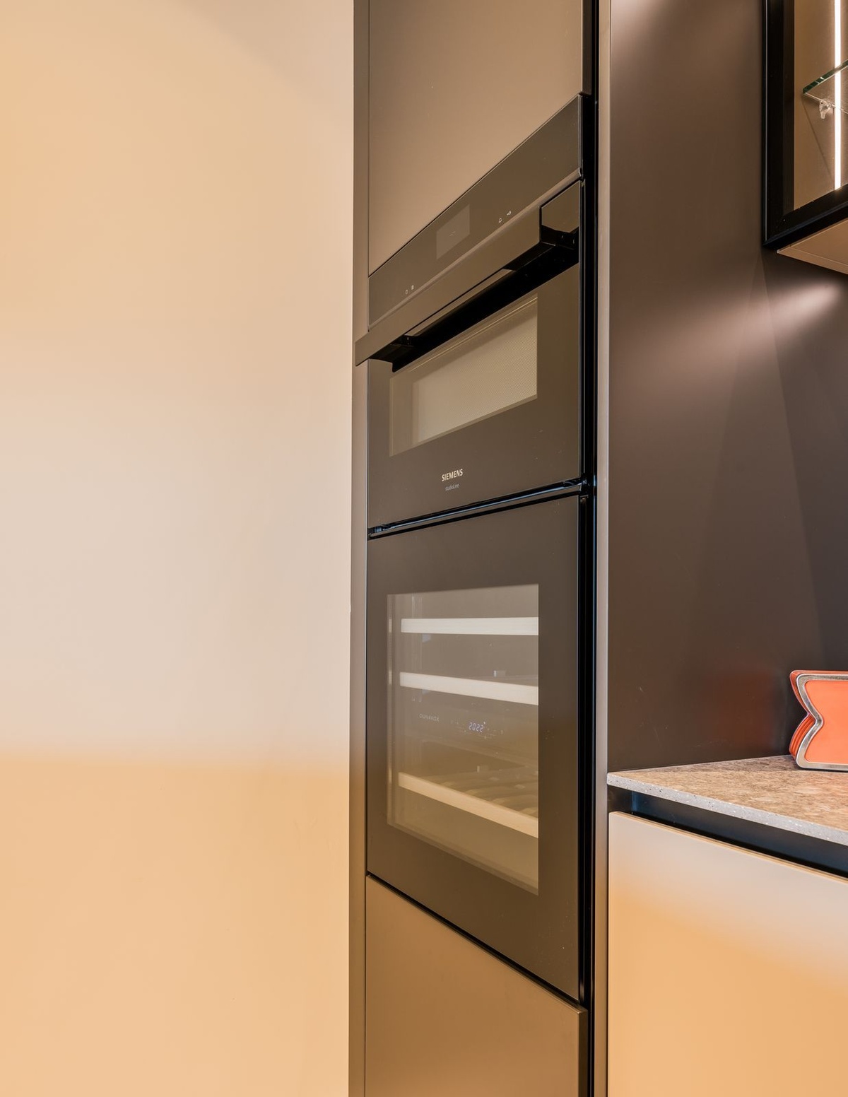 Det helt nye designkøkken er fuldt udstyret med førsteklasses Miele-apparater, sømløst integreret i det åbne opholdsrum.