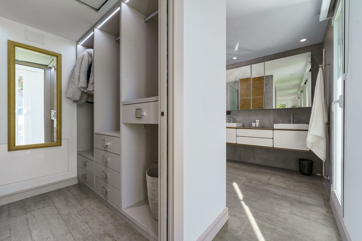 The exterior of the villa is equally captivating, with a heated saltwater swimming pool, a jacuzzi, an outdoor gym, and various landscaped garden areas. These spaces create a private oasis, ideal for soaking up the Mediterranean lifestyle.