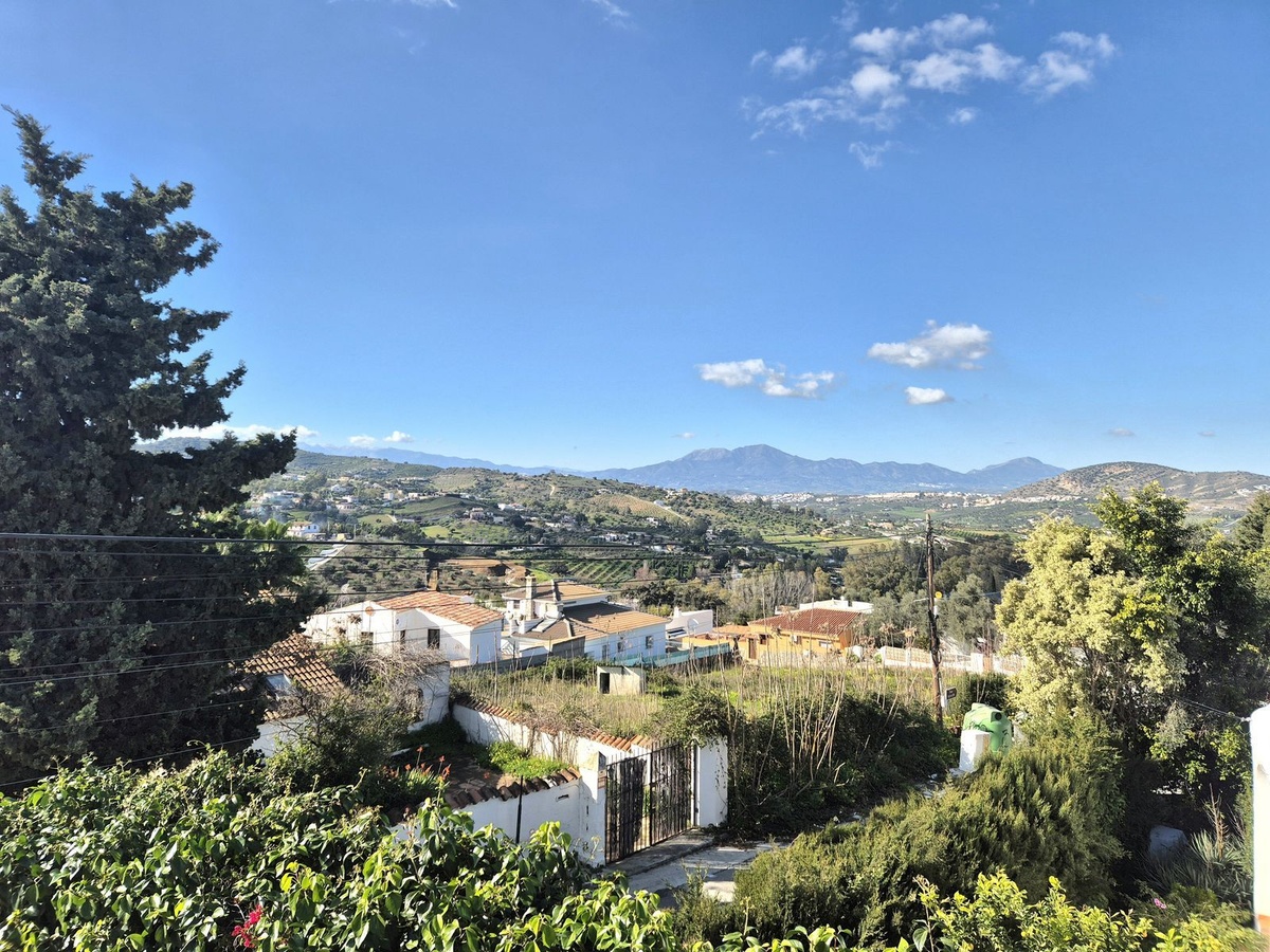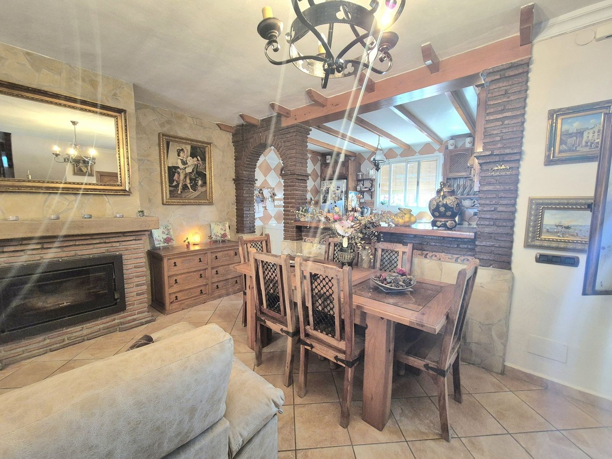 A good concrete road to arrive at the property with a large 2 car garage with storage space. Via a few steps you go up to the main entrance of the house where you will find a lovely sunny terrace with awnings that cover the whole area with pretty views to the town of Alhaurin el Grande, mountains and surrounds. Going into the property, you have to your left a downstairs toilet and under the stairs storage, and the open large living / dining room is to your right with a semi open fully fitted kitchen. The property has several nice features like a large wood burning fireplace, spanish style and air conditioning hot and cold. From here you can access by patio doors the back of the property. Also on the first floor is a large bedroom with ensuite bathroom with shower.