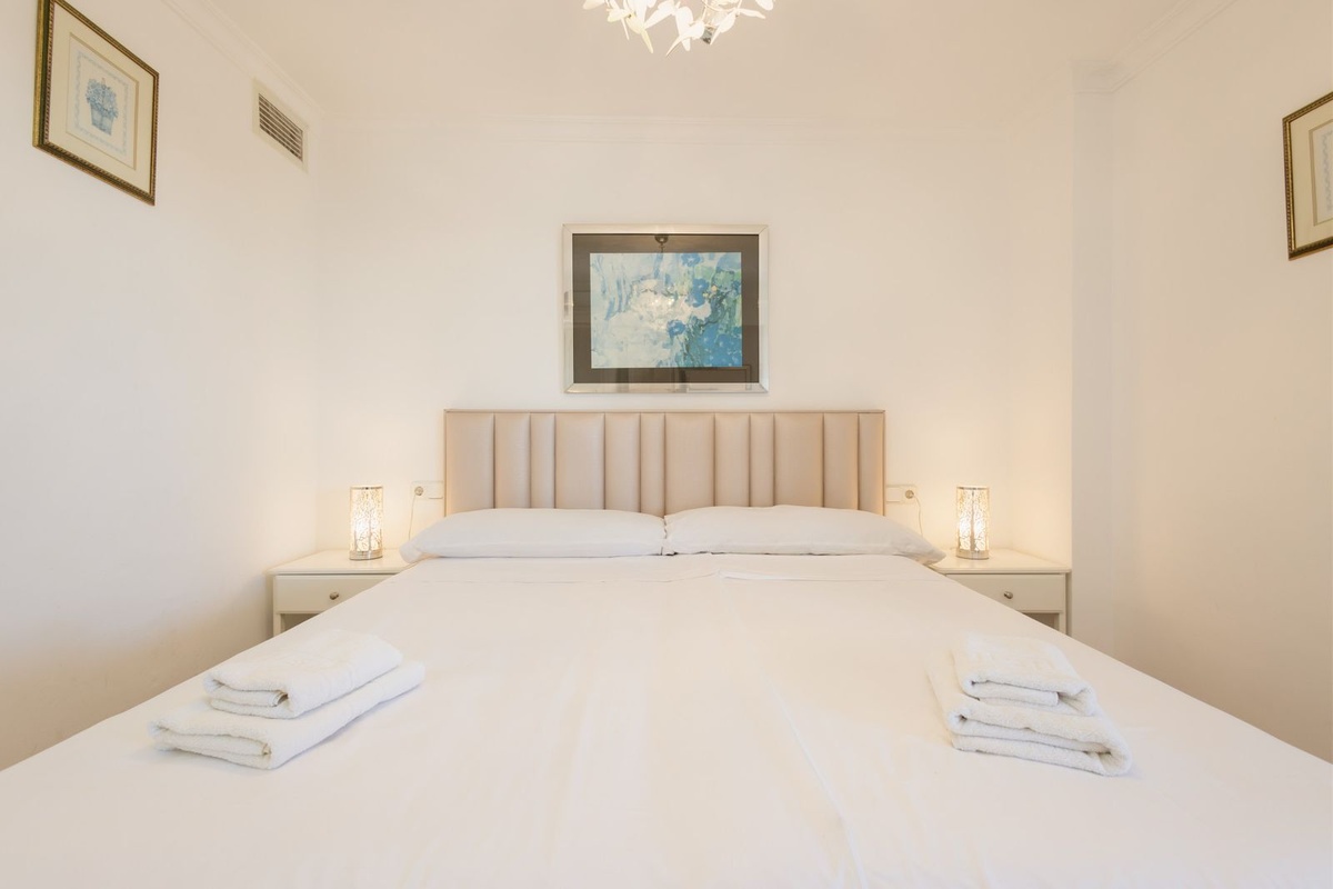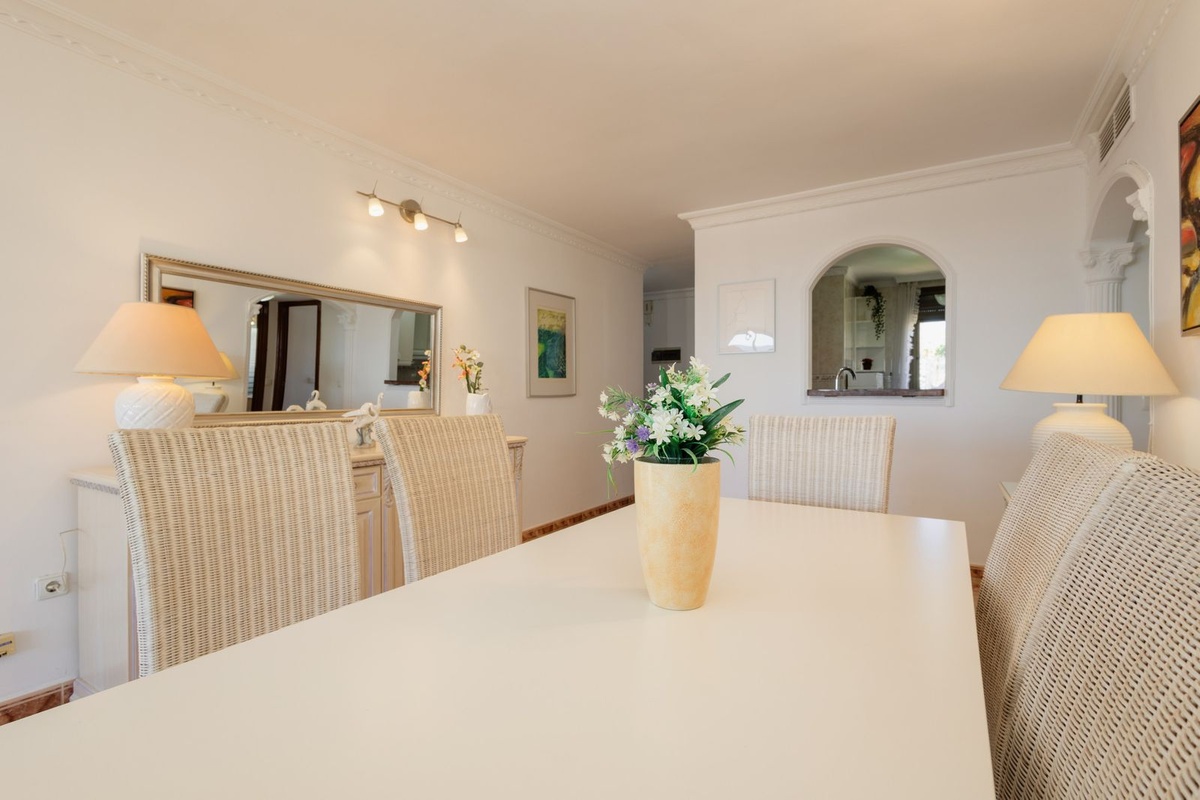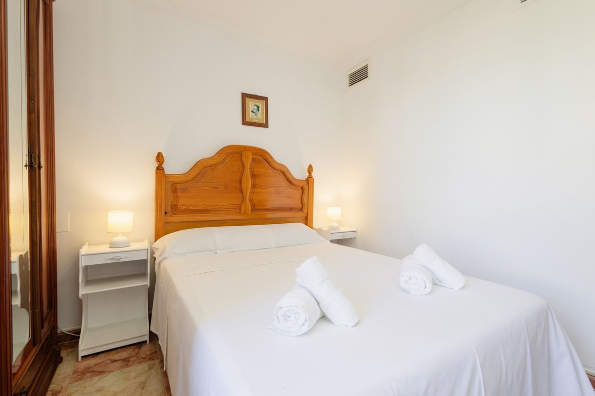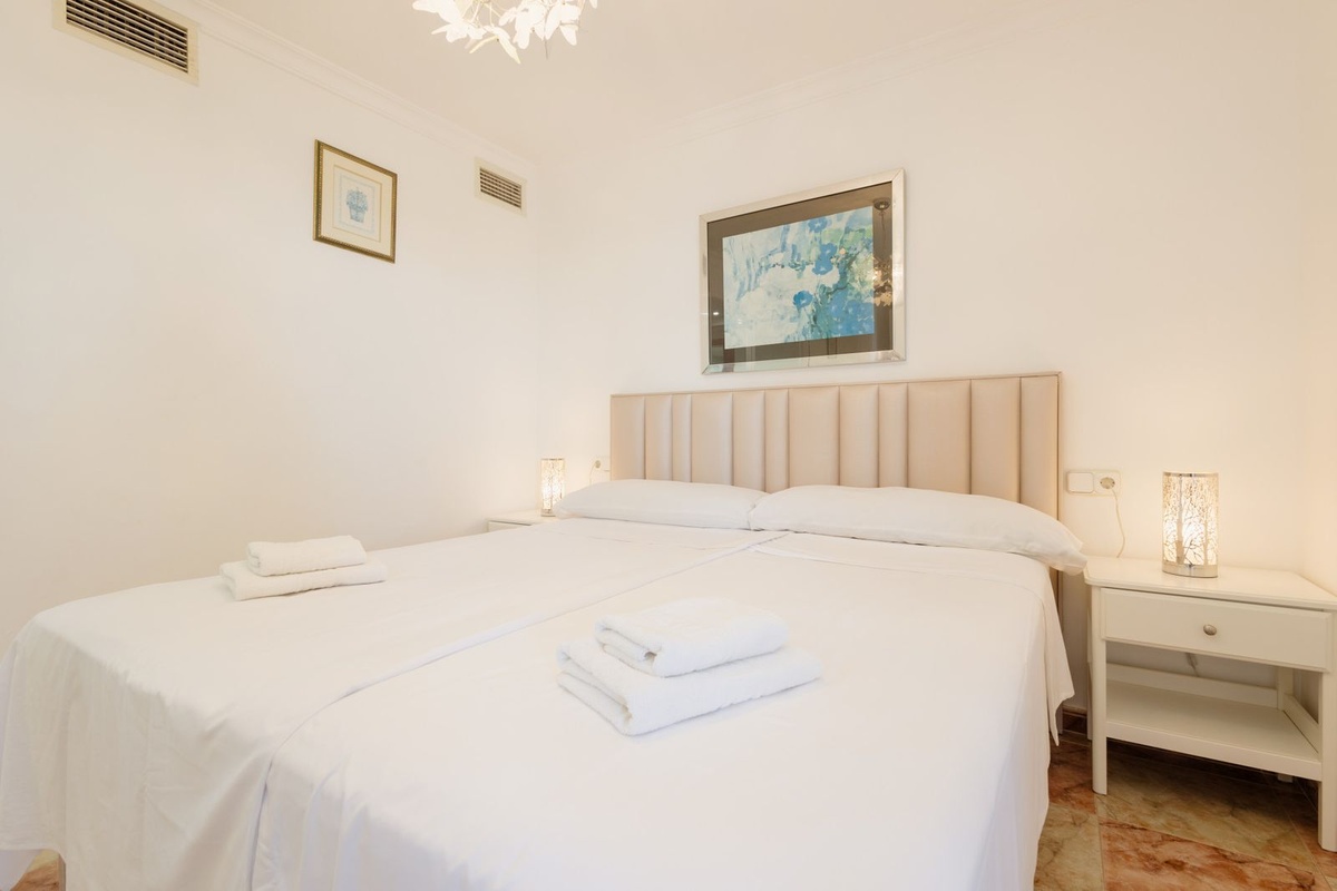 Fra det øjeblik, du træder ind, vil du blive betaget af den fantastiske panoramaudsigt over Middelhavet, som du kan nyde fra stuen og to af soveværelserne. Ejendommen har i alt tre soveværelser: en master bedroom suite med en Queen-seng og indbyggede skabe, et andet soveværelse også med en Queen-seng og et tredje soveværelse med to enkeltsenge, alle designet med din komfort i tankerne.