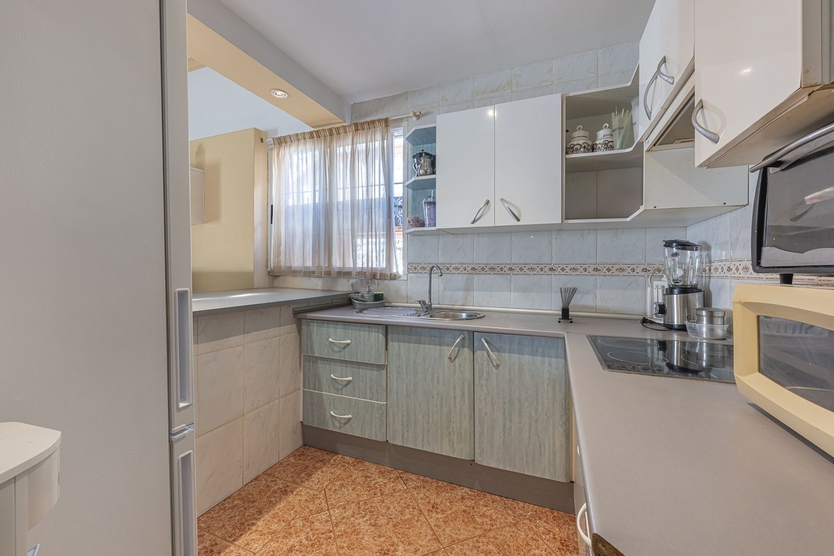 Køkkenet er uafhængigt og er integreret i stuen gennem en morgenmadsbar, der skaber en social og hyggelig atmosfære.