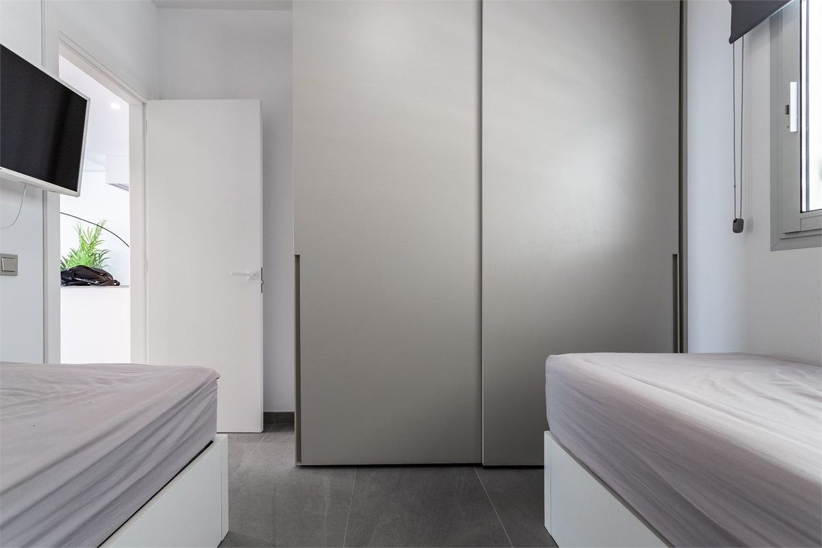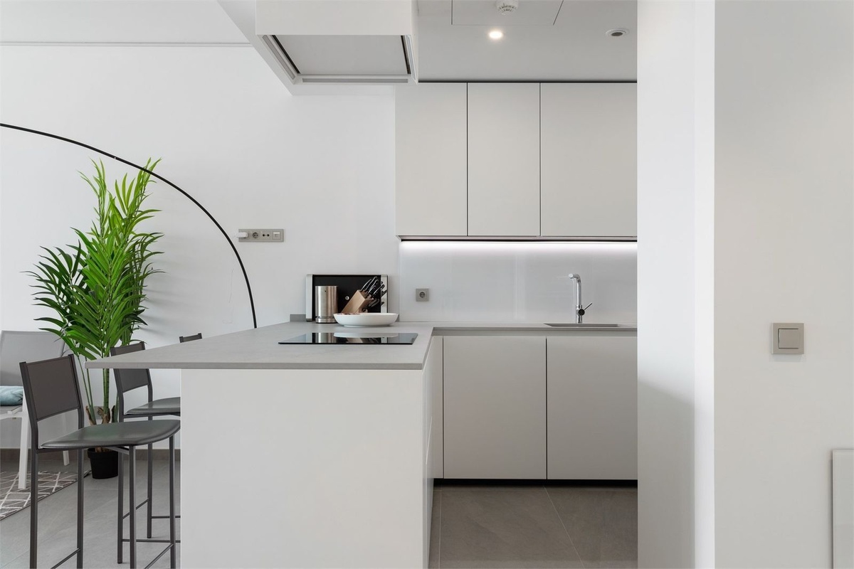 The property has a modern style and offers two bedrooms and two bathrooms, one of which is en-suite. The open kitchen and living room create a spacious and inviting atmosphere. Through the sliding doors, we access a southwest-facing terrace of 22 sqm with an impressive view of the Mediterranean Sea. Additionally, there is a rooftop terrace of 107 sqm with an installed jacuzzi, perfect for relaxation.