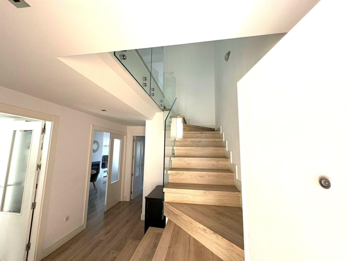 Upon entering, you’re welcomed by a spacious and bright foyer featuring a modern staircase with a tempered glass railing, adding a contemporary touch to the home. The main floor offers a functional layout with a fully equipped kitchen, separate laundry room, a full bathroom, one bedroom, and a spacious living-dining area with direct access to a generous terrace. From here, you can enjoy breathtaking open views of the Bay of Málaga — a true daily luxury.