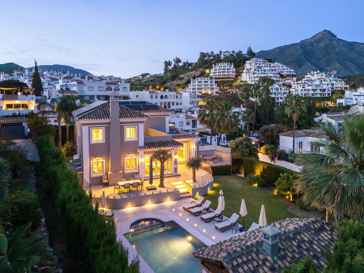 This impressive luxury villa, exclusively available through our sole agency, is situated in the desirable neighbourhood of Nueva Andalucia. Boasting a substantial built area of 510m² on the best Plot with a generous 1,200m² very high privacy factor , the property offers six spacious bedrooms, five bathrooms (four en-suite), and an additional guest toilet, designed to accommodate the highest standards of modern HIGH Quality family living.