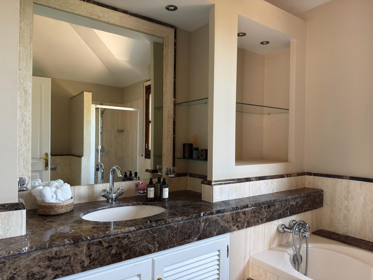 The villa features five elegant and spacious bedrooms, each with its own en-suite bathroom, ensuring maximum comfort and privacy for guests. The interior boasts large, light-filled living spaces, including a stylish and inviting living room, a fully equipped modern kitchen, and high-end finishes throughout. Designed for both relaxation and entertaining, this property offers the ultimate in sophisticated Mediterranean living.