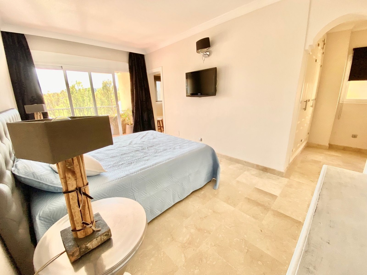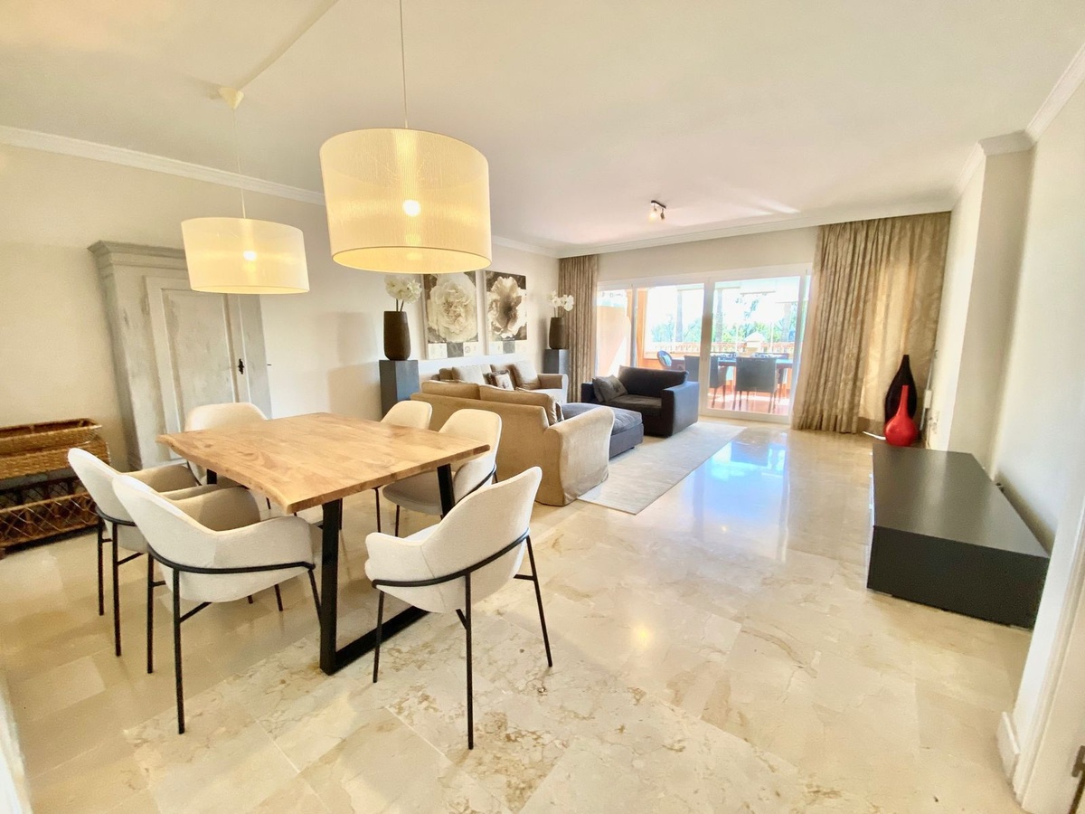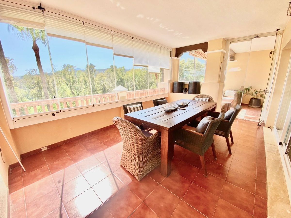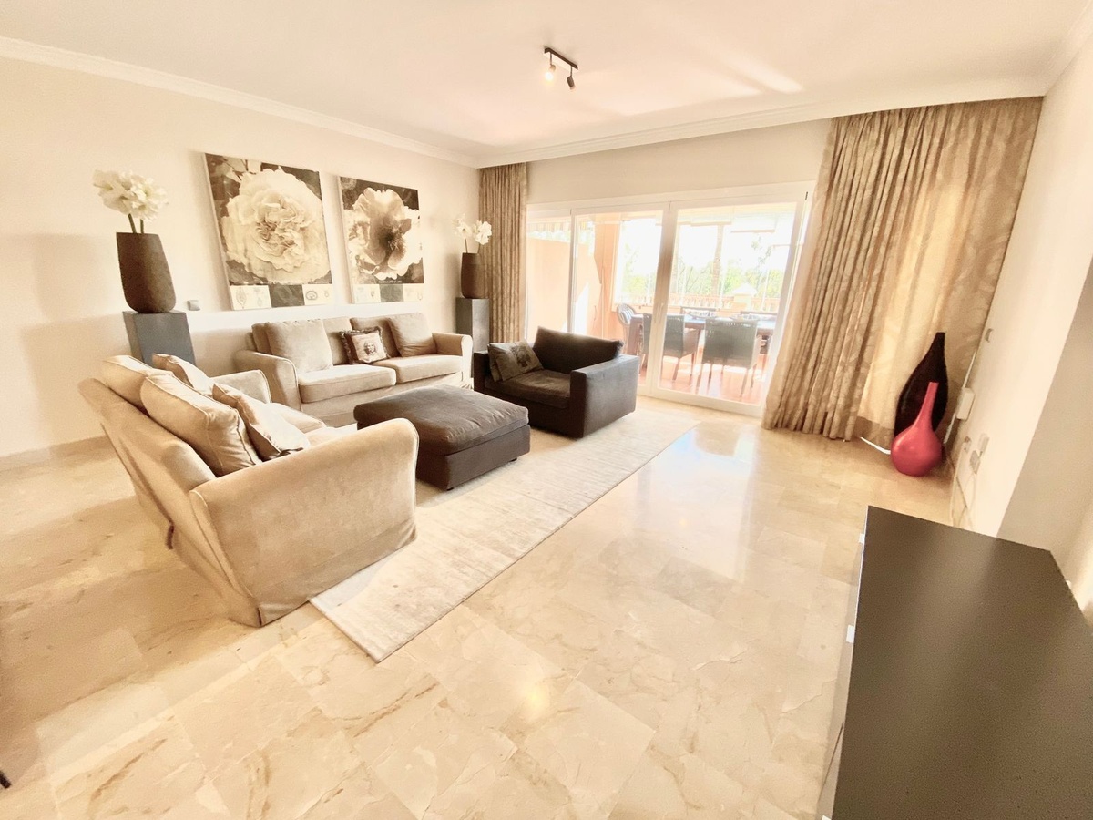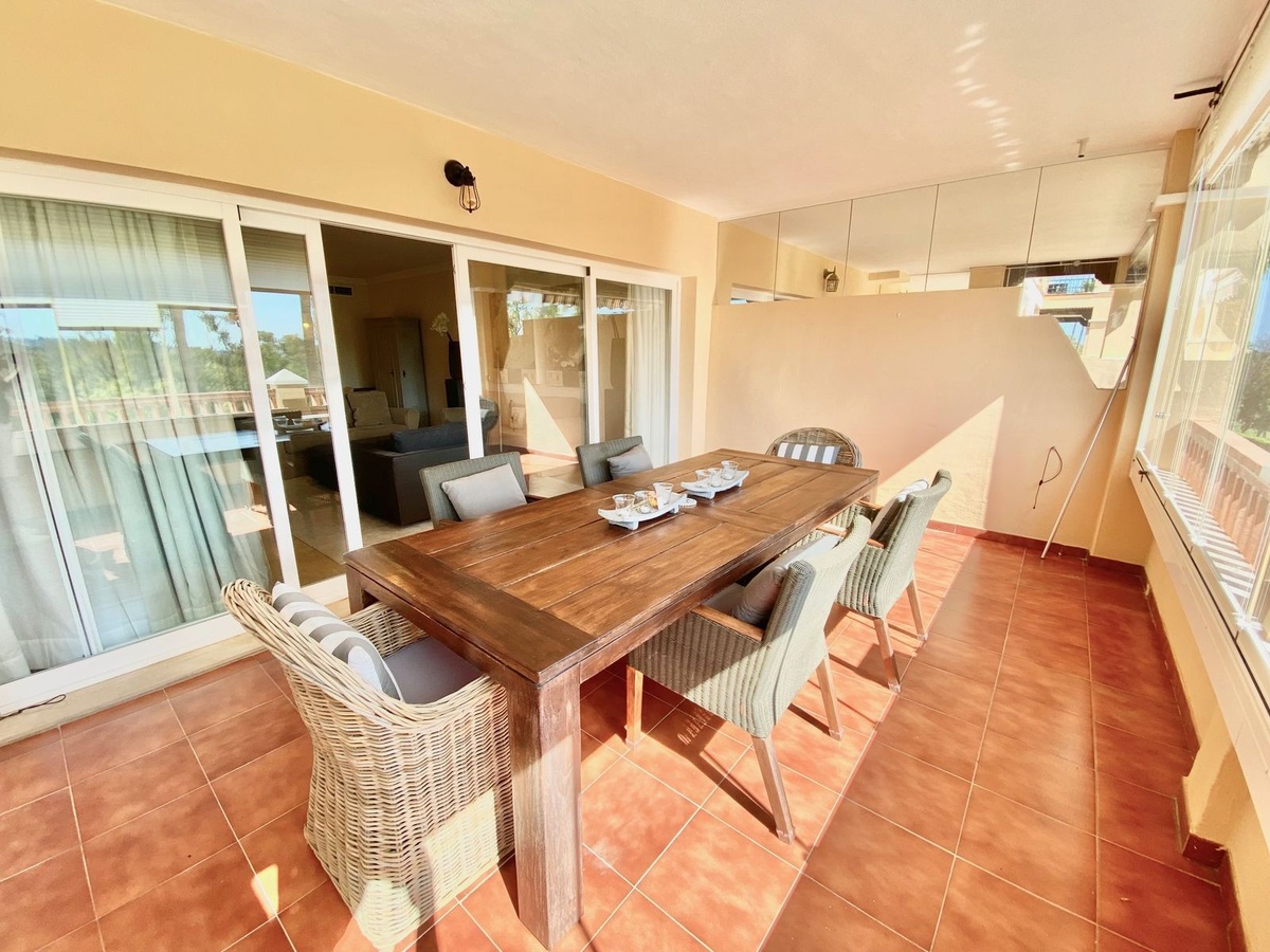 It features 2 bedrooms, 3 bathrooms, and a spacious 34 m² sunny terrace with views of the sea, mountains, and golf course.