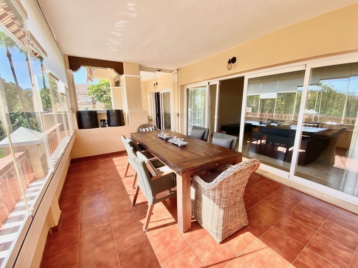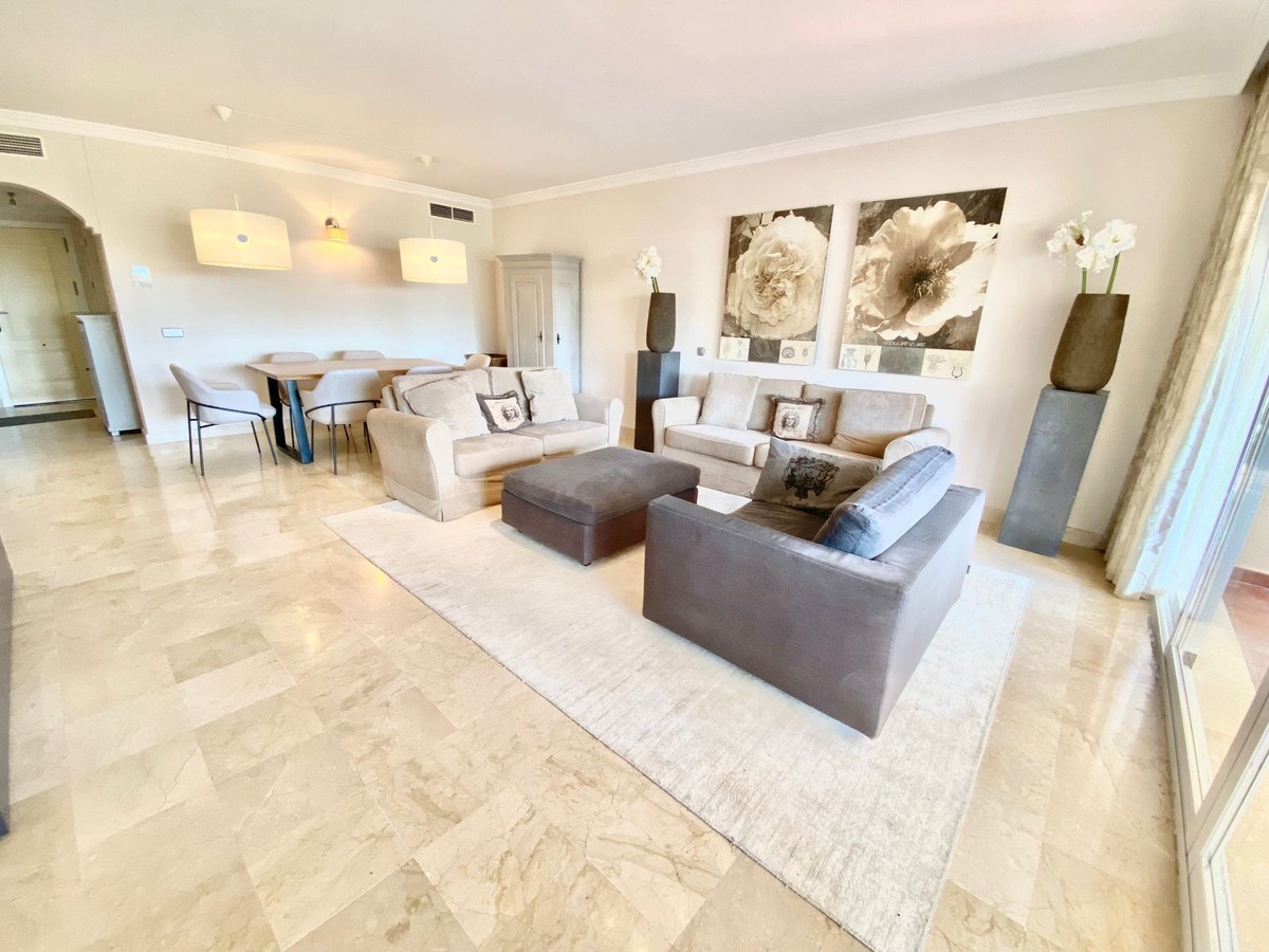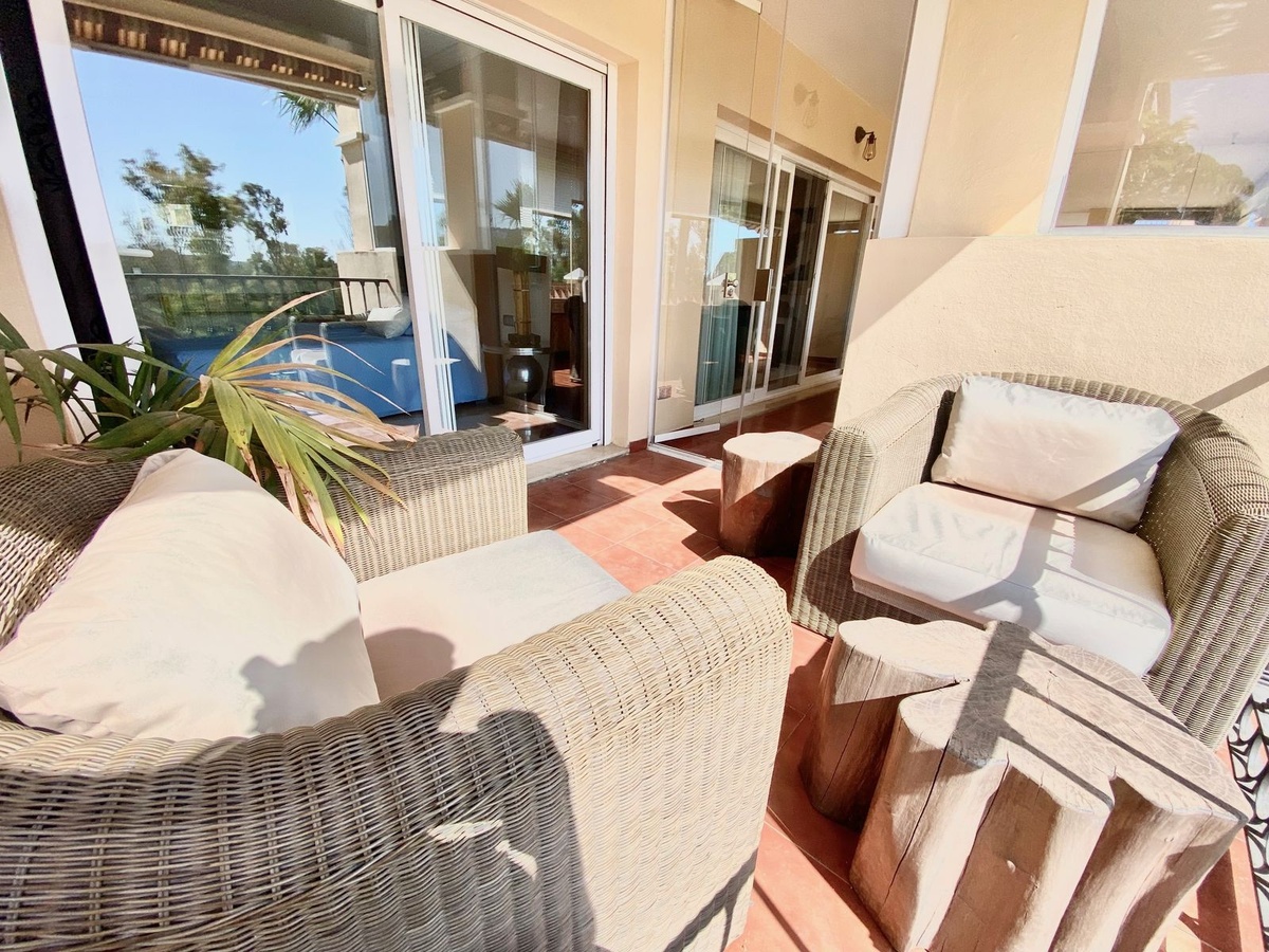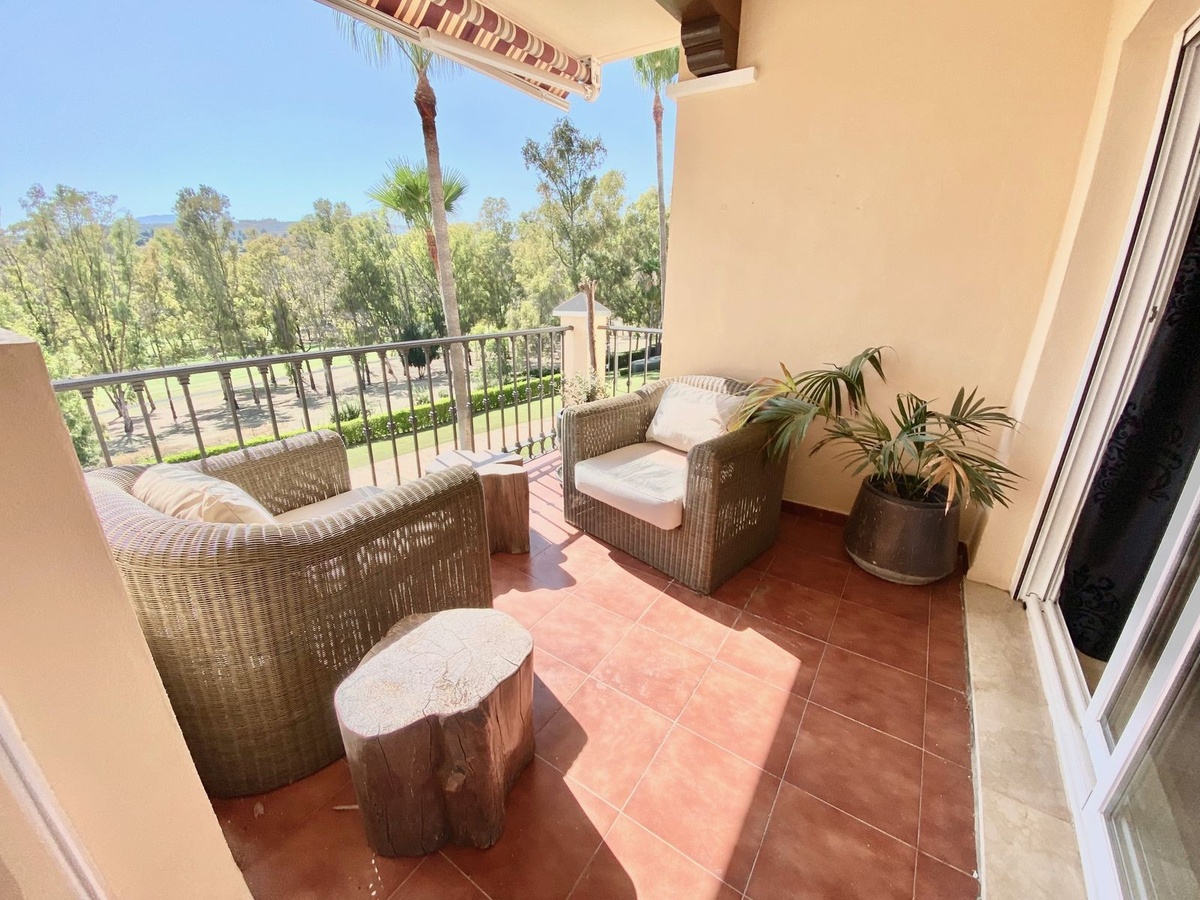 It features 2 bedrooms, 3 bathrooms, and a spacious 34 m² sunny terrace with views of the sea, mountains, and golf course.