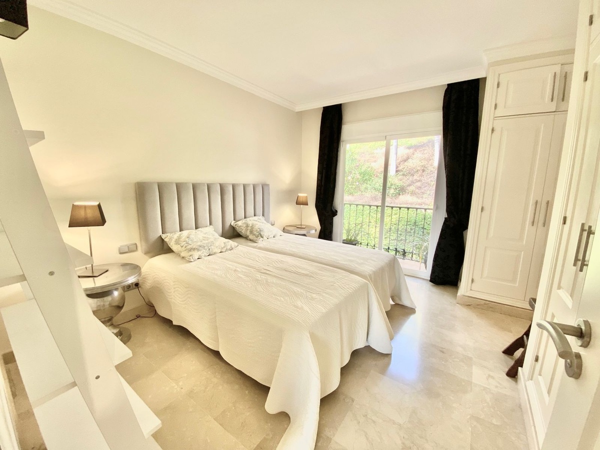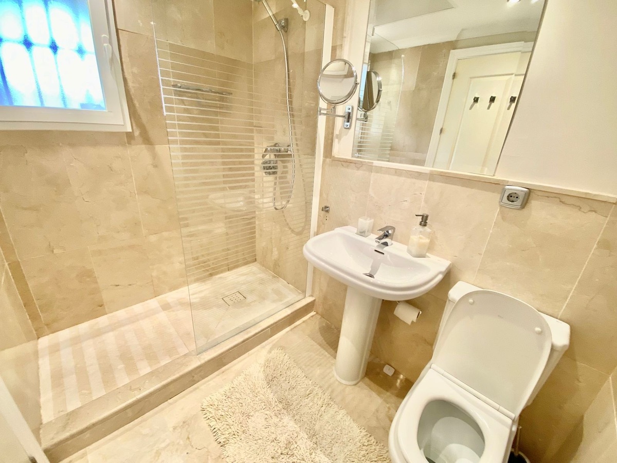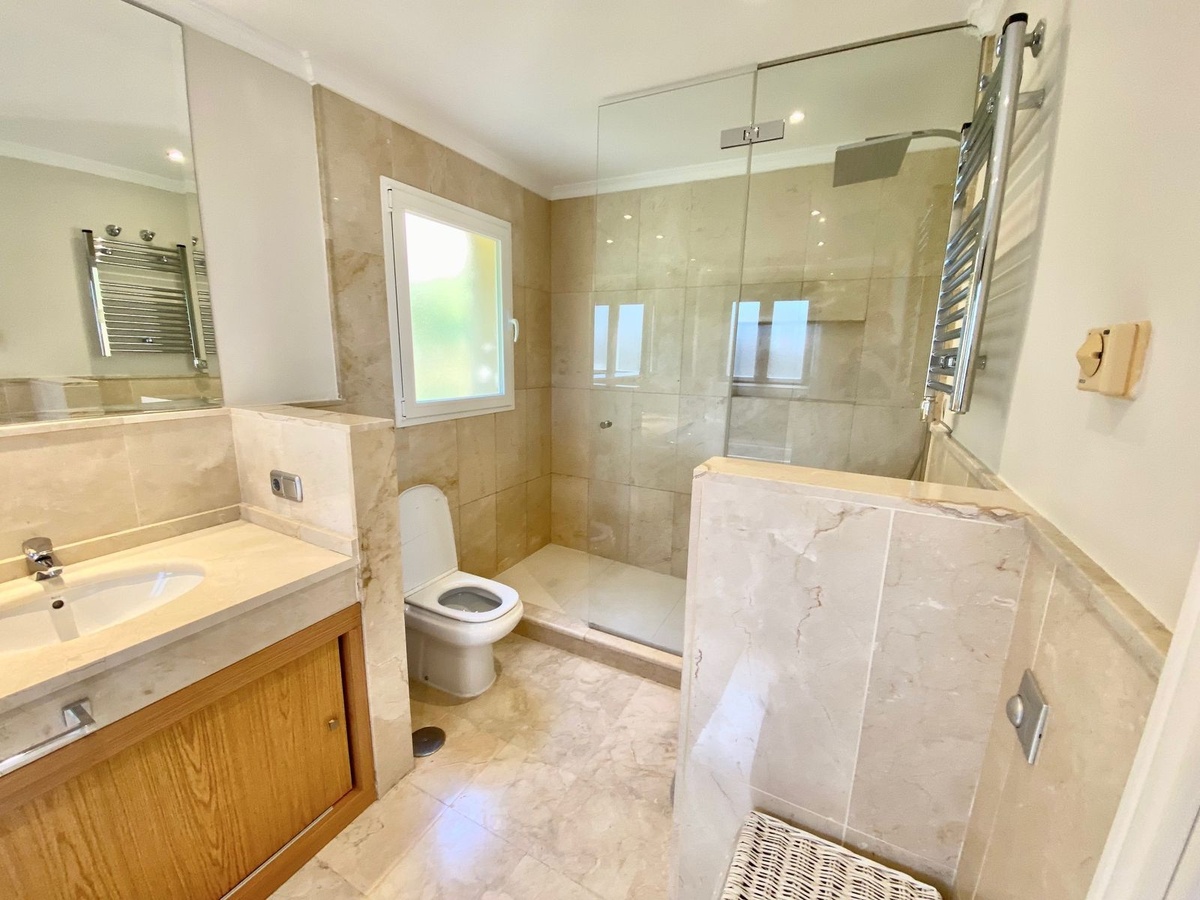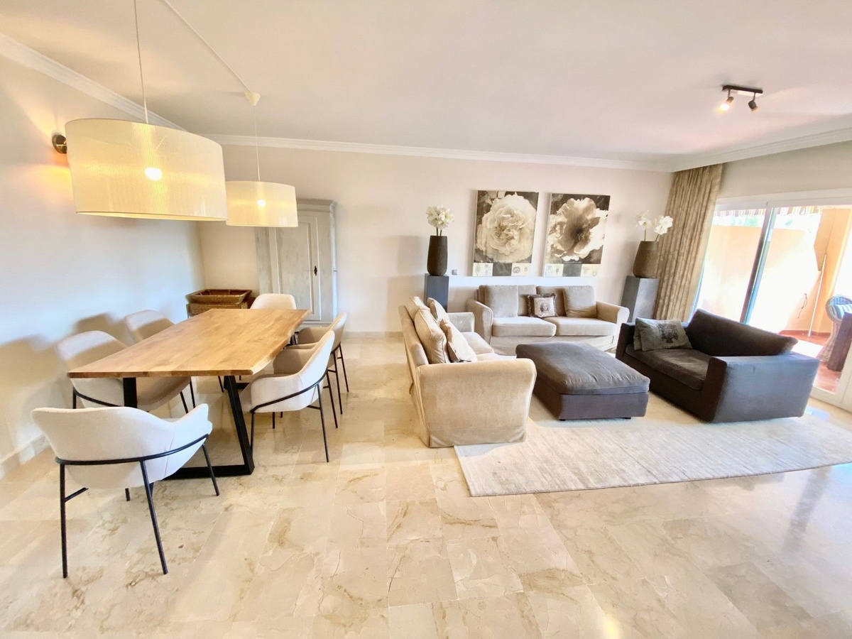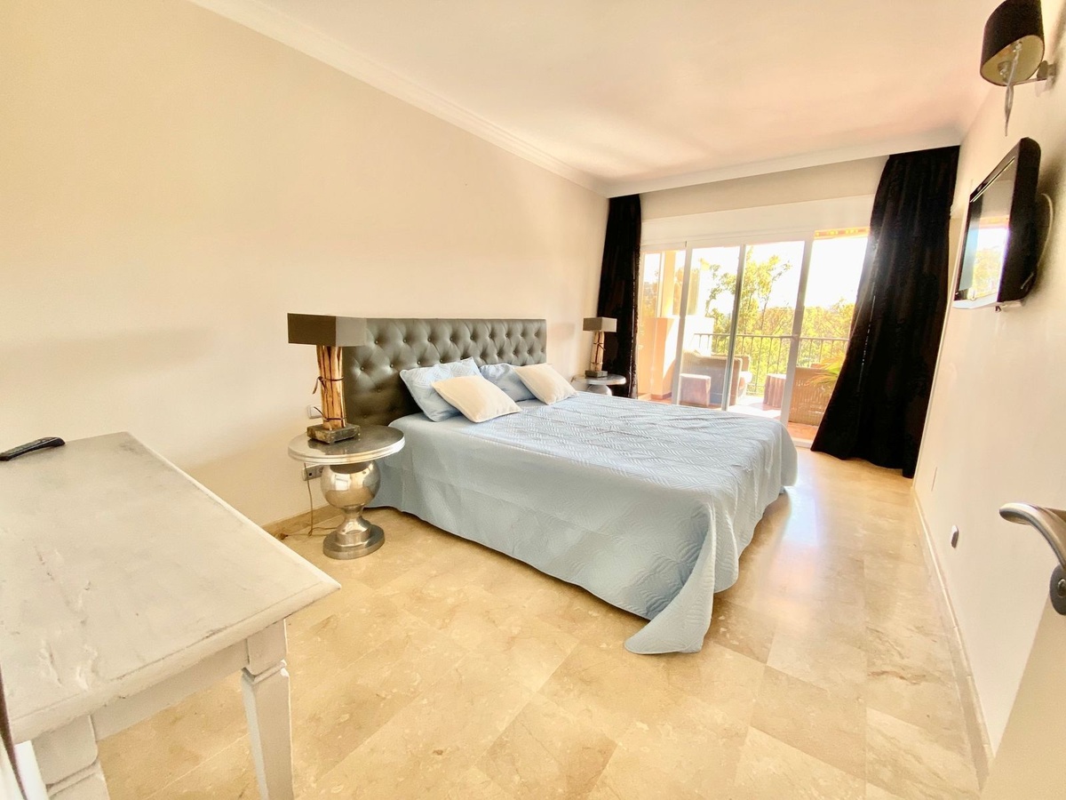 It features 2 bedrooms, 3 bathrooms, and a spacious 34 m² sunny terrace with views of the sea, mountains, and golf course.