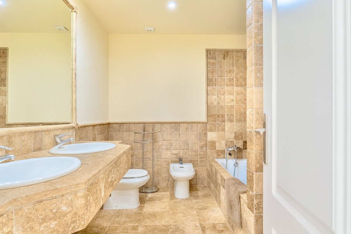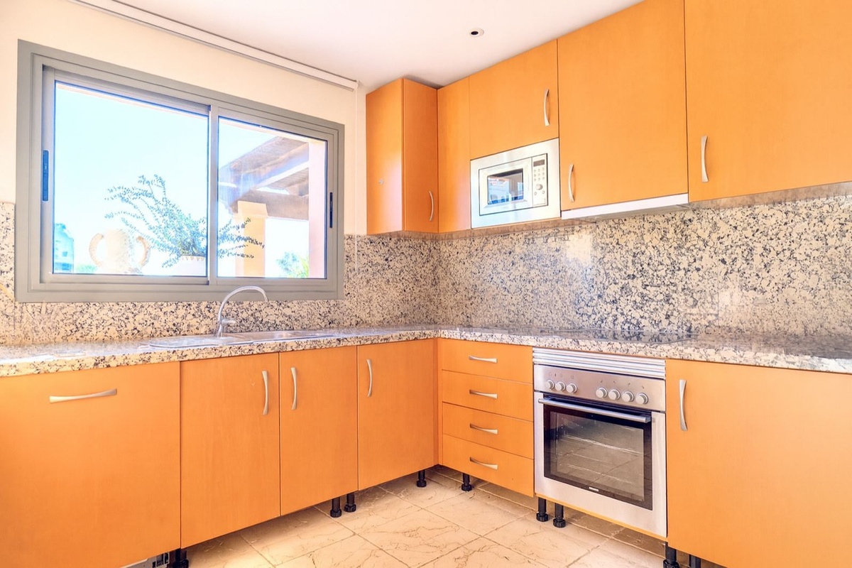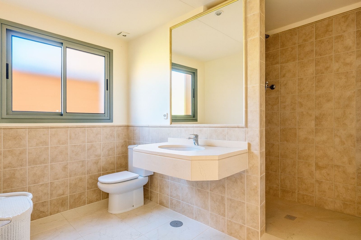 Ejendommen har tre rummelige soveværelser med hvert sit badeværelse, hvilket sikrer privatliv og komfort for alle beboere. Det fuldt udstyrede køkken er designet med henblik på funktionalitet, mens den generøse opholds- og spiseplads giver et lyst og åbent rum, der er ideelt til både dagligdag og underholdning.