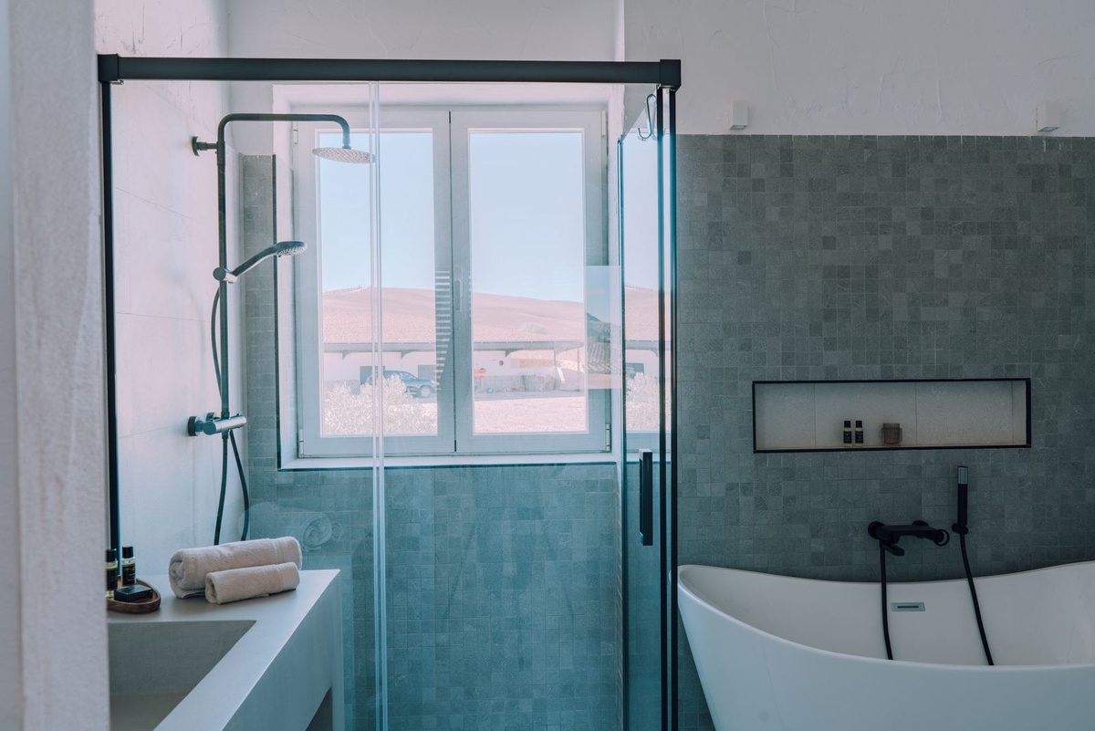 The main house features four spacious bedrooms, each with its own en-suite bathroom, alongside a self-contained guest apartment with private entrance, bedroom, living area, kitchen, and bathroom, linked internally to the main dwelling for flexibility.