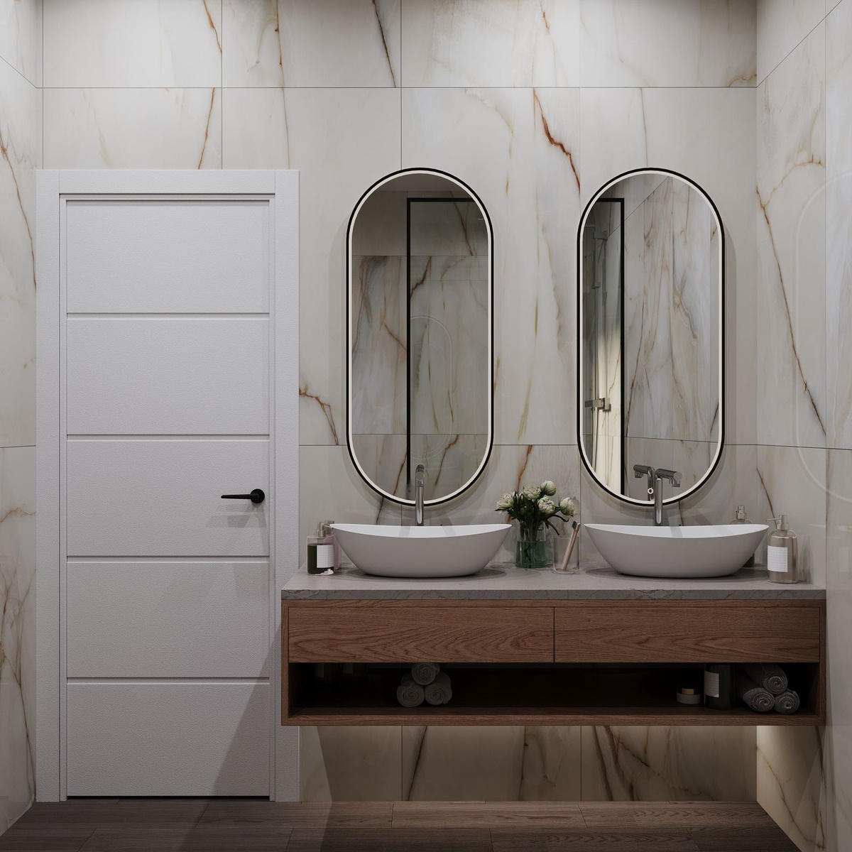 Stueetagen byder dig velkommen med en rummelig og elegant stue med gulv-til-loft-vinduer, der oversvømmer interiøret med naturligt lys.Et imponerende designerkøkken, gæstetoilet og en generøs terrasse med direkte adgang til haven og poolområdet afslutter dette niveau - hvilket skaber et ideelt rum til underholdende og familieboliger.