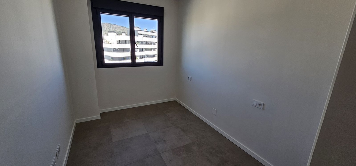 Penthouse-lejligheden har en lys og rummelig opholdsstue med gulv-til-loft vinduer, der fylder rummet med naturligt lys og indrammer en fantastisk udsigt over Middelhavet.