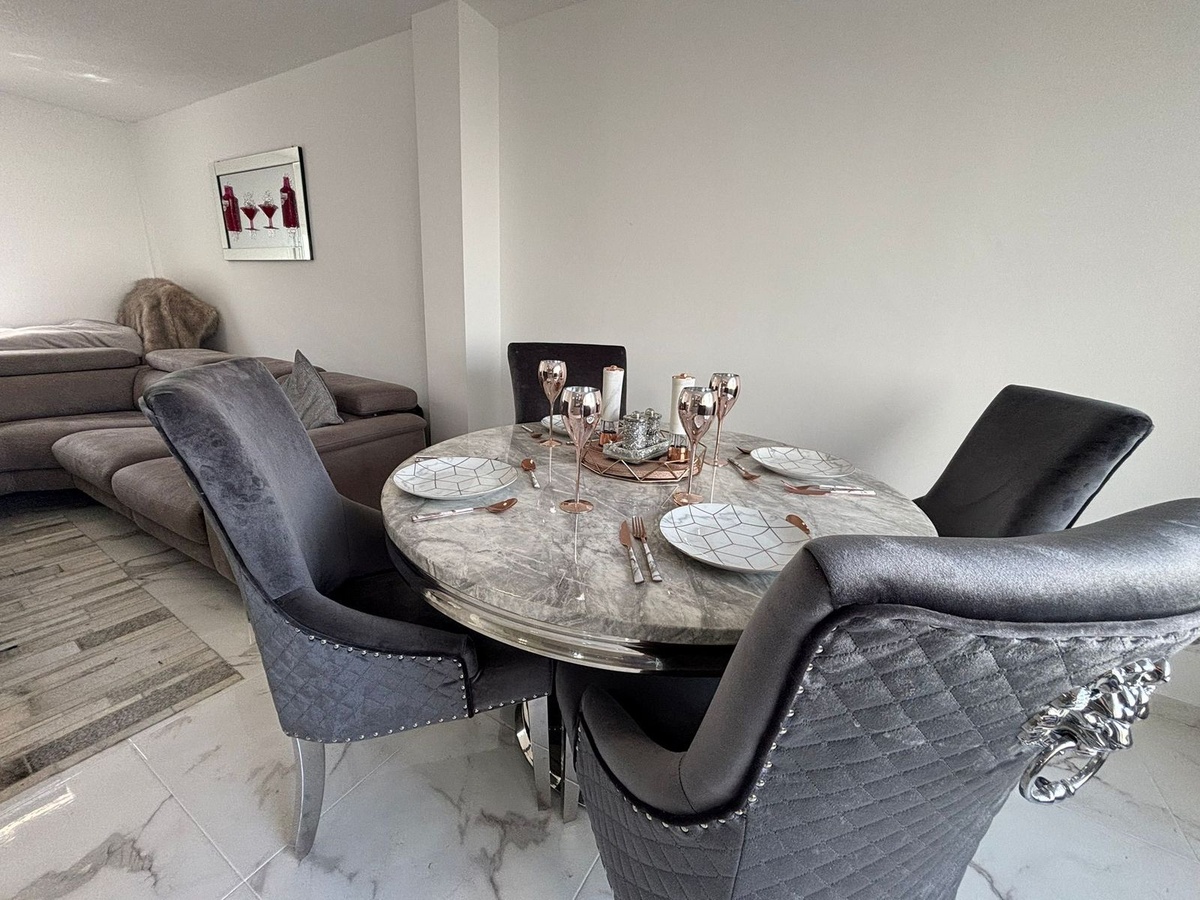 • Large living-dining area, with a round dining table and a generous, comfortable sofa – perfect for relaxing or entertaining.