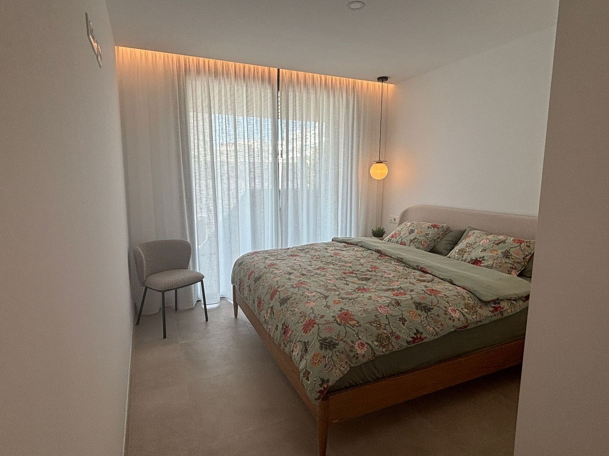 De to soveværelser, ligesom hele ejendommen, har en moderne og minimalistisk stil, fremhævet af de lyse farver, de anvendte materialer og gulv-til-loft-vinduer.