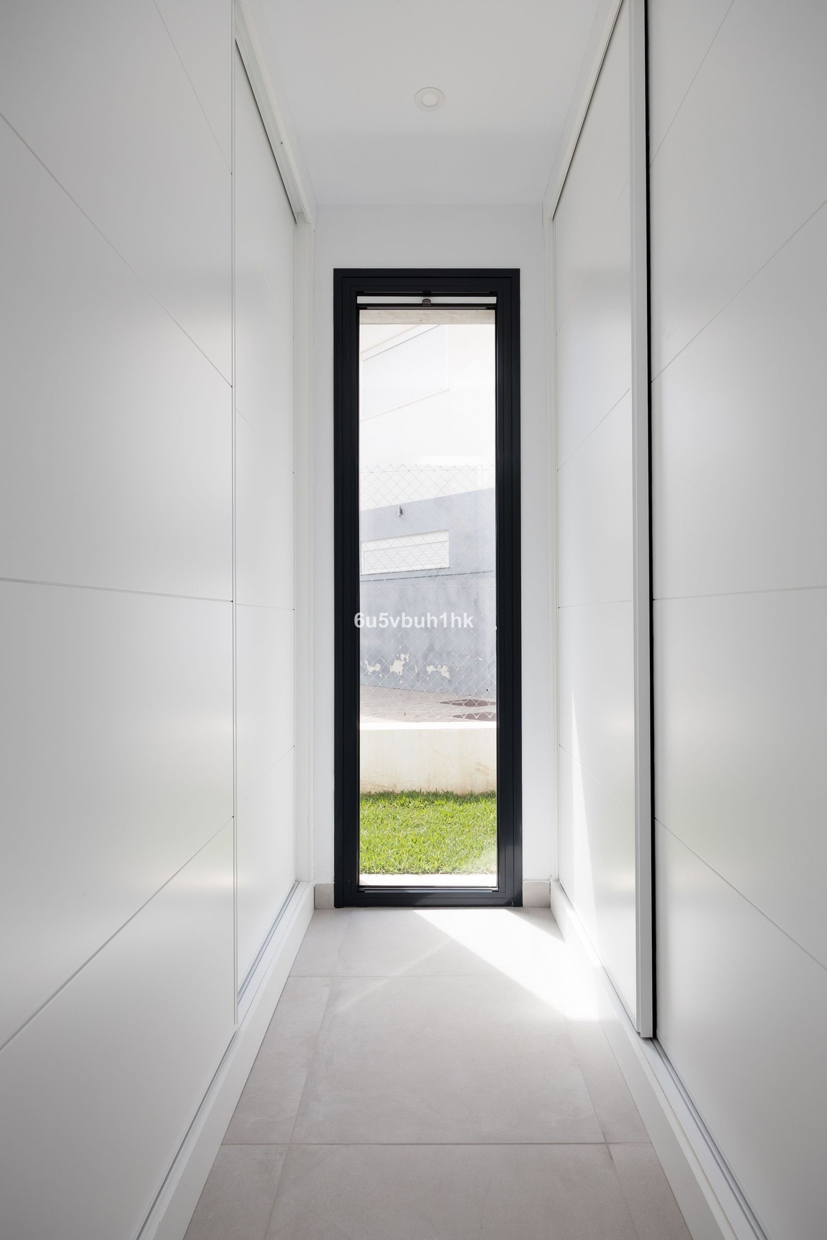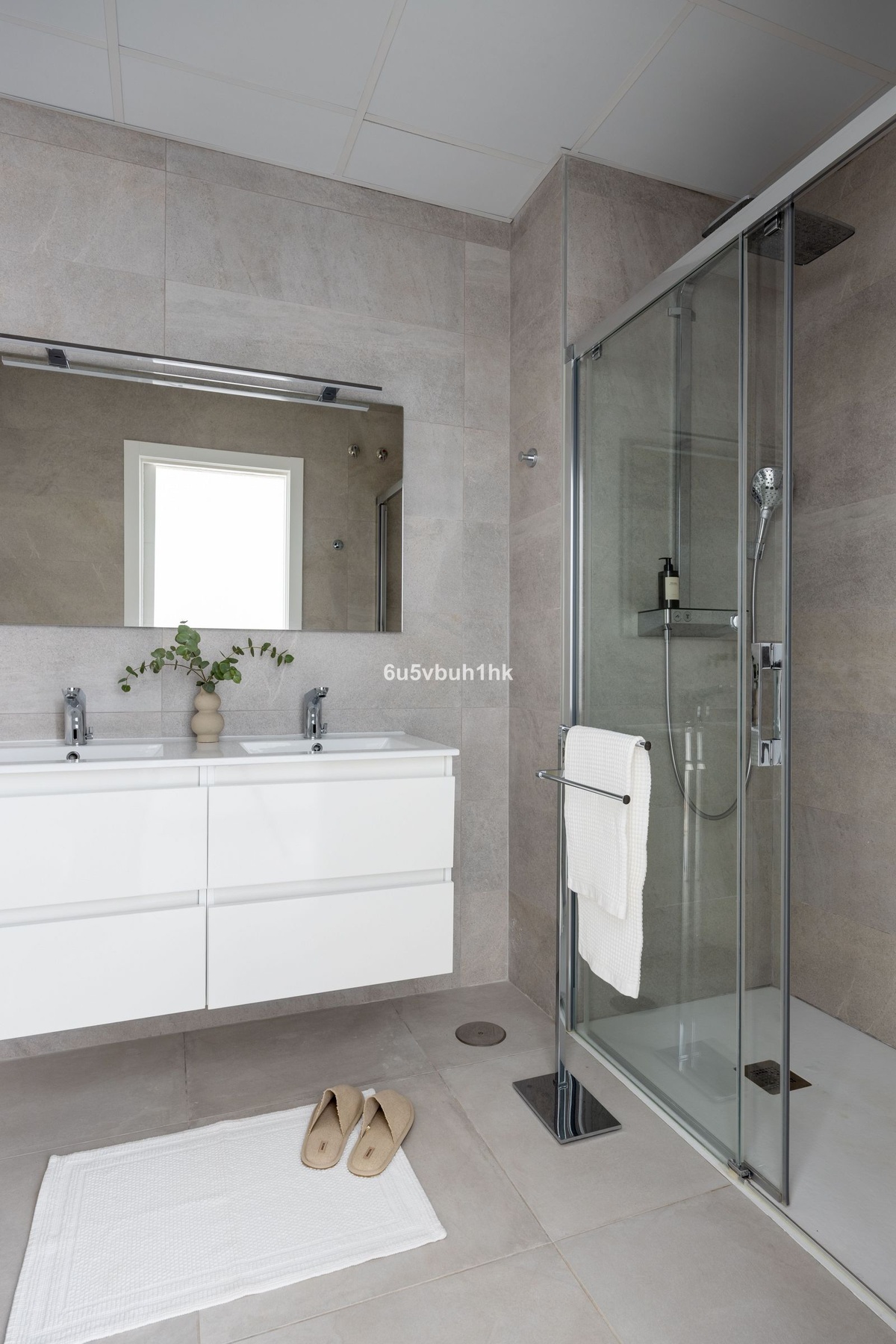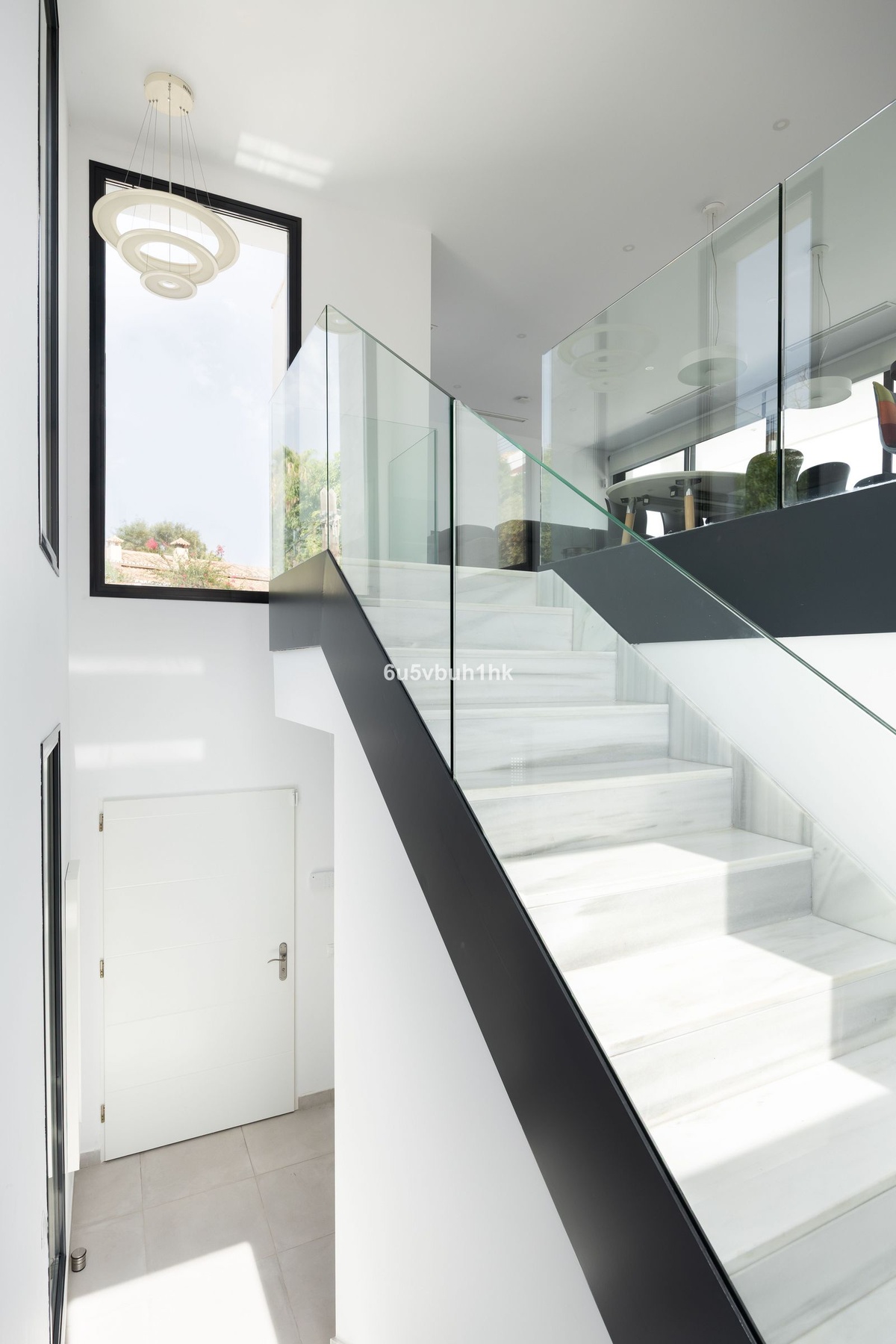 On the ground floor, you will find three spacious bedrooms, all with direct access to the terrace and pool area. The master bedroom features a luxurious en-suite bathroom and a generous walk-in closet. The upper floor impresses with an open-plan design, a state-of-the-art kitchen of the highest standard, and a bright living room. From here, you can access the large terrace, perfect for social gatherings with a dining area, lounge space, and barbecue, as well as partial sea views.