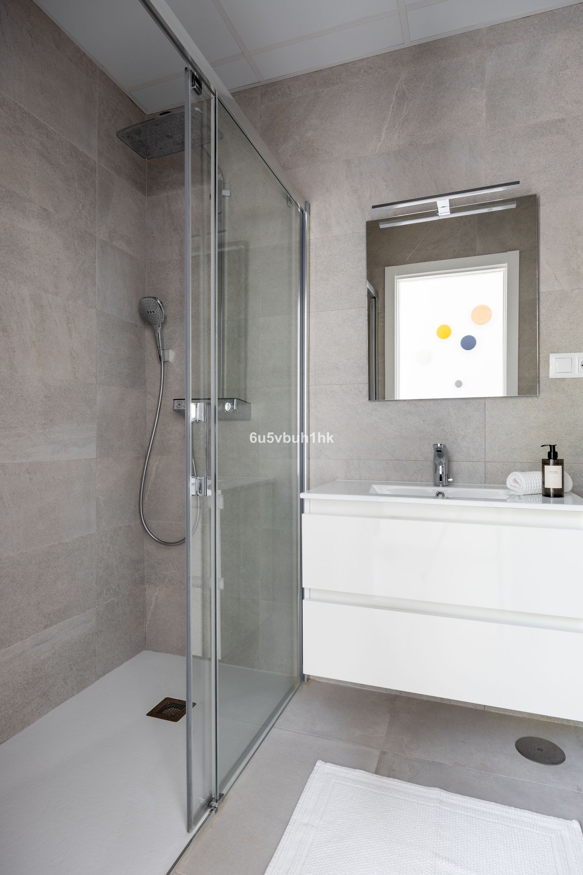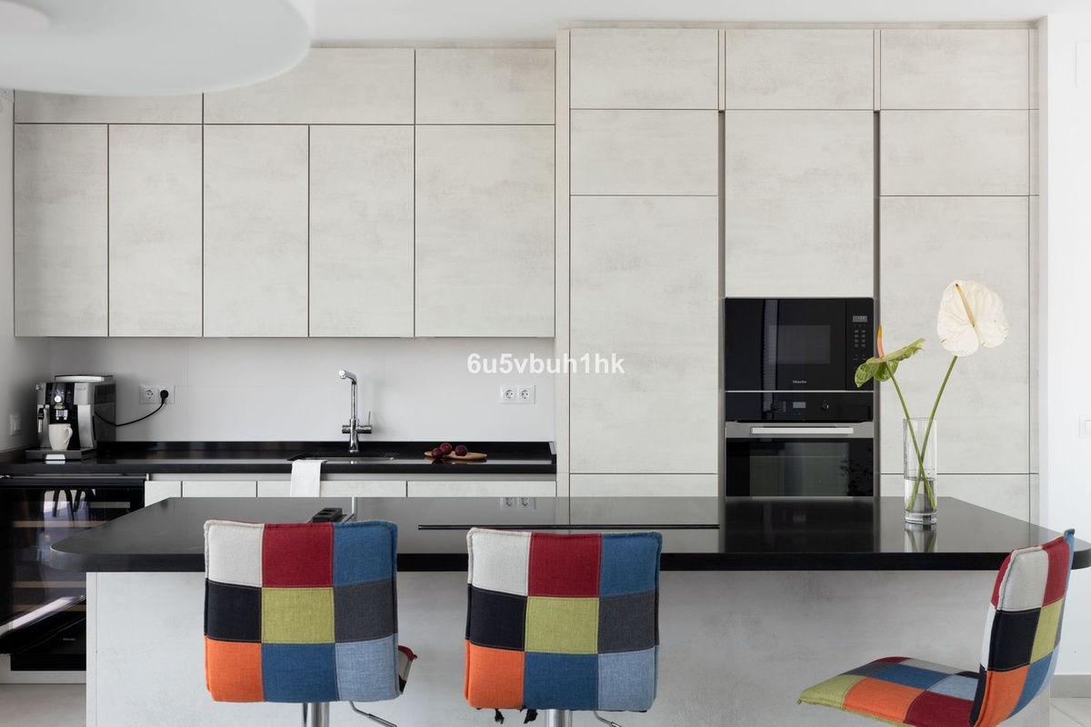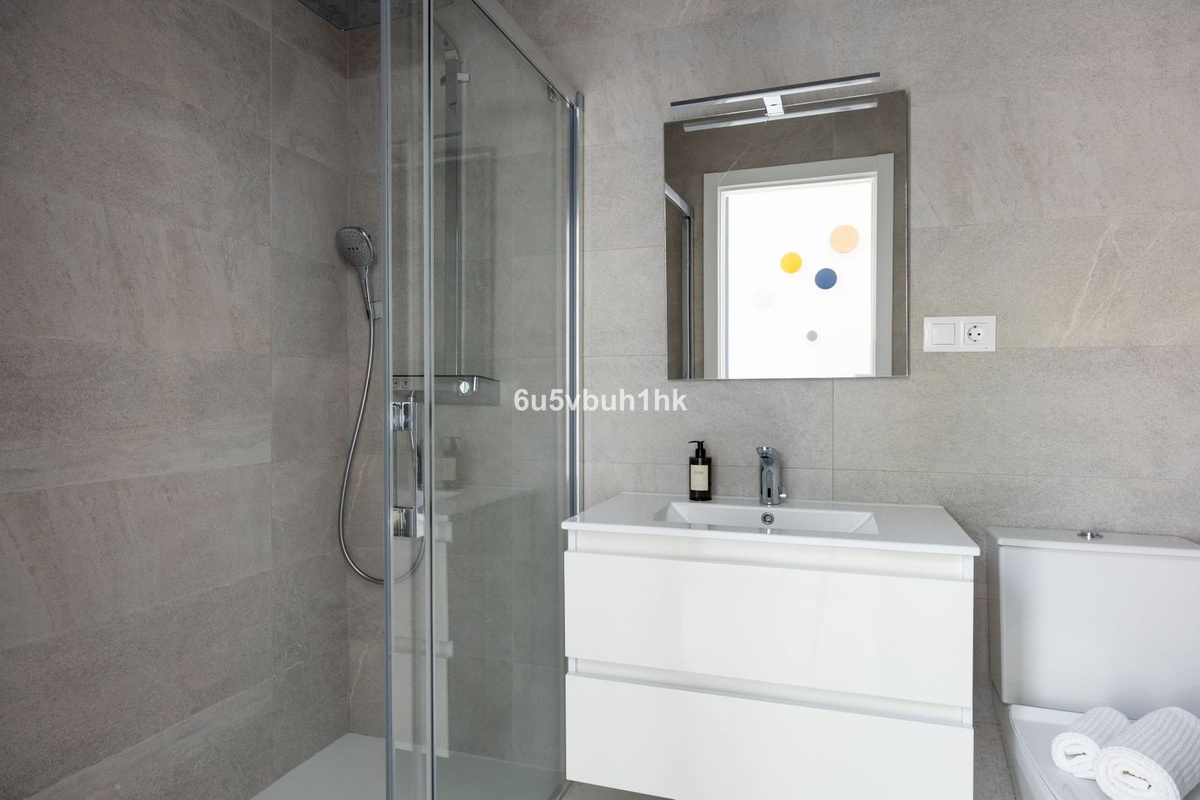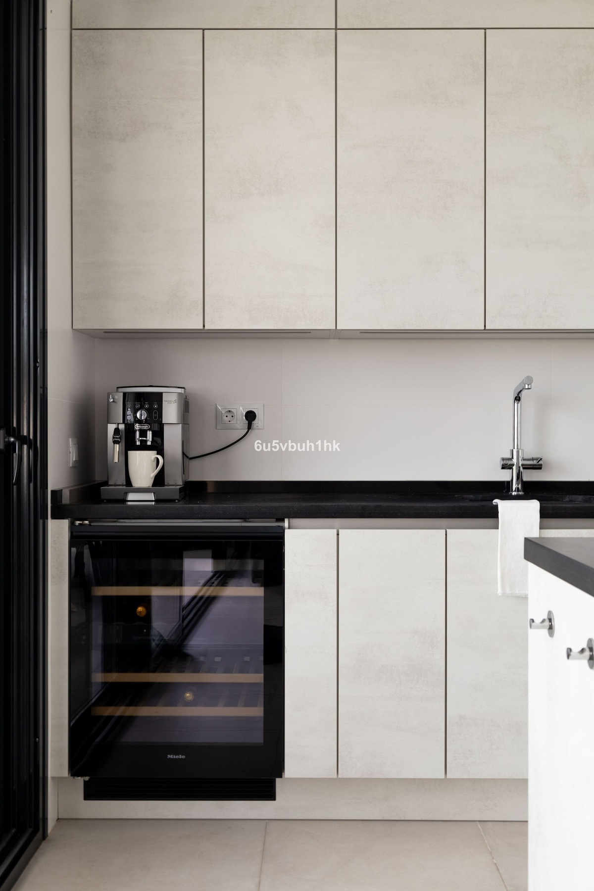 On the ground floor, you will find three spacious bedrooms, all with direct access to the terrace and pool area. The master bedroom features a luxurious en-suite bathroom and a generous walk-in closet. The upper floor impresses with an open-plan design, a state-of-the-art kitchen of the highest standard, and a bright living room. From here, you can access the large terrace, perfect for social gatherings with a dining area, lounge space, and barbecue, as well as partial sea views.