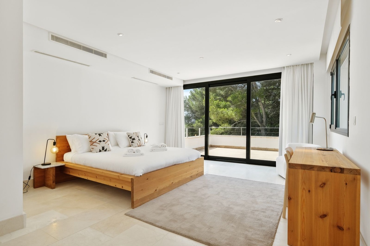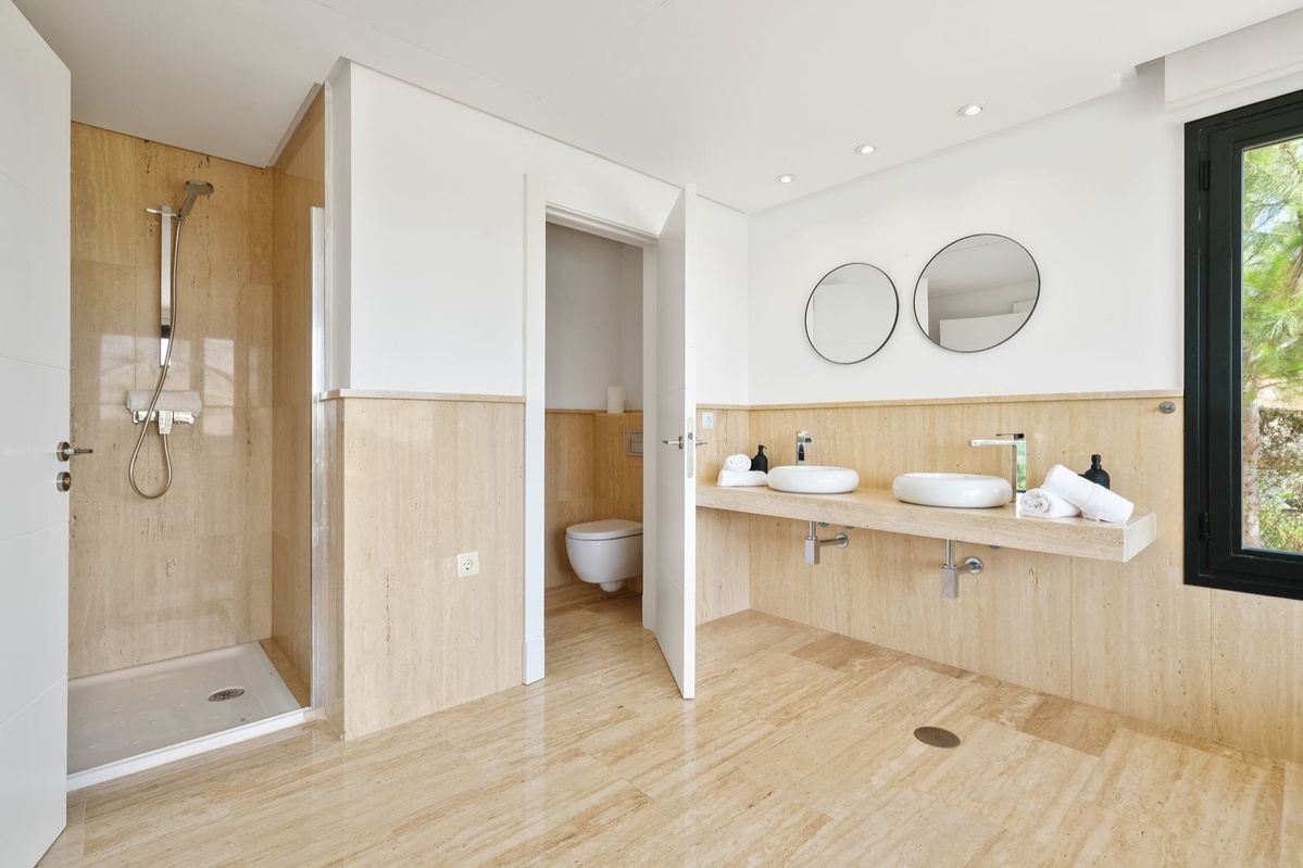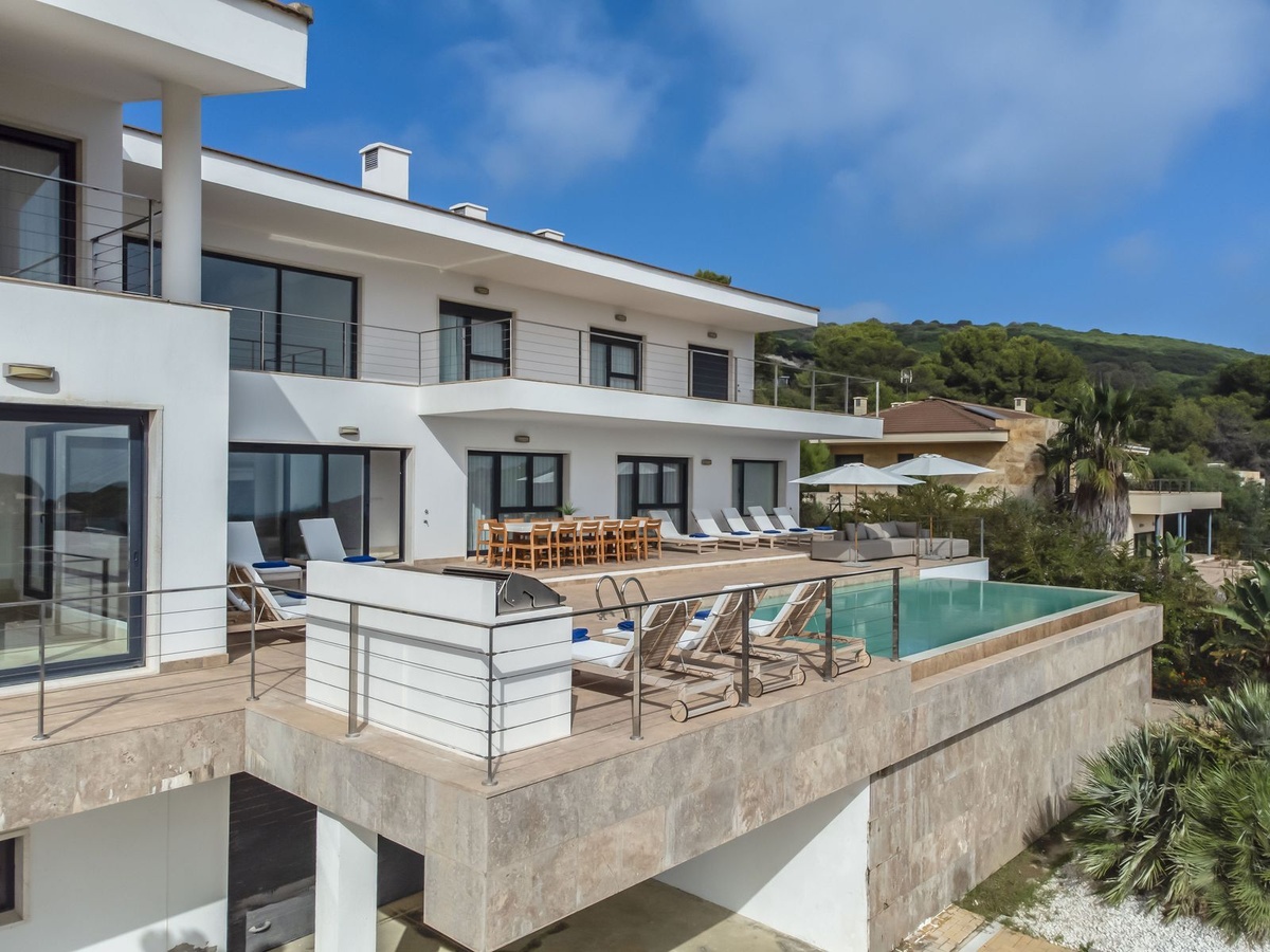 Inside, the villa is designed with comfort and style. Six bedrooms are en-suite, featuring high-quality finishes, underfloor heating, and full air conditioning. Almost every room enjoys stunning sea views.