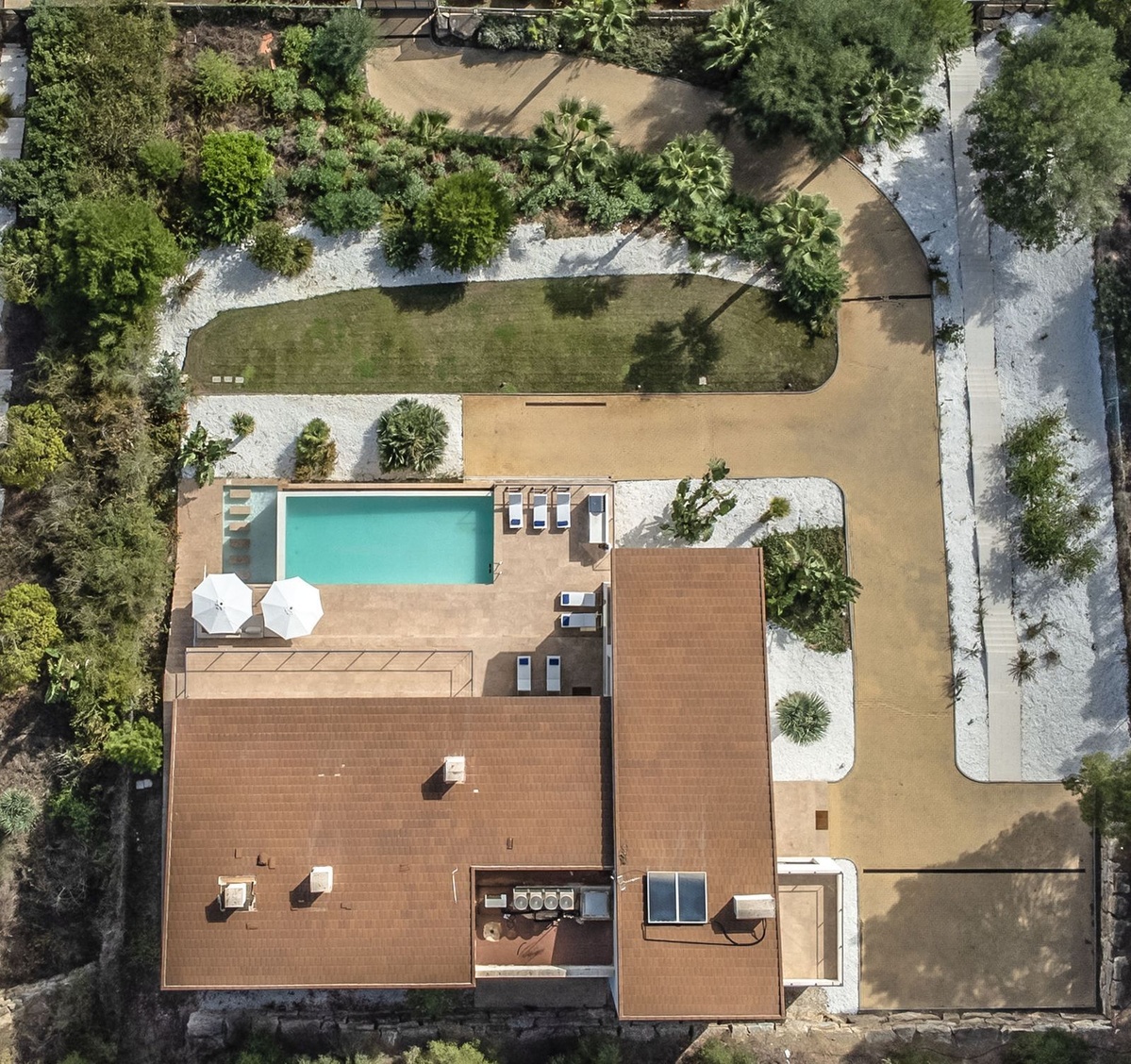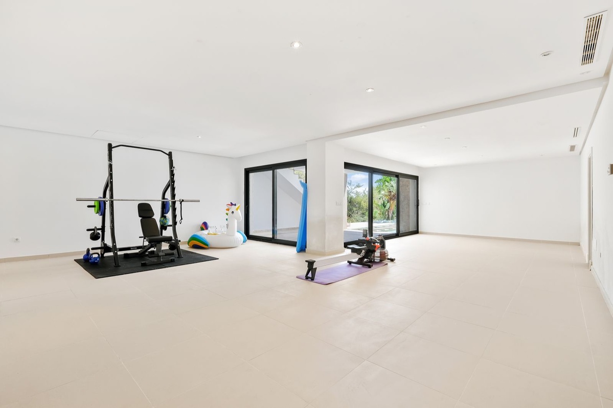 Lower floor: Direct access to the baby pool, garden, and sunny terrace. Here you’ll find a fully equipped fitness and games room (with table football and billiards), a table tennis room, and an underground garage for three cars.