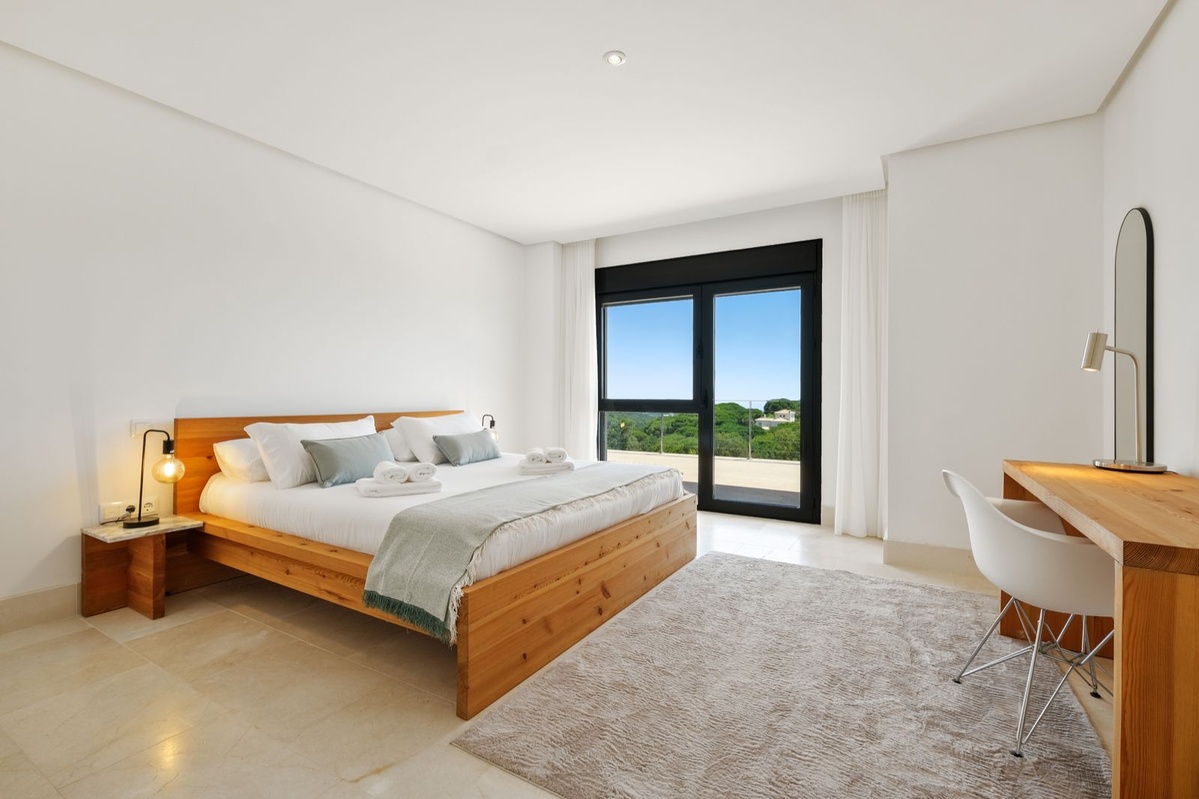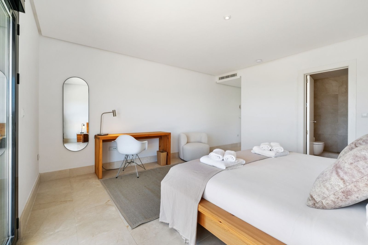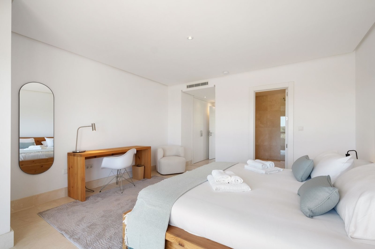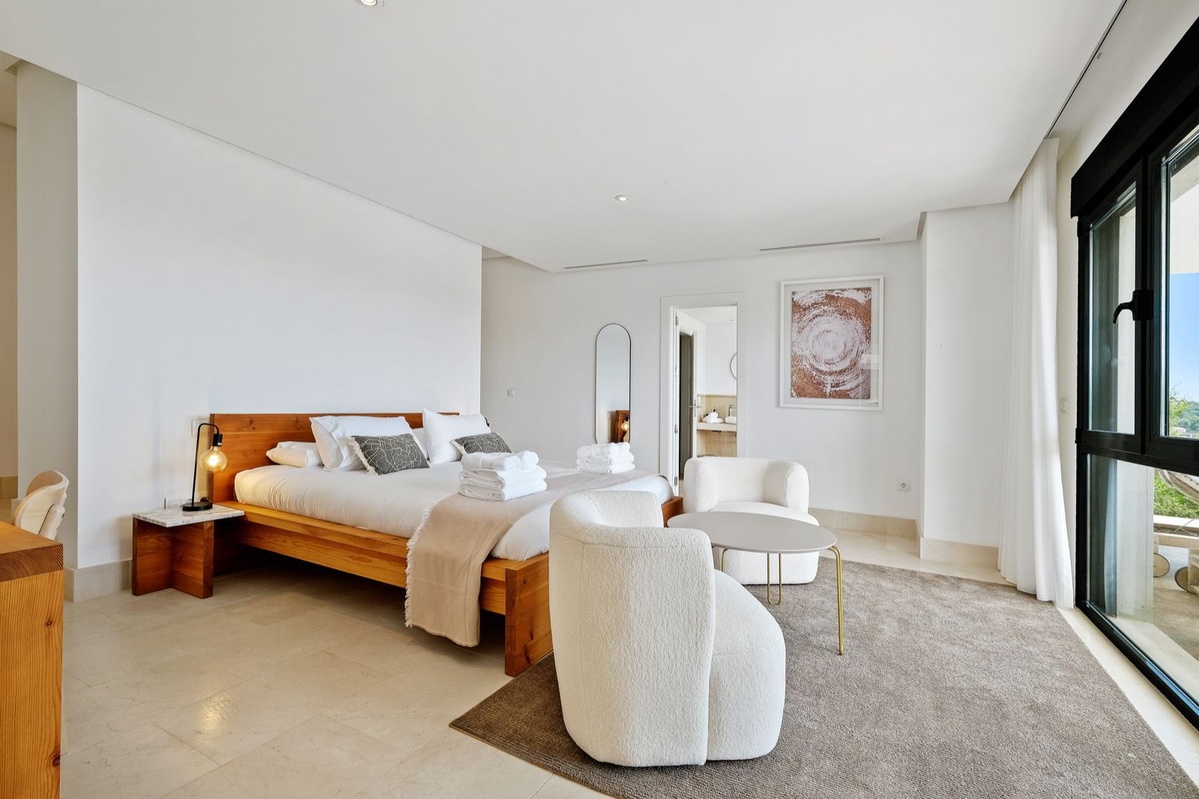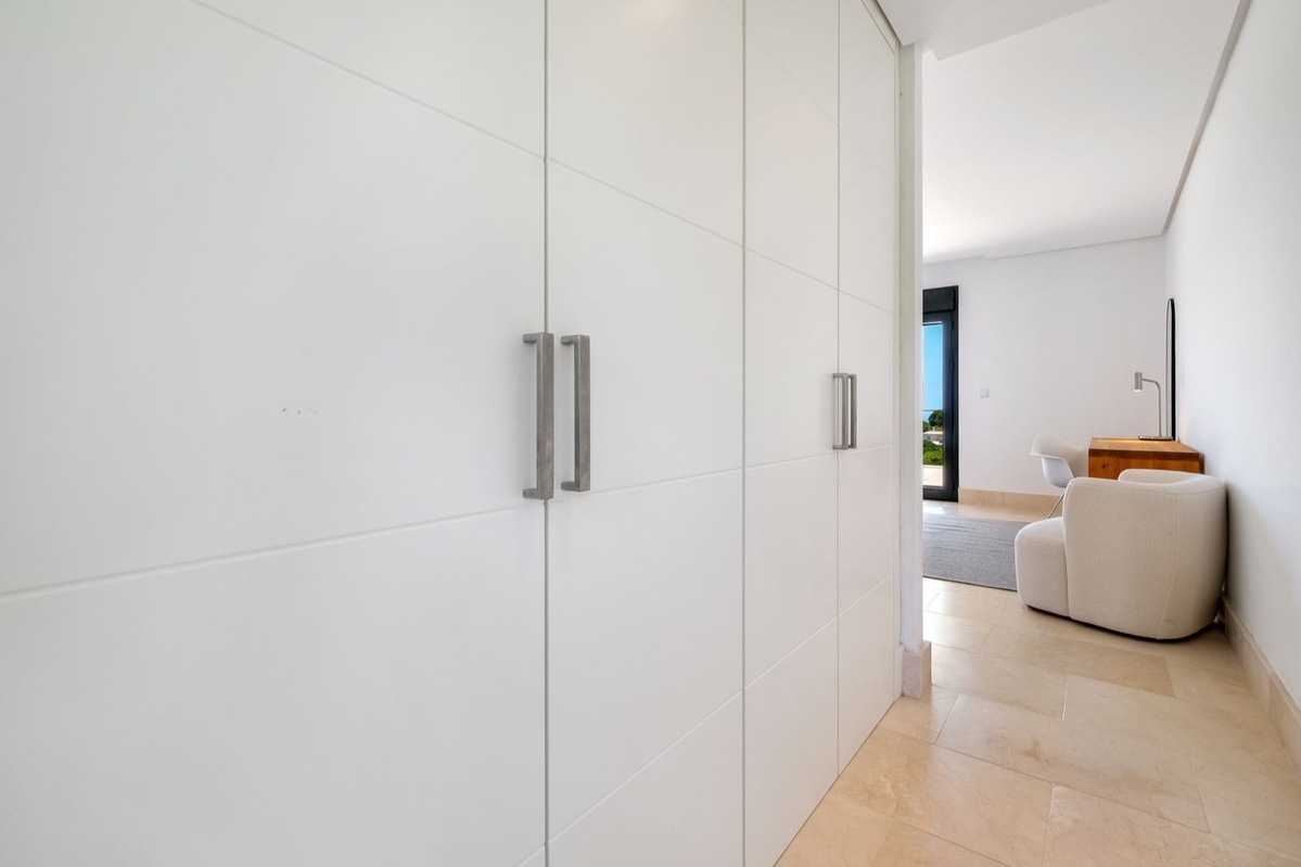 Øverste etage: Fire stilfulde soveværelser, alle med eget badeværelse, indbyggede skabe, balkon og fantastisk havudsigt. Hovedsuiten har en stor privat terrasse, et påklædningsområde og et luksuriøst badeværelse med jacuzzi.