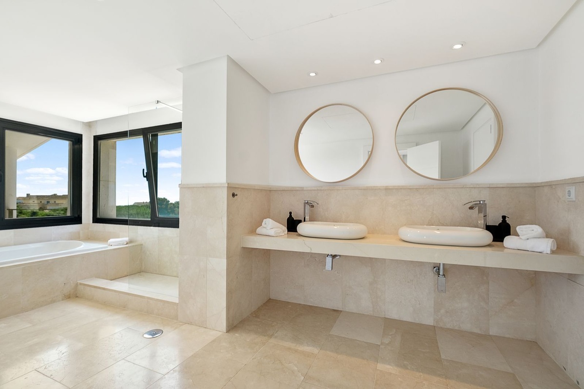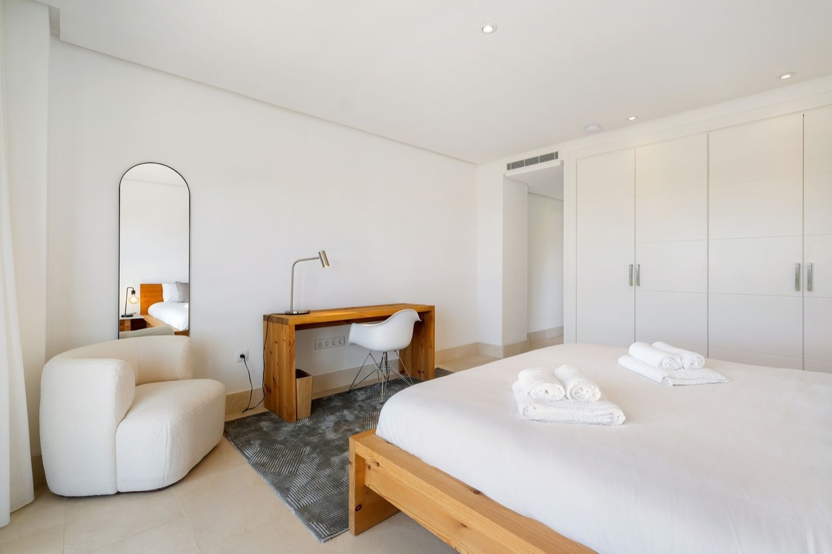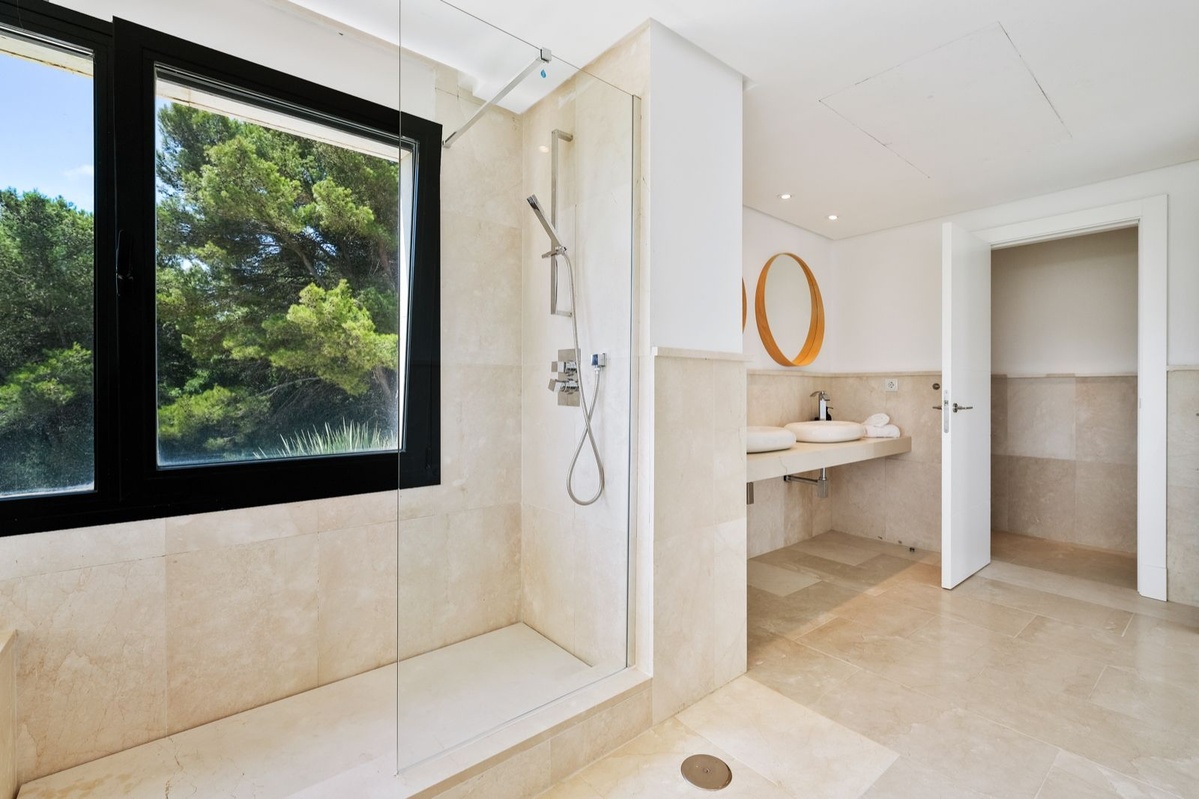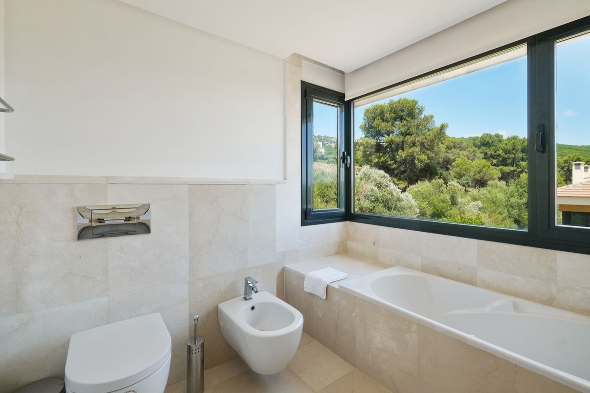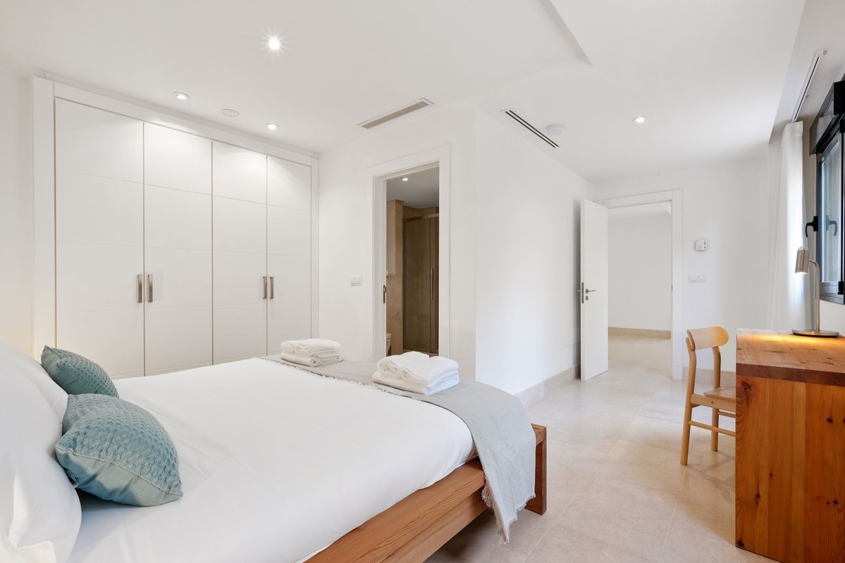 Øverste etage: Fire stilfulde soveværelser, alle med eget badeværelse, indbyggede skabe, balkon og fantastisk havudsigt. Hovedsuiten har en stor privat terrasse, et påklædningsområde og et luksuriøst badeværelse med jacuzzi.