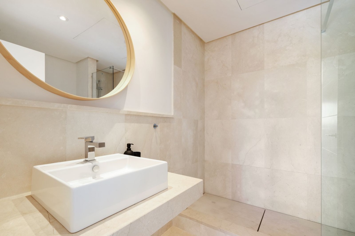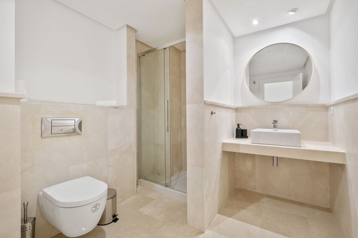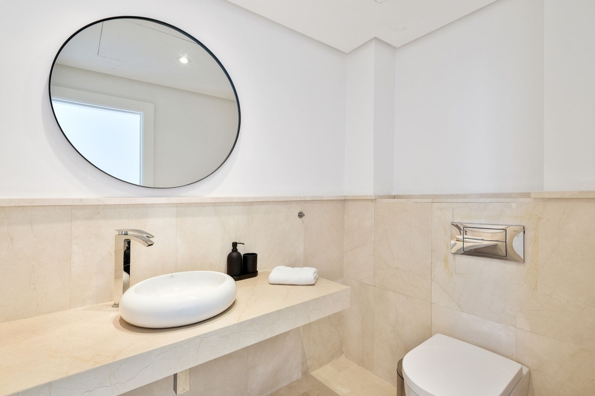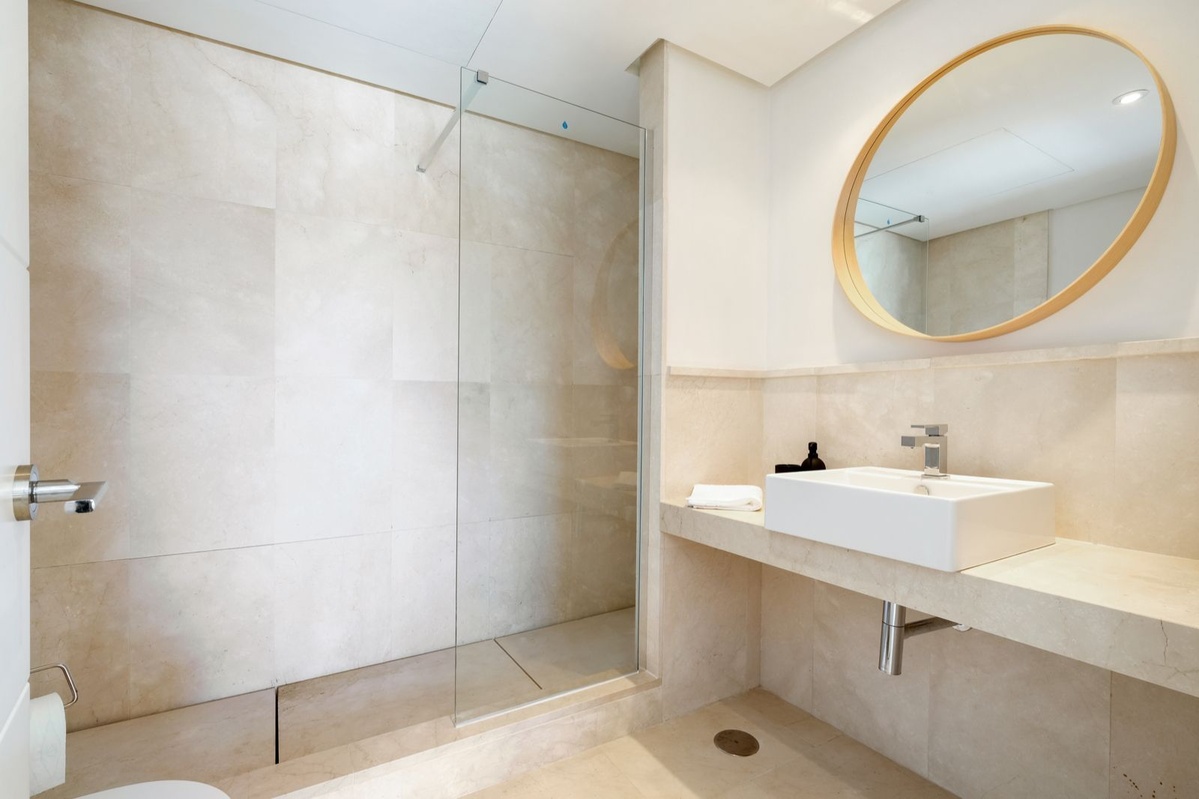 Middle floor: A bright, spacious lounge with sea views opens onto the main pool area and terraces. There’s also a dining area, a TV space, a fully equipped kitchen, a laundry room, two en-suite bedrooms, and a guest toilet.