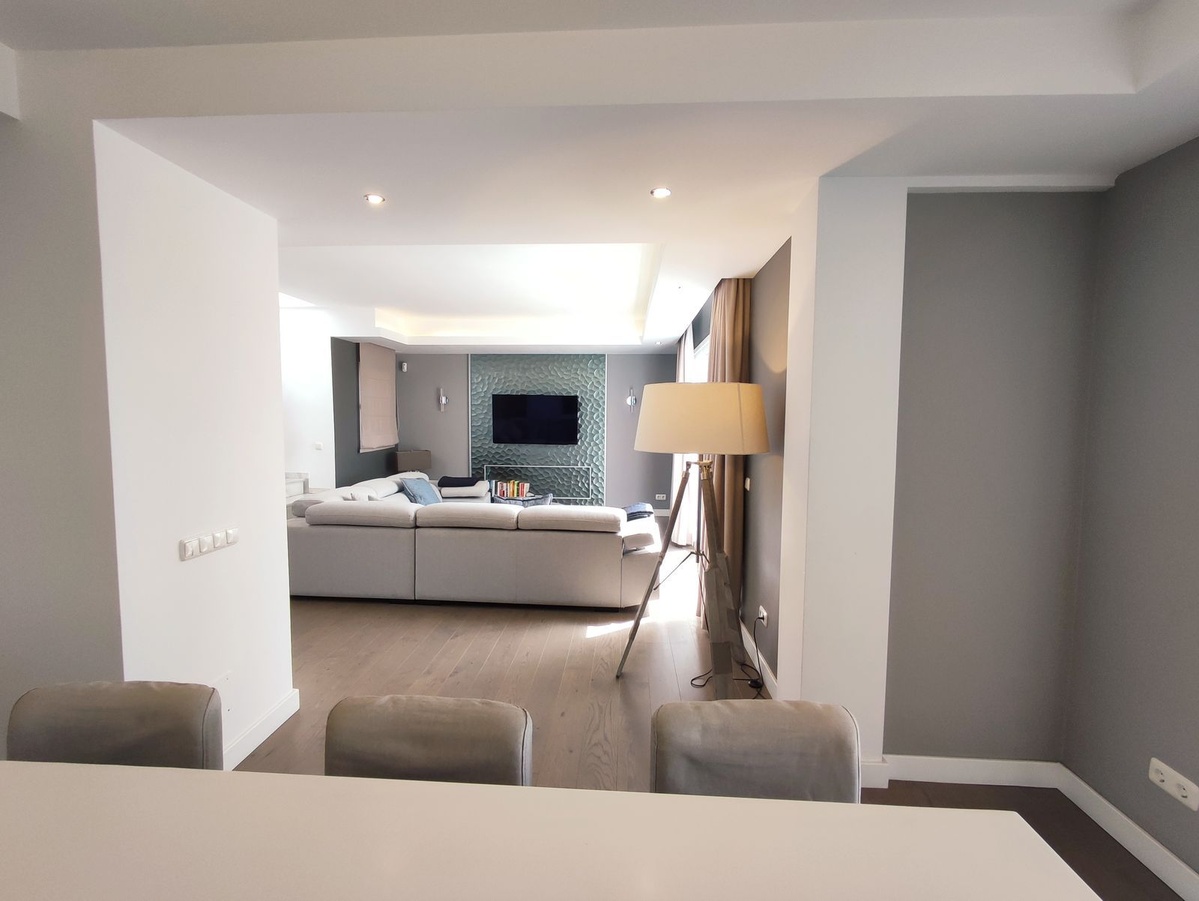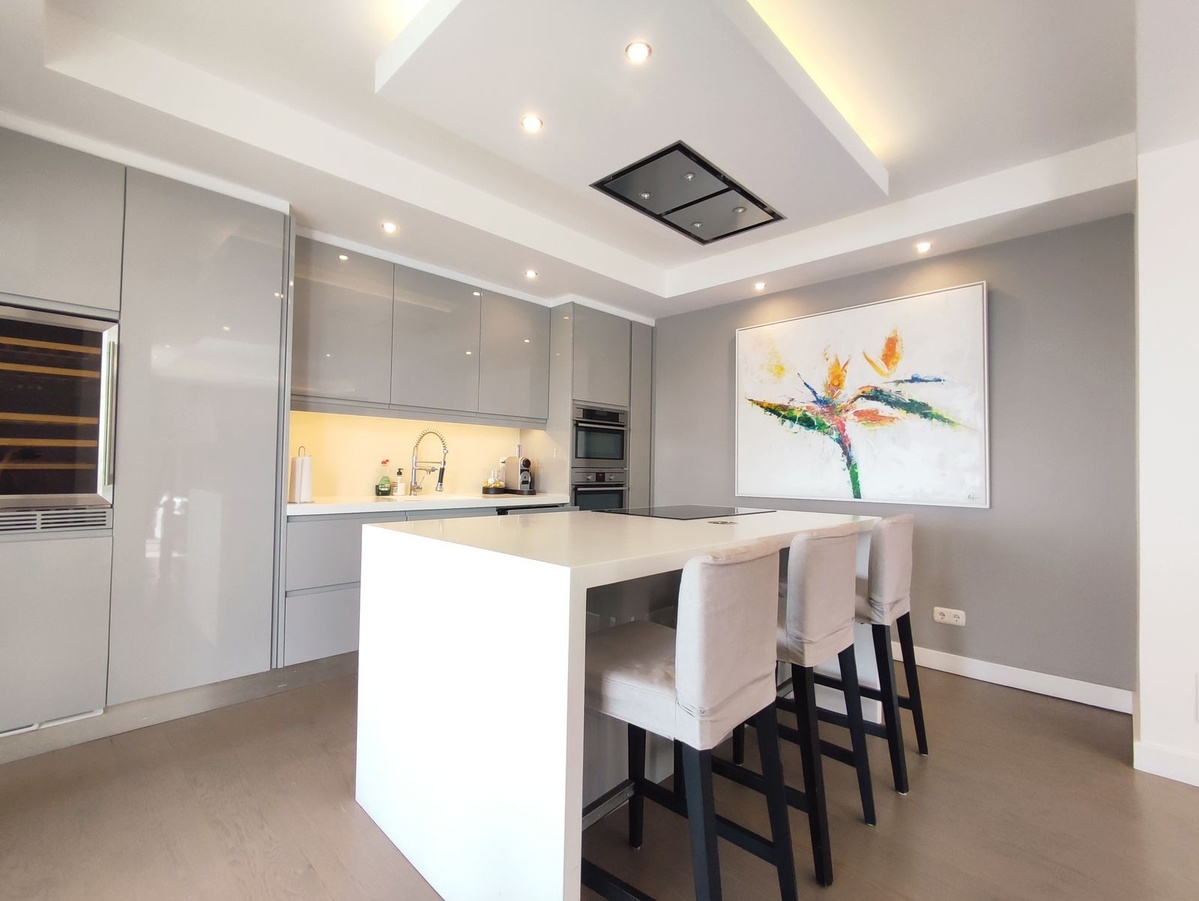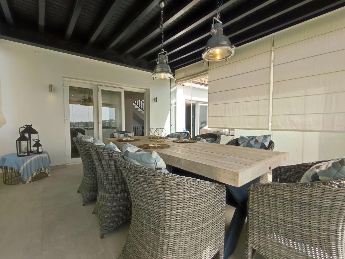 Det moderne køkken åbner på en overdækket spisestørrasse med glasgardiner, ideel til året rundt nydelse-der er lukket i de køligere måneder og åben for Middelhavets brise om sommeren.