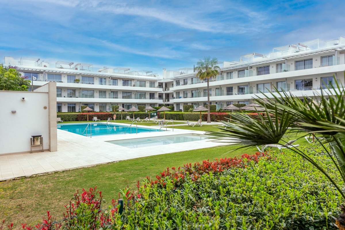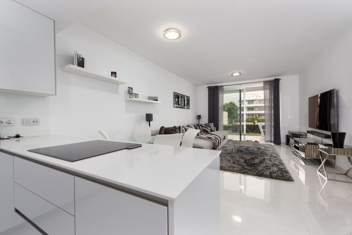 Moderne lejlighed med to soveværelser i stueetagen, vestvendt med eftermiddagssol og direkte adgang til fælles haver og swimmingpool.