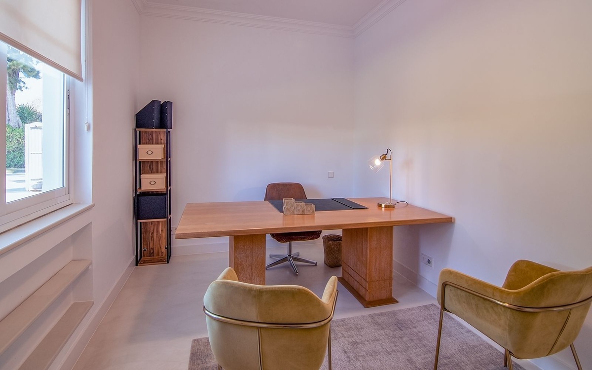 The master suite impresses with its generous size and an elegant en-suite bathroom. Four additional bedrooms share two well-appointed family bathrooms, complemented by a guest toilet. Additional spaces include an office and a TV room, both of which can be adapted as extra bedrooms to suit various needs.