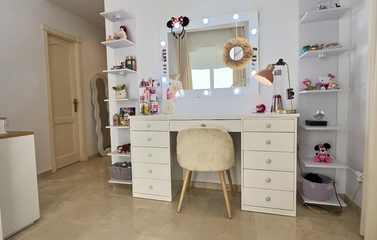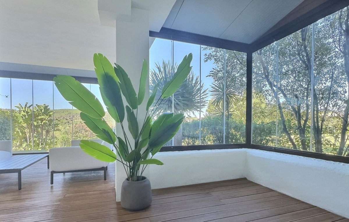 The master bedroom and living room open onto a stunning covered terrace, fully enclosed with glass curtains, connecting to the private garden and communal areas. West-facing, it enjoys beautiful countryside views and breathtaking sunsets. The other two bedrooms share an additional terrace facing east, perfect for the morning sun.