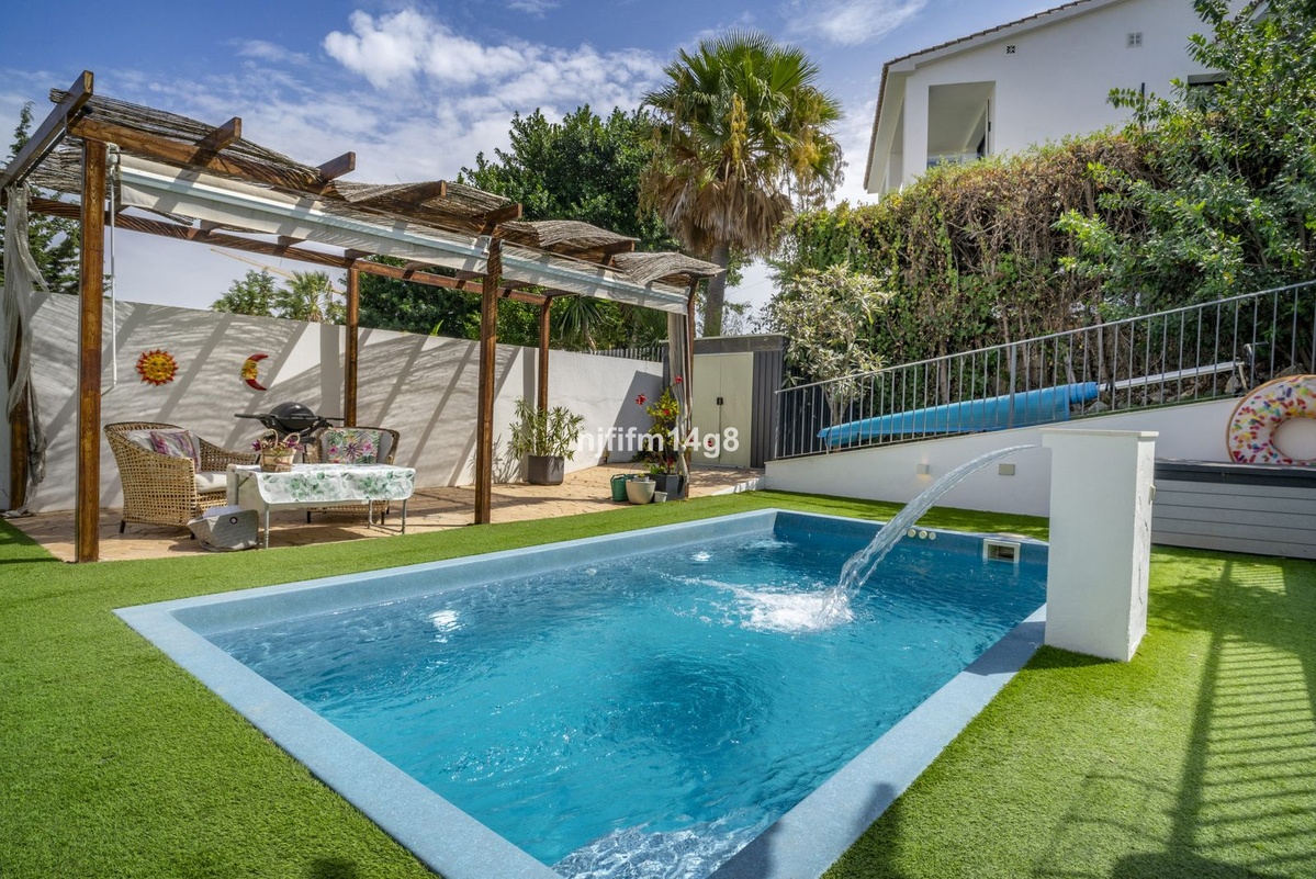 Set on a generous 426 m² plot with fruit trees, a private swimming pool, and a cozy chill-out area, this home is designed for enjoying Marbella’s outdoor lifestyle with family and friends. The 138 m² villa is distributed across two levels. The ground floor features a spacious open-plan kitchen connected to a bright living and dining room, a full bathroom, and two comfortable bedrooms.