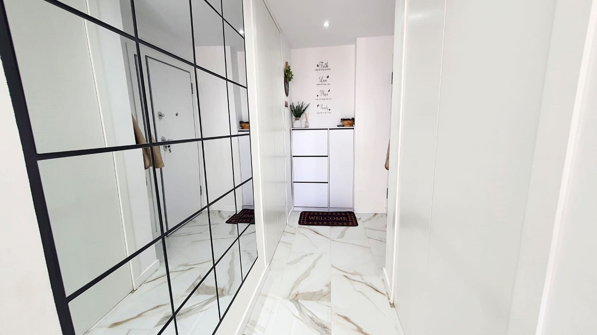 The apartment features a generous living and dining area with access to a sunny terrace, and a stylish open-plan kitchen with a separate utility room. The hallway includes built-in storage, adding to the functionality of the space. There are three bedrooms and two beautifully finished bathrooms, one of them en suite.
