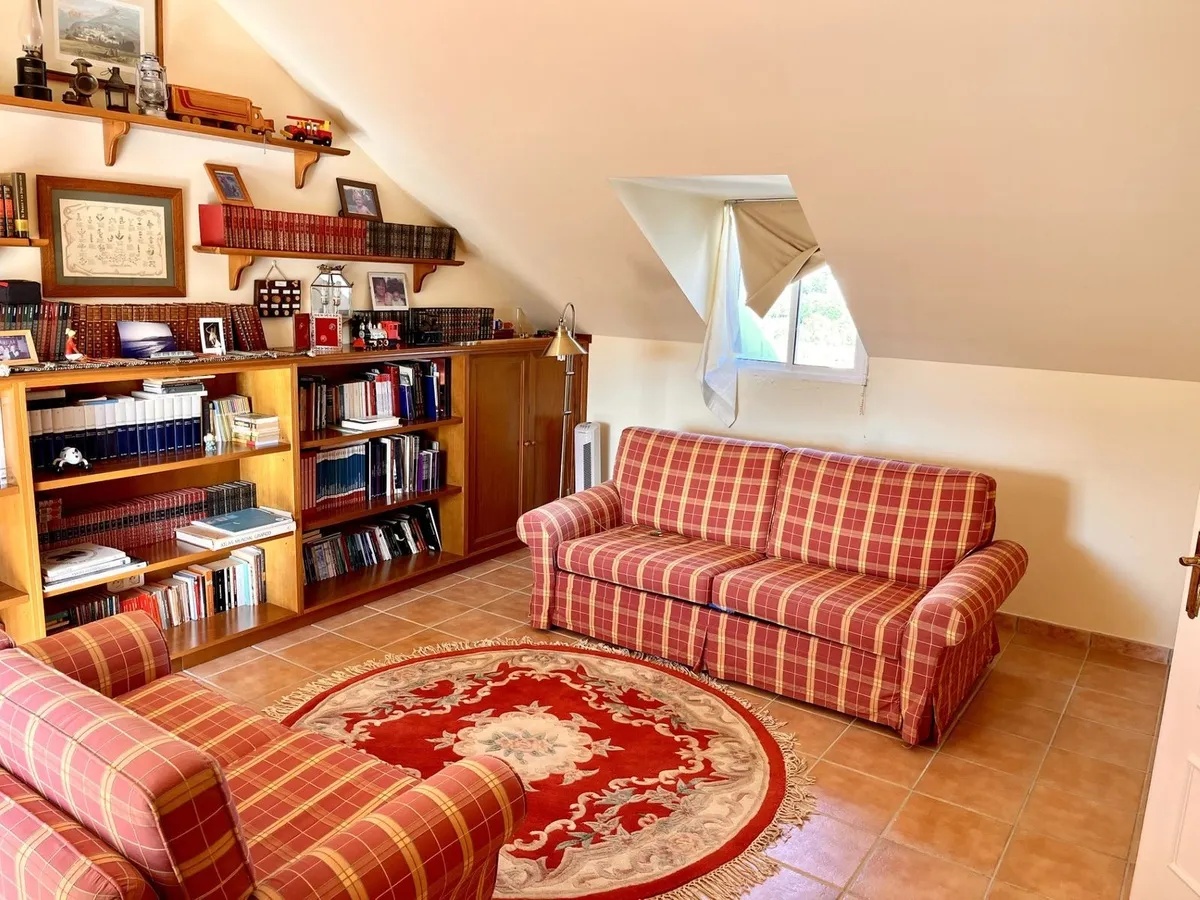 The residence is set within a gated community featuring mature communal gardens, a large swimming pool with sun loungers, and designated green areas for children’s games. The property boasts a private entrance, a carport for secure parking, and a charming porch. On the ground floor, the fully fitted kitchen with a serving hatch is complemented by 1 guest toilet and a spacious living room with a fireplace. This inviting living space connects seamlessly to a large covered terrace and a private east-facing garden, offering delightful views and a tranquil setting for outdoor relaxation.