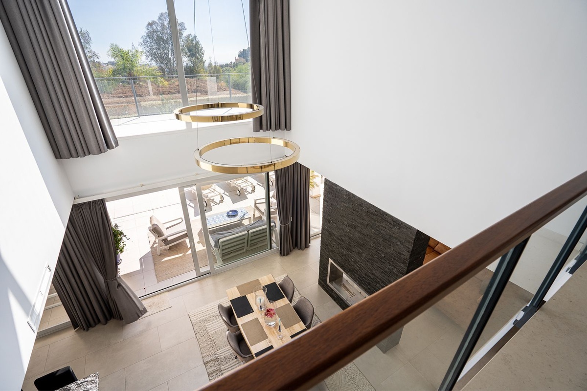 An impressive entrance hall with double-height ceilings welcomes you into the home, leading to a modern fully fitted kitchen equipped with premium appliances, a bright living area with fireplace, and a guest bedroom with an en-suite bathroom. Expansive terraces surround the entire house, seamlessly connecting indoor and outdoor living.