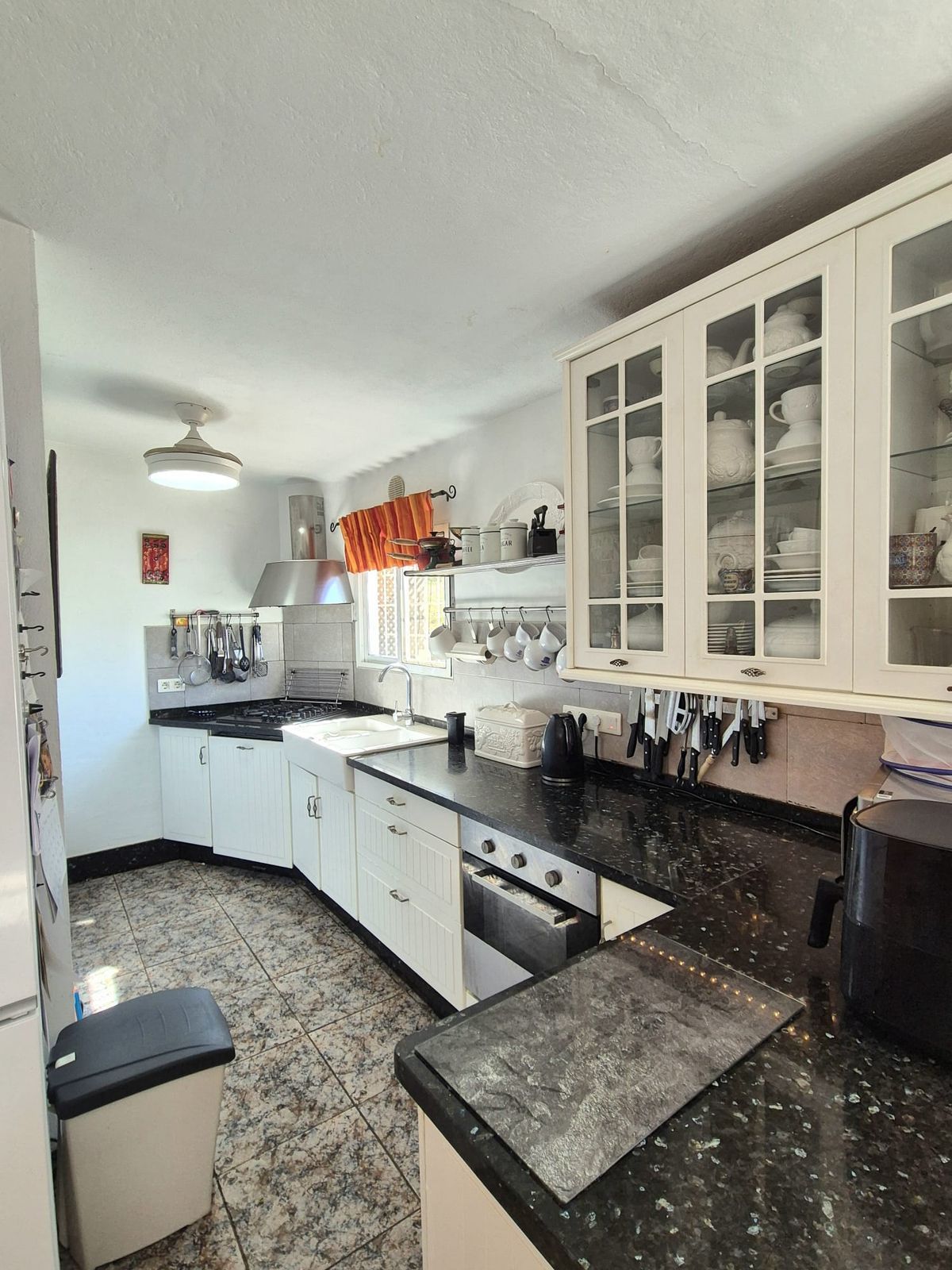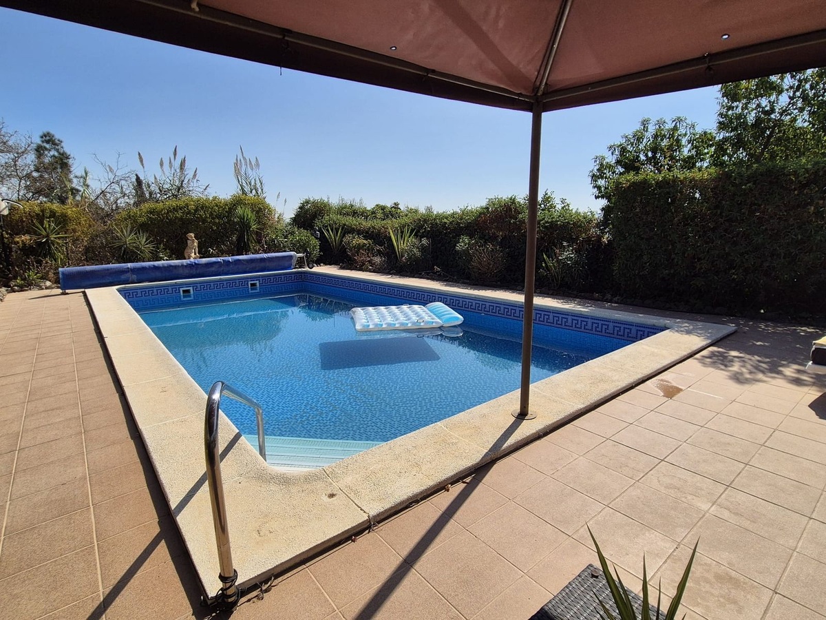 The property is located down a great tarmac road, you enter via large double gates into a large stoned area at the side of the house with plenty of parking. From here you enter the house, on the right you have a lounge with fireplace and you can access the back courtyard where you will find the laundry / pantry room. Back into the living room you have the fully fitted kitchen and a bathroom with a shower. Back into the front hallway you have to the left a double bedroom, a bathroom with a nice soaker tub, the master bedroom is straight ahead with access to the back covered terrace and pool area and to the right the 3rd bedroom also with access to the same covered terrace, the current owners are using this room as a second sitting room. There is stairs around the front that leads you up to the solarium where you have fantastic panoramic mountain views.