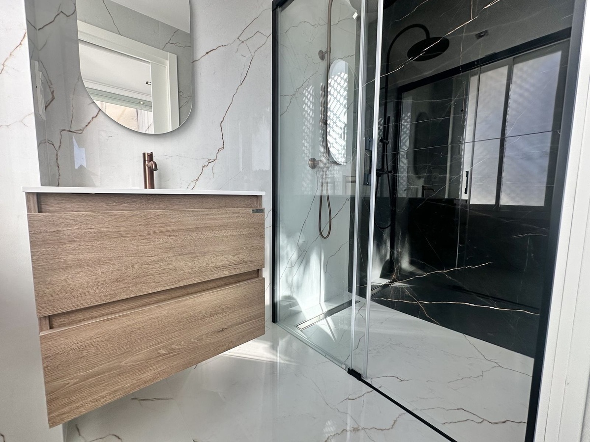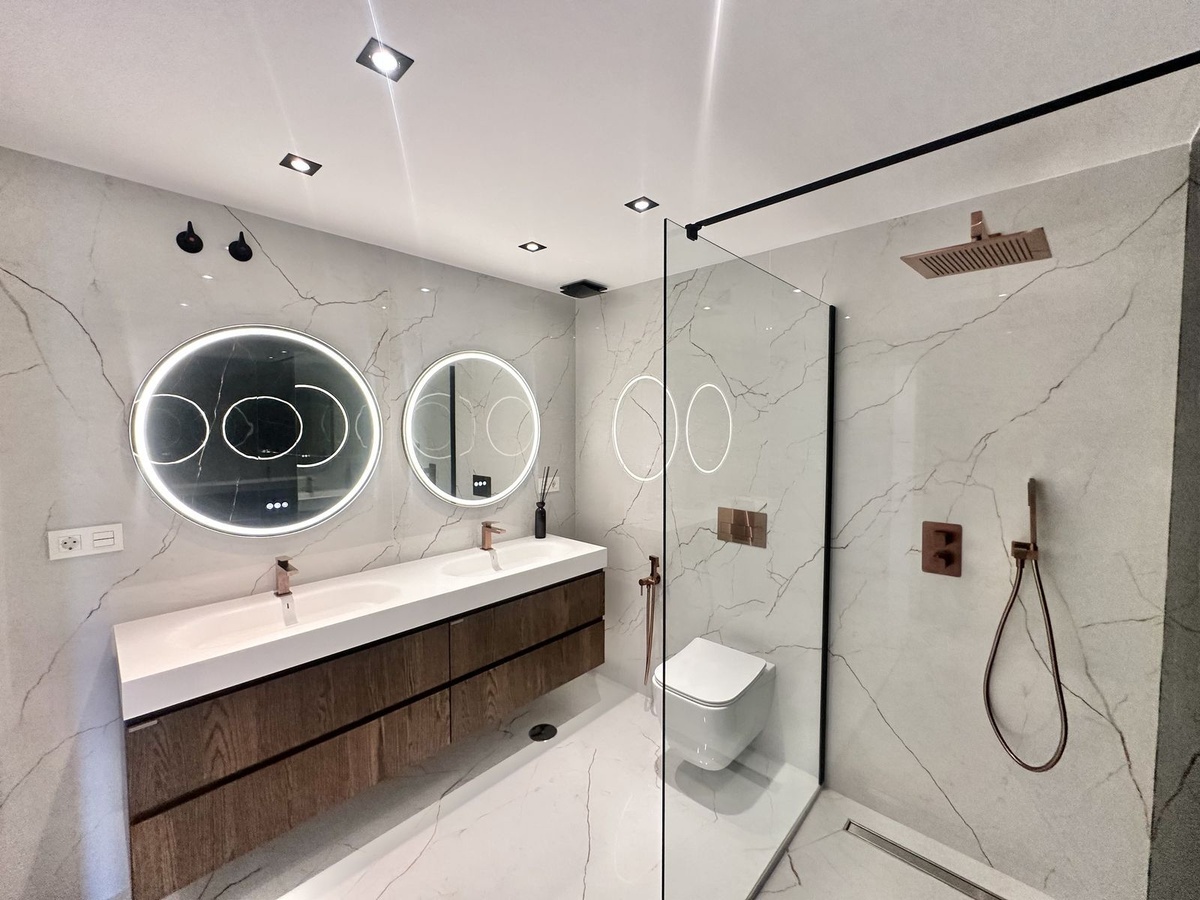 Lejligheden er færdiggjort til de højeste standarder og fremviser marmorfacader og interiørdetaljer, skræddersyet belysning og raffinerede designelementer overalt.