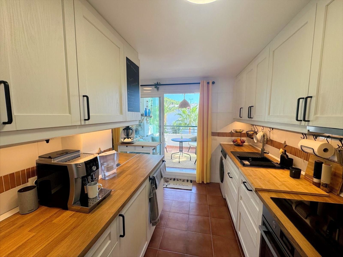 Til venstre er et nyligt renoveret, fuldt udstyret køkken med moderne indretning og en ny vandkedel.Herfra kan du gå ud på en dejlig overdækket terrasse - det perfekte sted for en morgenkaffe under den bløde sol, med udsigt over frodige grønne områder og fairways i Alhaurín Golf.Beskyttet mod eftermiddagsvarmen er det også et indbydende tilflugtssted til sommerafslapning.
