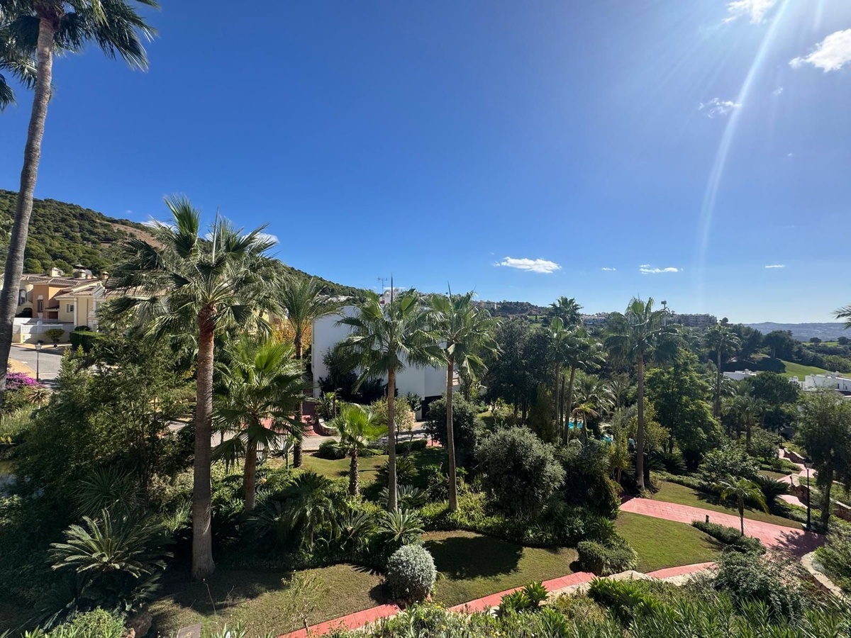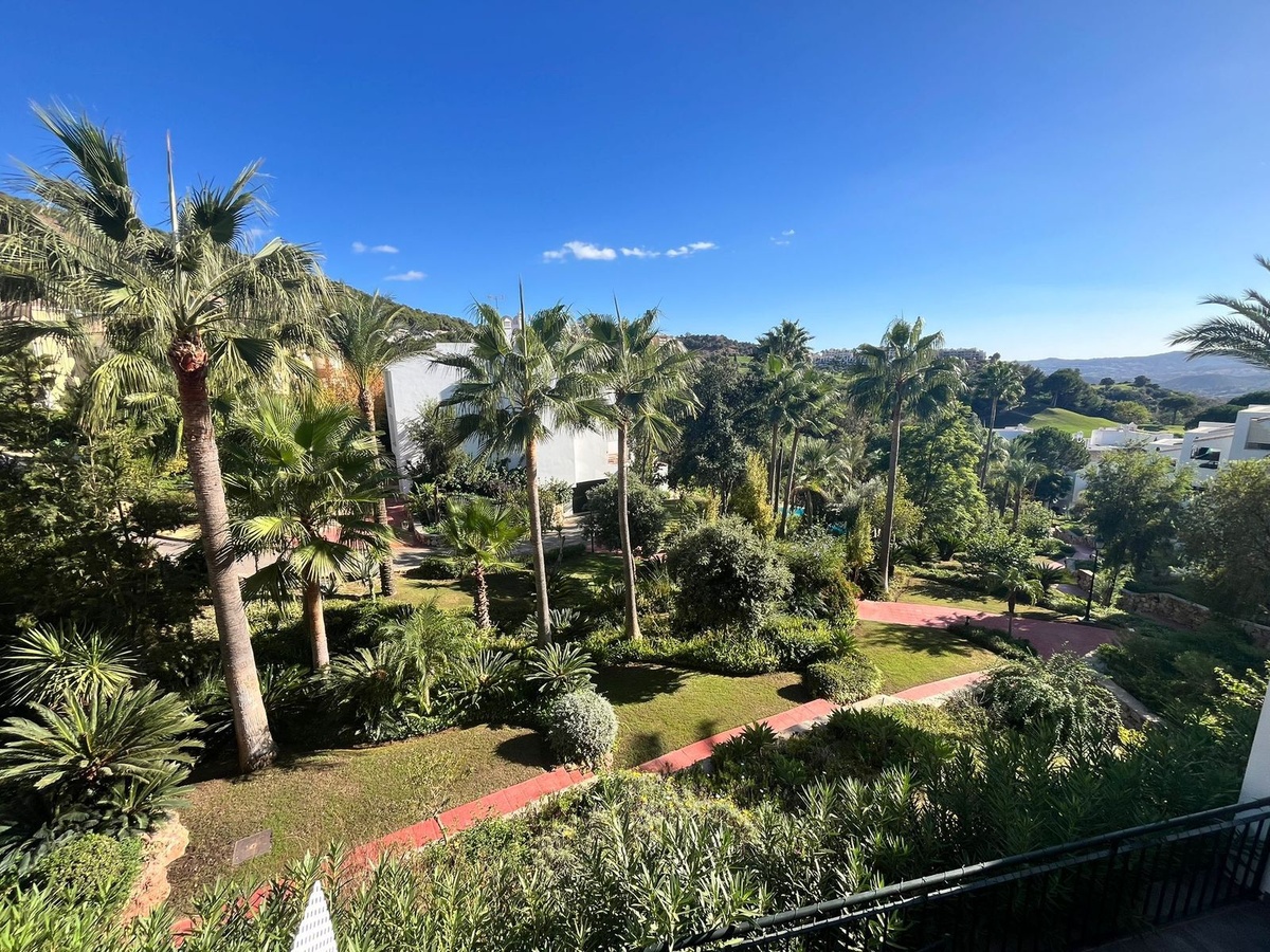 Denne smukt vedligeholdte lejlighed på første sal har en charmerende udsigt over modne tropiske haver, Alhaurín Golf og den maleriske bjergskråning bagved.Den er tilgængelig via både trapper og elevator og byder dig velkommen med en rummelig entré, der sætter tonen for boligens gennemtænkte og komfortable indretning.