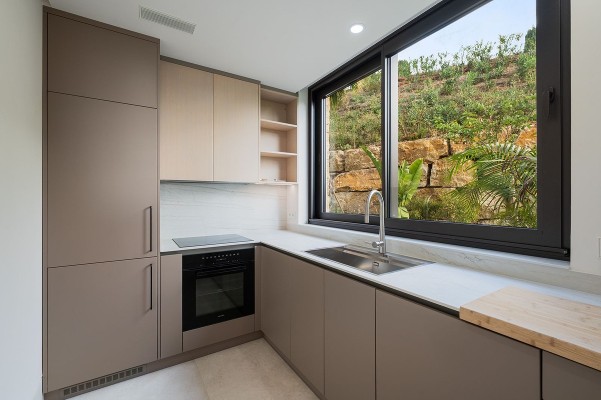 Køkkenet er både stilfuldt og funktionelt, med rene linjer, avancerede apparater og en vinkøler - et ideelt sted til daglig madlavning eller værtsby for gæster.