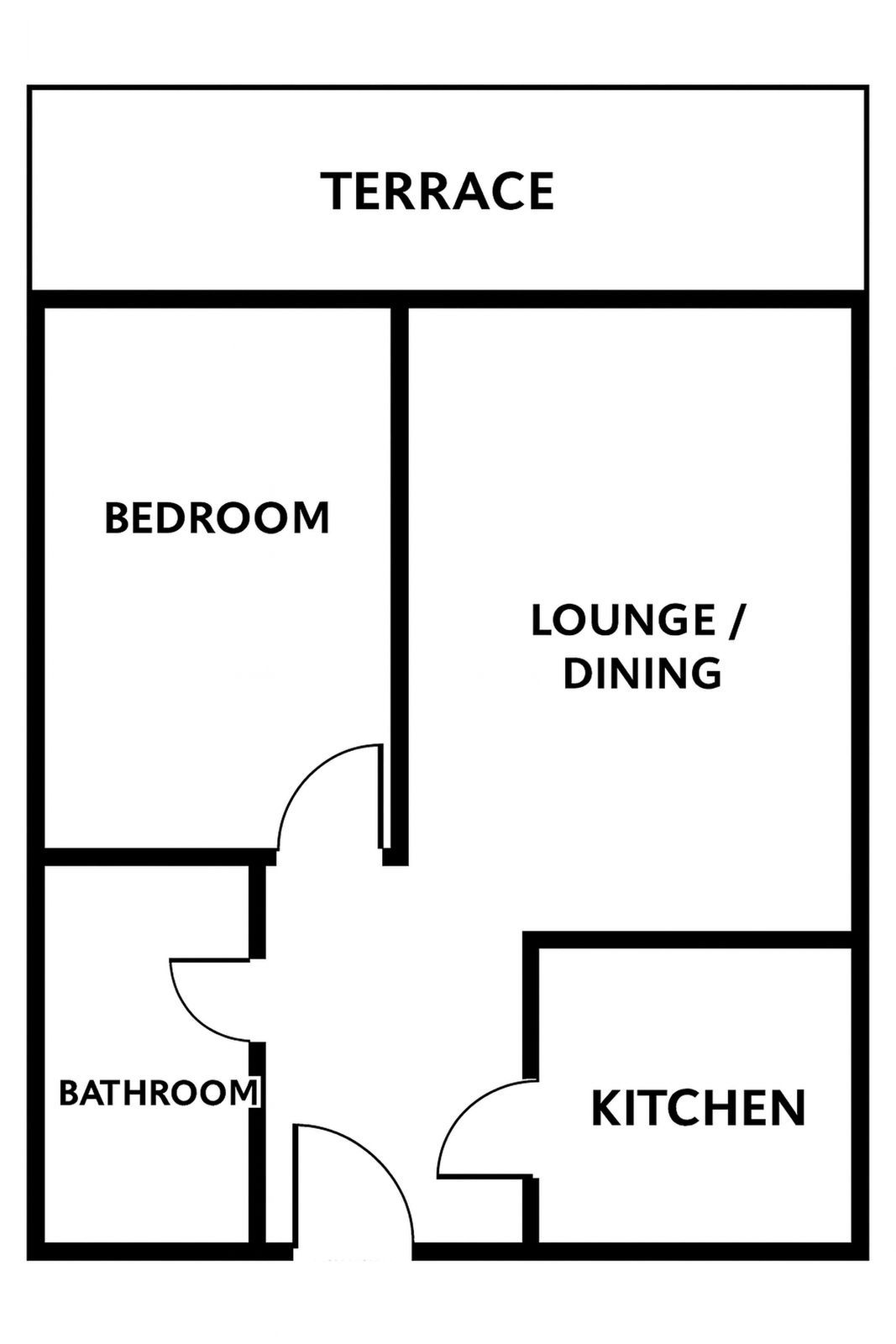 Soveværelset er rummeligt og har en indbygget garderobe til praktisk opbevaring, mens badeværelset har et badekar med bruser, der kombinerer komfort og funktionalitet.