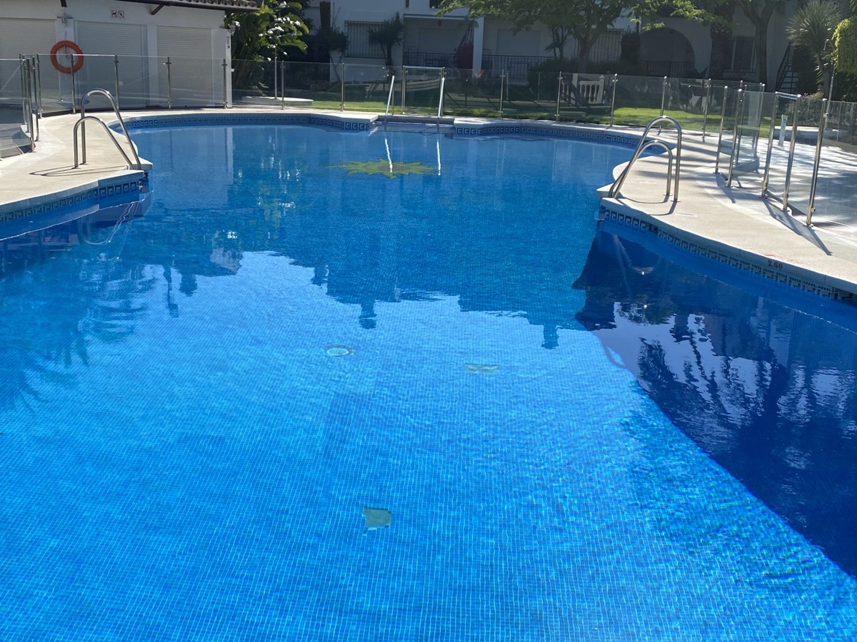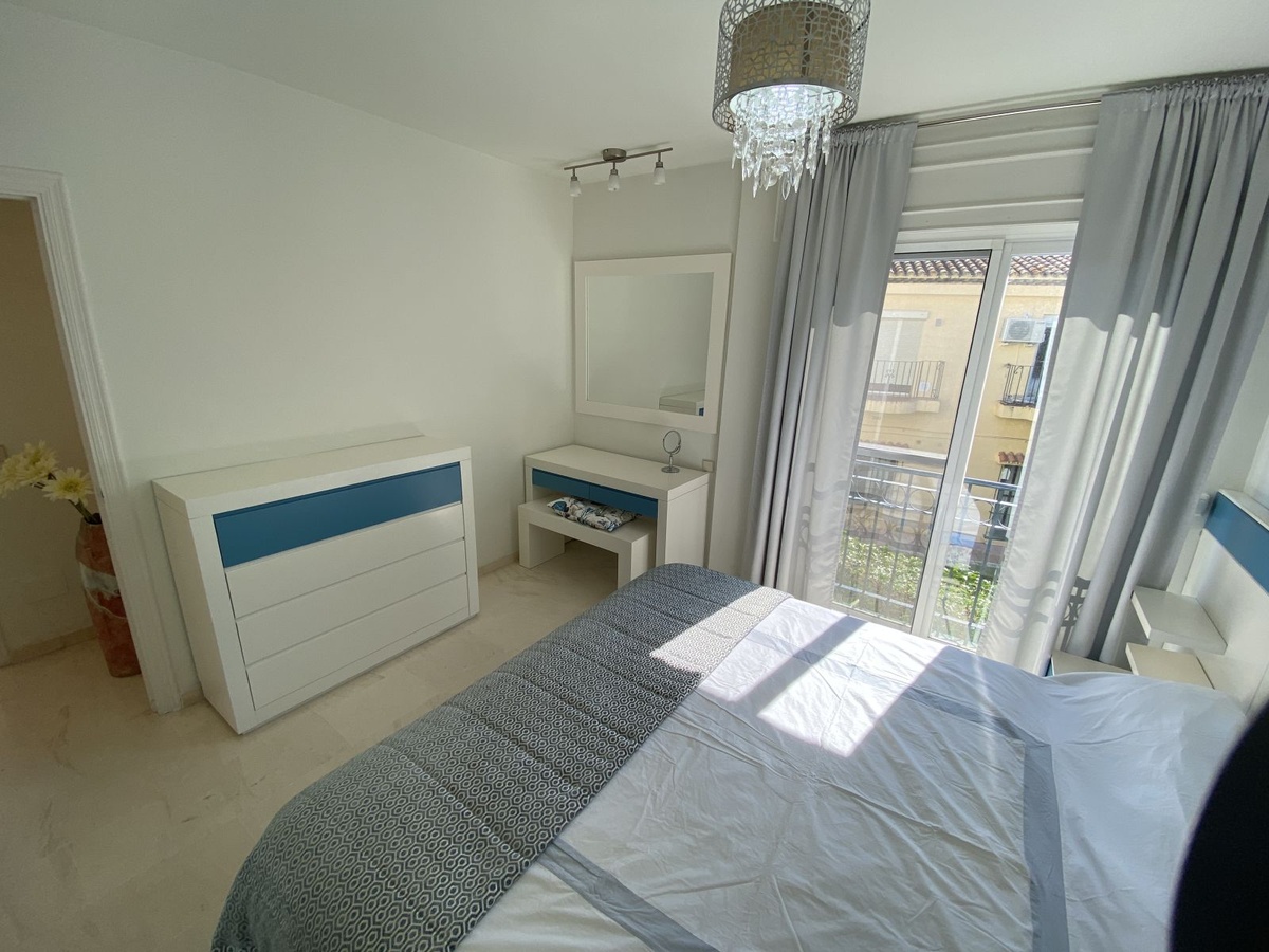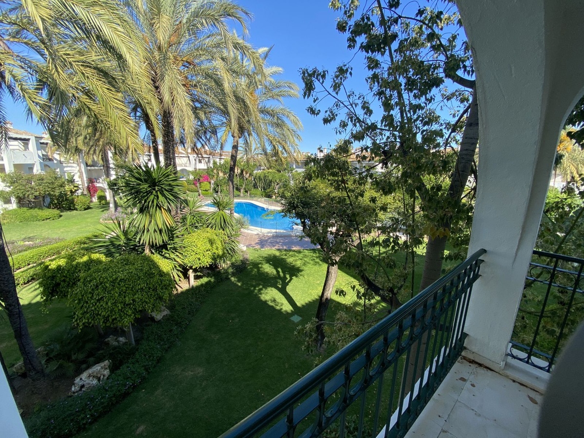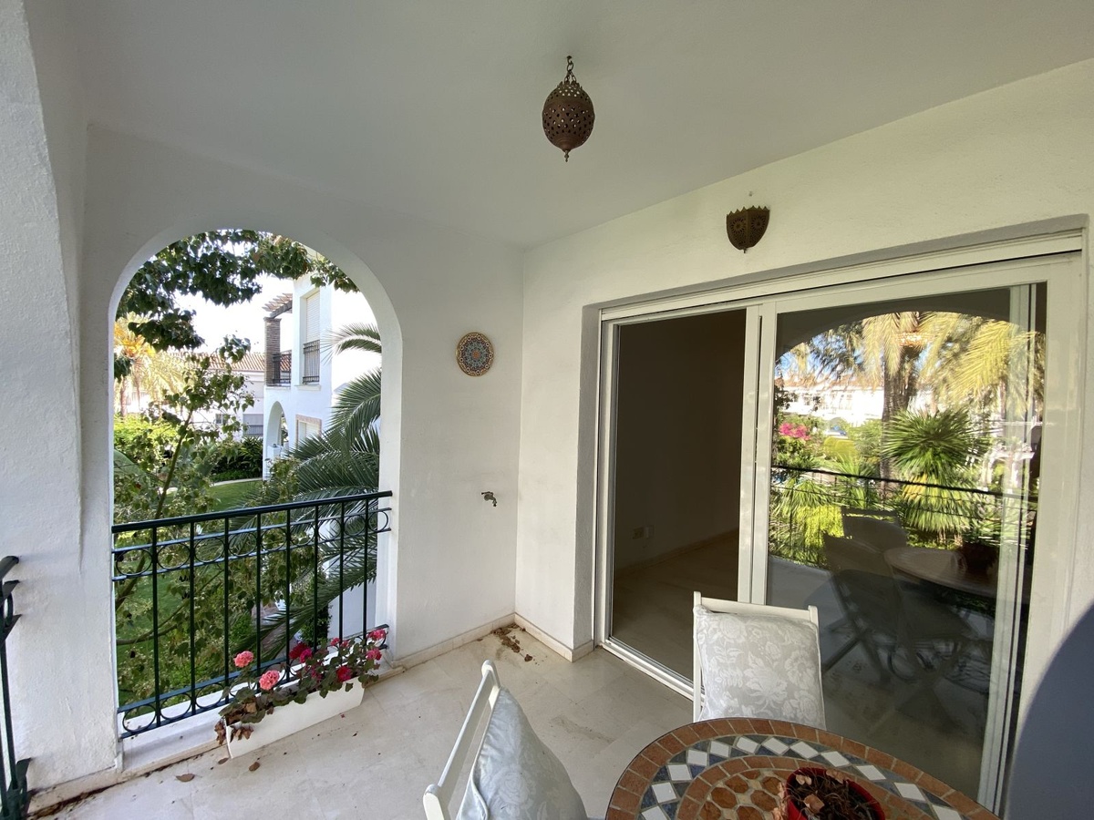 The apartment has great south facing views over the community gardens and swimming pool, cream marble flooring throughout, a large fully fitted bathroom, two good sized bedrooms with newly fitted wardrobes, and a new air conditioning system.