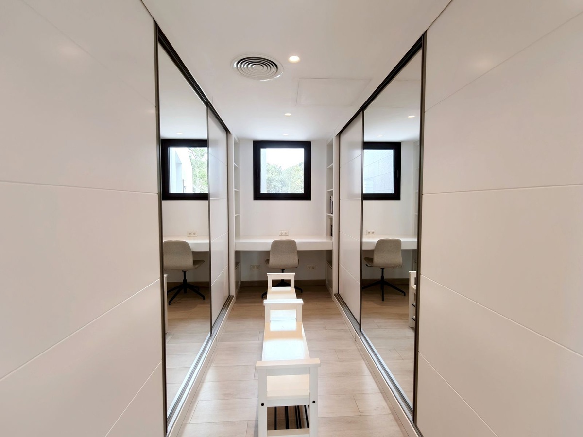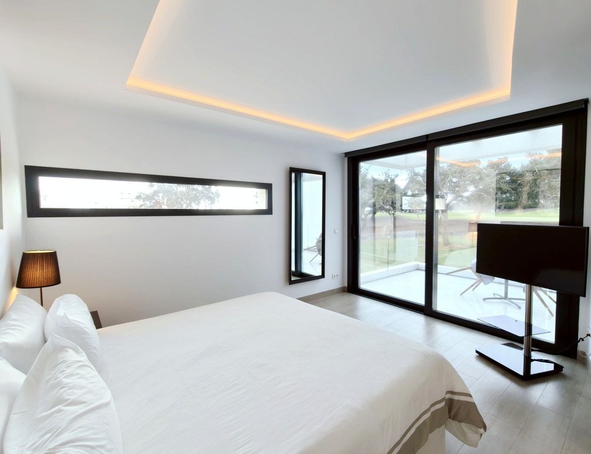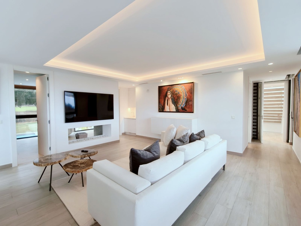The property offers multiple terraces that capture panoramic golf views, a beautifully landscaped garden with a heated private pool, and a stylish pergola providing parking for two cars. Inside, the spacious master suite features a private lounge area, an elegant bathroom with both bath and walk-in shower, and a dressing room. Expansive floor-to-ceiling windows flood the interiors with natural light, creating a seamless connection between indoor and outdoor living spaces.