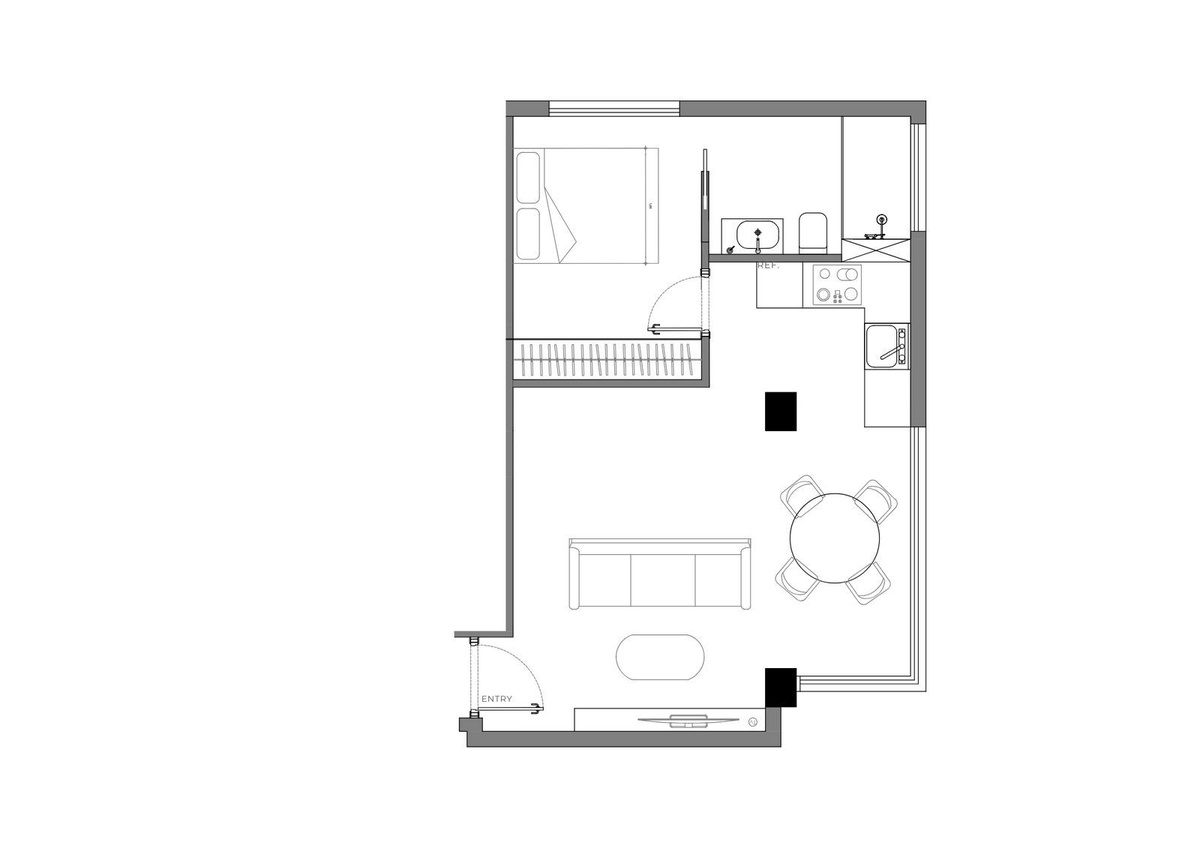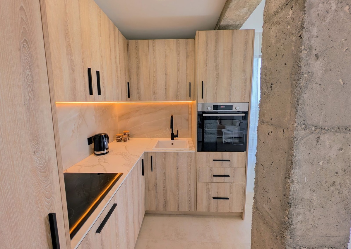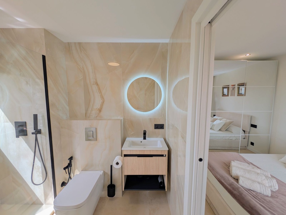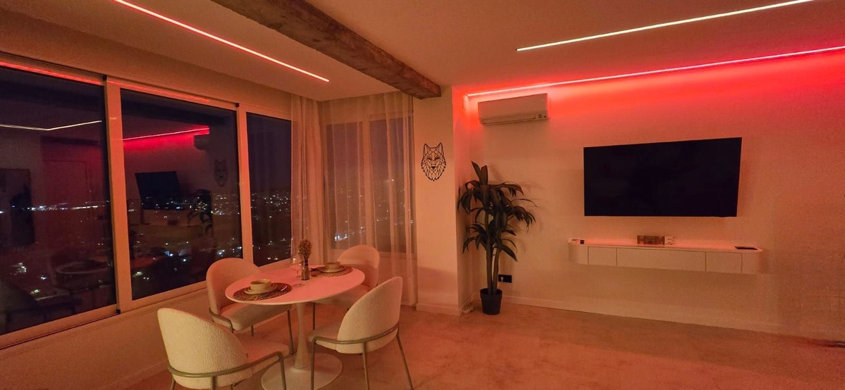 Lejligheden har en åben planløsning, der er designet til at maksimere plads og naturligt lys, suppleret med finish i høj kvalitet og klimakontrol med gulvvarme overalt. Vinduer med tredobbelt glas sikrer fremragende isolering og lydisolering (angivet som termoruder i funktioner på grund af platformsbegrænsninger).